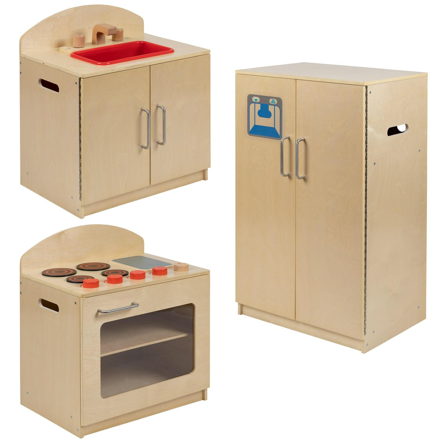 The wooden pretend play stove has 5 on/off rotating plastic knobs that click, a simulated grill and pretend oven with a window. The play sink has a pretend wash basin, rotating knobs and a make-believe faucet. The wooden pretend play refrigerator has an ice maker and water dispenser graphic. All 3 pieces of this pretend kitchen set have interior shelving for storage.