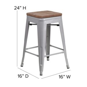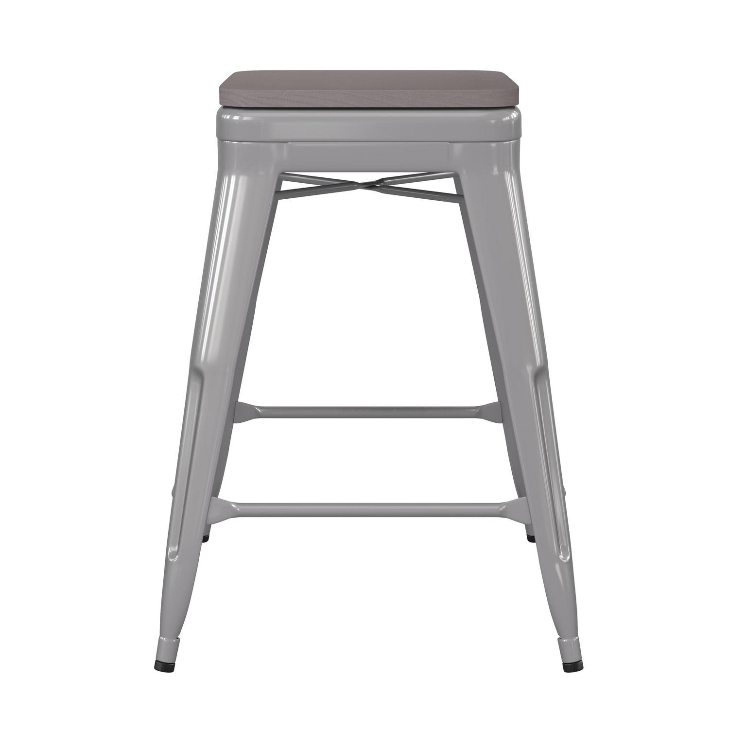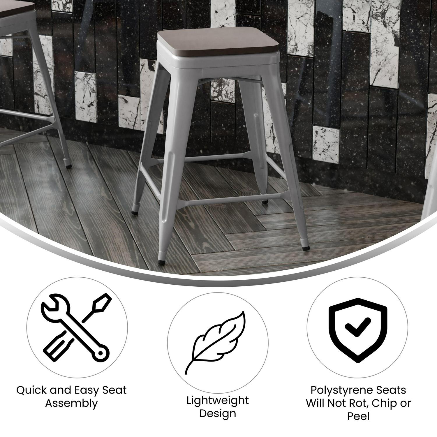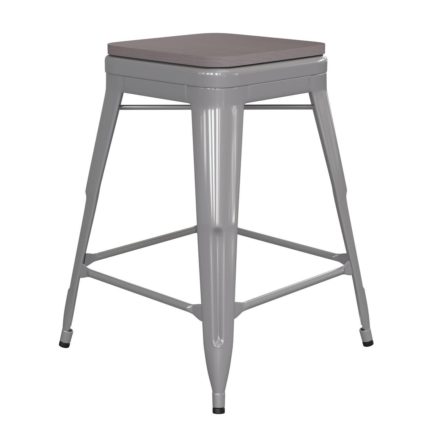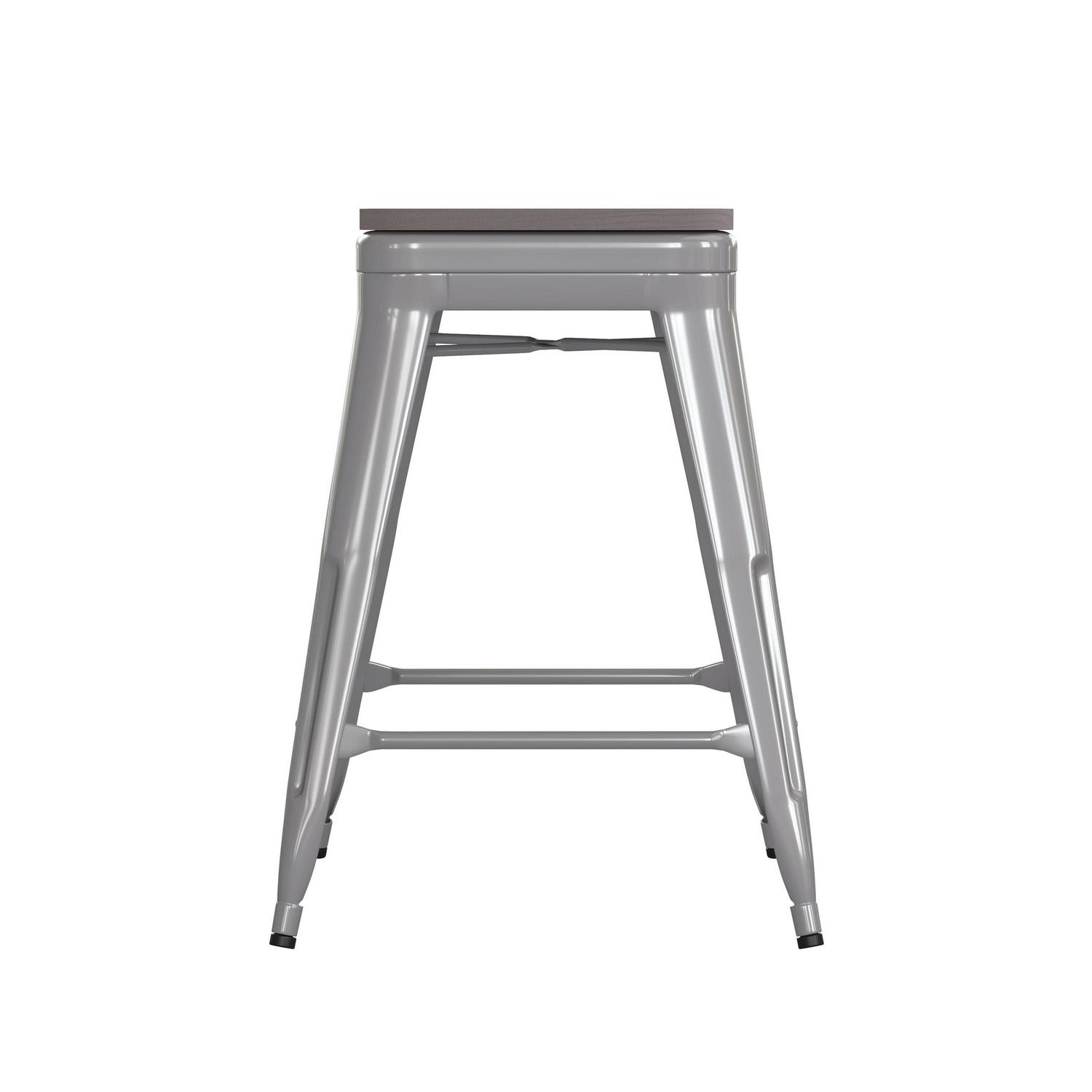 Flash Furniture Kai Commercial Grade 24 High Backless Silver Metal Indoor-Outdoor Counter Height Stool with Gray Poly Resin Wood Seat