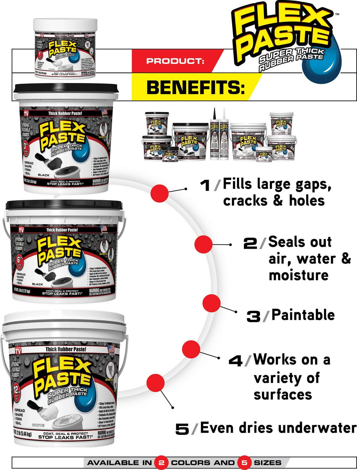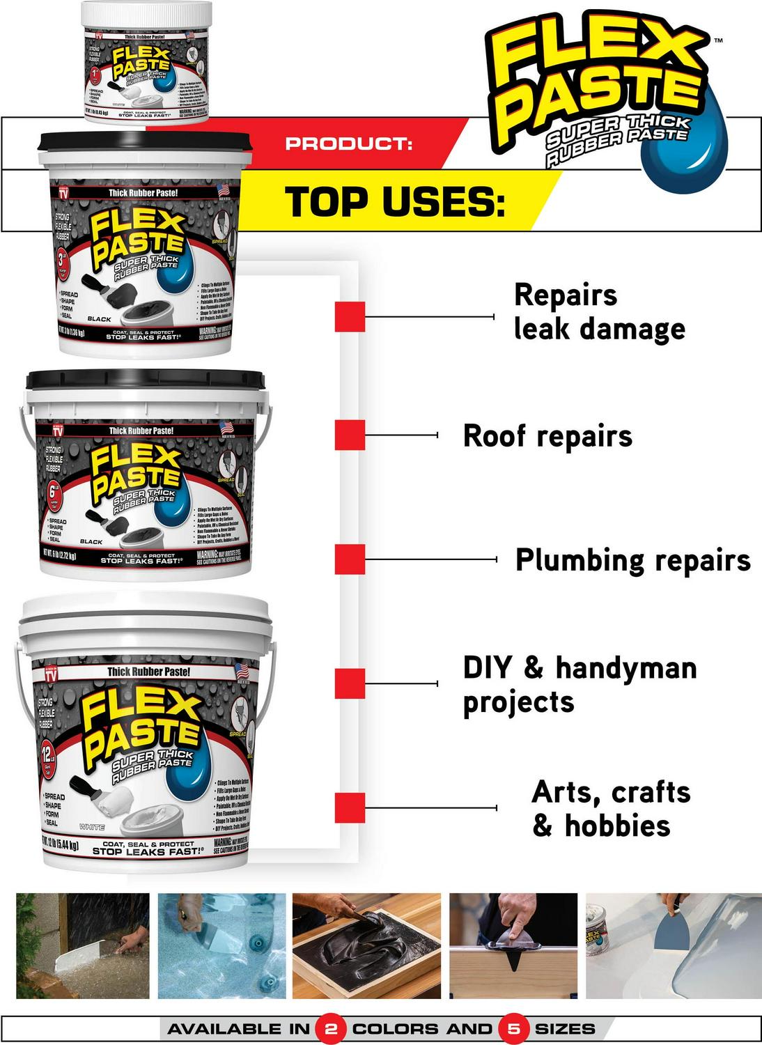 Flex Paste is perfect for DIY, Handyman projects, arts & crafts, hobbies and so much more! Use it to repair your roof, winterize your home, plumbing repairs, to seal cracks, automotive or marine repairs, pool and spa repairs, and so much more. One pound of Flex Paste provides about 10 linear ft at 2 inches wide with a layer thickness of approx. 1/16th inch. Flex Paste can be used on windows, doors, vents, thresholds and so much more. It will create a watertight barrier that seals out air and moisture. Use Flex Paste to help prevent flood damage. It can even be used to fill large voids to help keep insects and rodents out of your home. Unlike spackle or joint compound, Flex Paste dries to a waterproof, flexible rubber. Therefore, sanding may not be the best option once Flex Paste has cured. Instead of sanding we recommend using a putty knife, trowel or similar tool to smooth over the surface of the Flex Paste to your desired finish. You can even add designs and patterns to Flex Paste to create your own unique artistic textures. Flex Paste can be applied on dry or wet surfaces and even underwater. It won t dissolve or wash away and even dries underwater. For best results apply a generous amount to the surface using firm pressure. This will help push the water out and allow better contact to the surface during application. Etching the surface may help with adhesion on both wet and dry surfaces.