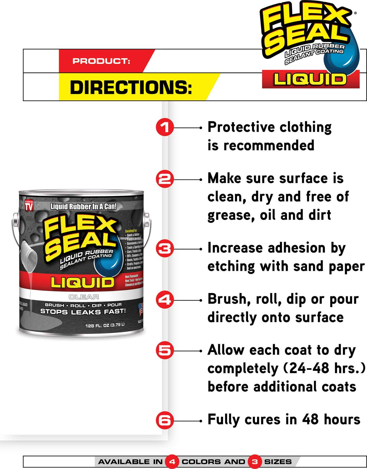 – Flex Seal Liquid is liquid rubber in a can. Now you can brush, roll, dip or pour it on