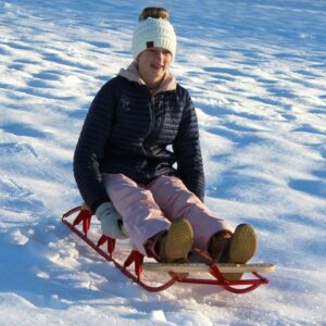 Enjoy a toboggan ride or winter sledding with the Flexible Flyer sled in vibrant red. This metal and wood sled is an exceptional blend of tradition and innovation. This sled, designed for both kids and adults, is a timeless piece that fuses the classic wooden sled aesthetic with modern, flexible metal runner technology. The sled is suitable for kid’s snow sleds, adult snow sleds, beach sleds and even hunting sled drags. This 60-inch sled provides ample space for a single adult or two kids to ride comfortably. It is spacious for adults to ride but lightweight enough for kids to drag up the hill. This sled is made with smooth birch wood that offers a classic feel, maintaining the nostalgic essence of traditional sleighs and sleds, and powder-coated steel runners designed to offer a smooth and fast sled experience over snow. These runners are designed to flex, providing excellent control and making it a great sled for kids, adults, or even for use as a deer dragging sled. The sled is also suitable for hunting as a beach, sand, or game sled. Its double kid sled capacity makes it perfect for family fun in the winter, and its long length makes it a great utility sled. Its durable construction ensures it can handle hauling tasks, making it a useful plastic sled for hauling. Whether you’re looking for a fast sled for thrilling downhill rides, a knee sled for a unique sledding experience, or a toboggan sled, this flexible flyer sled has it all. This sled is not just a winter companion but a versatile tool. It can function as a duck hunting sled, a deer sled, or even a jet sled for those adventurous souls. From toddler sleds to wooden sleds for crafts, this sled covers it all. The Flexible Flyer steel and wood sled is a versatile, durable, and classic style sled. It offers a unique blend of the old and the new, ensuring a thrilling and unforgettable sledding experience.