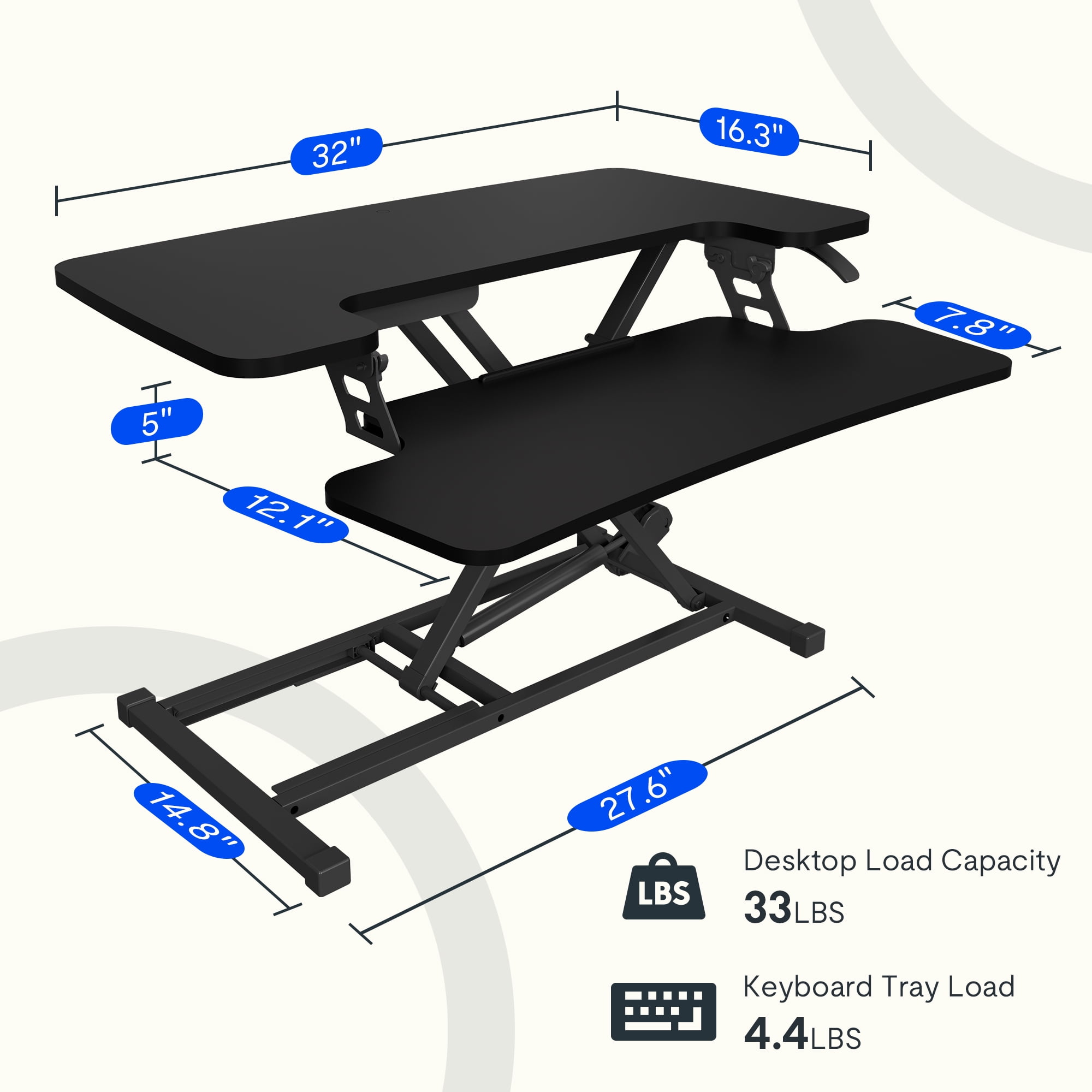 31.5″x 16.3″ U-Shape Desktop 28.4″ x 12.1″ Removable Keyboard Tray 33 lbs+4.4lbs Weight Capacity 4.7″ – 19.7″ Stepless Height Adjustment Range Simple Handle Adjustement Control High-powered Gas Springs Protective Rubber Pads