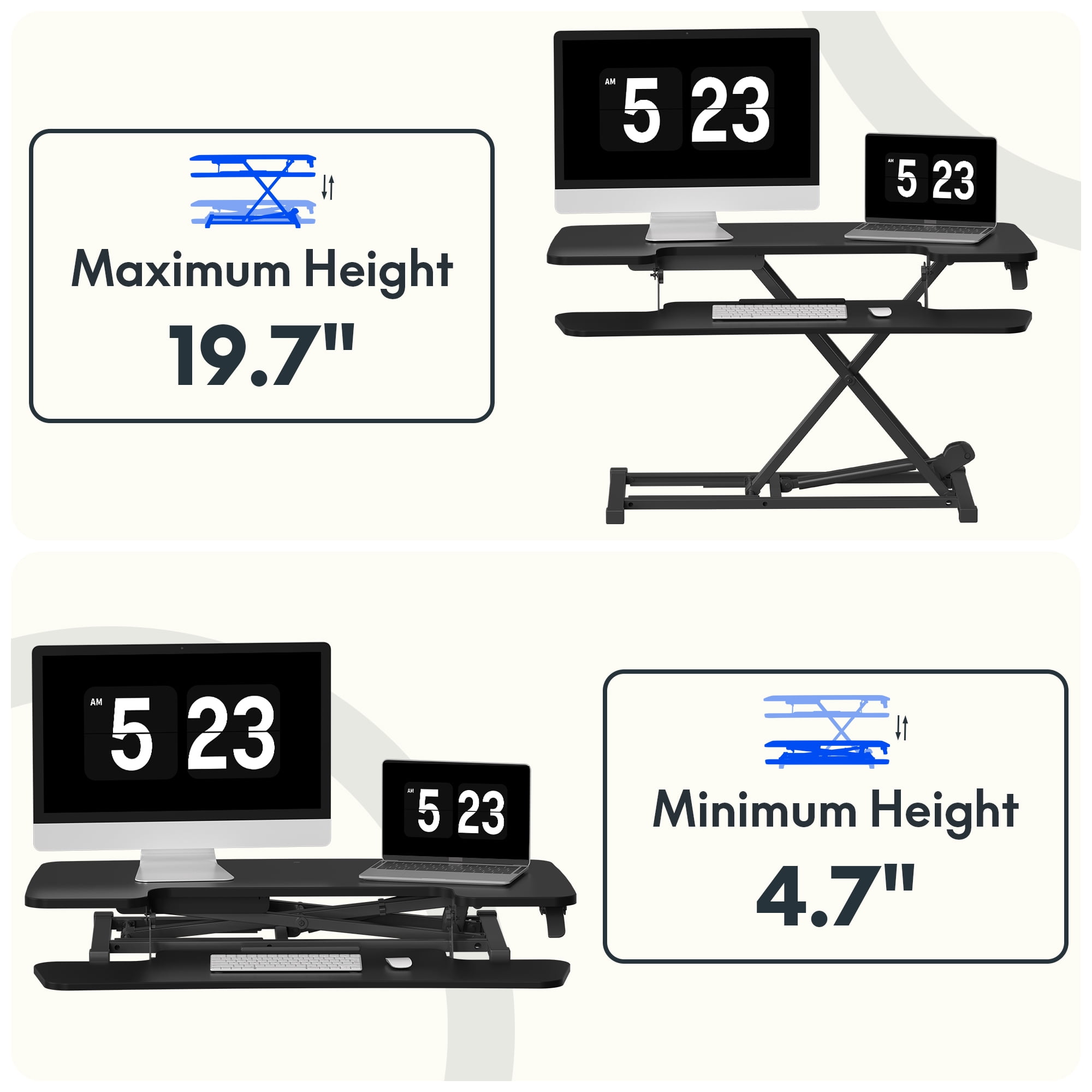 Elevate your at-home productivity with this standing desk riser that features a two-tier design and personalized height adjustments. Transform your traditional desk into an active sit-stand workstation with this desk riser. This unique standing desk converter sets itself apart from other desk risers with a one-of-a-kind, u-shaped design that expands the keyboard workspace so you have more room to get things done. It’s great for writing, drawing, comfortable laptop use, or for adding a full-sized keyboard and mouse. Main Highlights: Single Handle Adjustment: Adjust the desk height to a level that perfectly suits you with single handle. Quick-Release, Removable Keyboard Tray: Easy one-step attachment and release gives you the option to use the desk riser with or without the keyboard tray. A wide U-shaped desktop cutout over the keyboard tray enables easy use with a 17″ laptop. High-Quality Construction: A heavy duty steel frame combined with top-quality gas springs and an environmentally-friendly MDF work surface enable smooth, even adjustment and a total weight capacity of 37.4 lbs. Protect Your Desk: Both the base frame and keyboard tray are outfitted with protective rubber pads for safety, comfort, and protection. Integrated Air Technology: Smart “X” Lift structure and gas spring hovering system provide smooth and even support. Safe, Straight Up-Down Operation: High-powered gas springs offer smooth & stable straight up-down operation, with a specially engineered bracing system that increases safety by preventing rapid falls, even while under full load. Specifications: Desktop Dimensions: 31.5″x 16.3″ Keyboard Tray Dimesions: 28.4″ x 12.1″ Height Adjustment Range: 4.7″ – 19.7″ Weight Capacity: 33lbs(Desktop), 4.4lbs(Keyboard Tray) Materials: Particle Board, Steel Color: Black Desktop and Black Base
