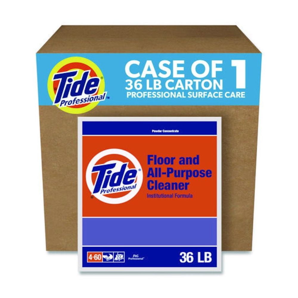 Tide all purpose floor cleaner is An economical and versatile cleaning solution that removes tough grease and lifts away tracked-in dirt. This multi surface cleaner can be used with chlorine bleach and works great in all areas of the kitchen. It can be used on floors, walls, pots and pans, quarry tiles and other Unwaxed floors, exhaust filter screens and hoods, cooler ceilings, walls and racks, mop heads, and outside areas, like concrete and dumpsters. It is formulated for industrial use. Package Includes: One 36-lb. box