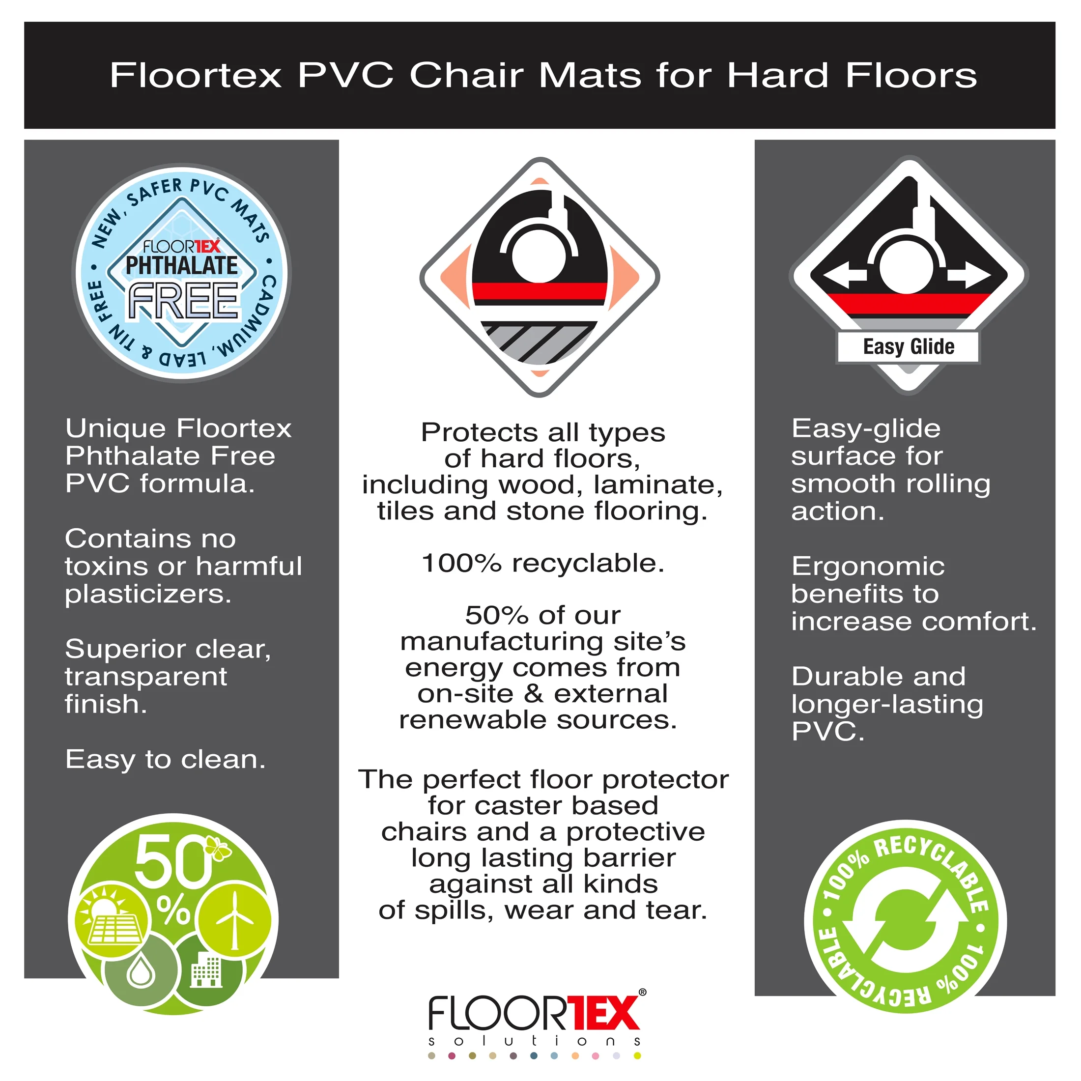 Cleartex Advantagemat chair mats provides a high quality and durable solution for floor protection and ergonomics. Protects your hard floor surfaces from office chair casters, general wear, scuffs and spills. Will not crack, chip, break or shatter under normal use and correct application. Free of phthalates, tin, lead, cadmium and BPA for peace of mind when used around children or pets. Eco-friendly manufacturing with 50% of our manufacturing site’s energy coming from on-site and external renewable sources. Contains up to 25% recycled content. 100% recyclable.