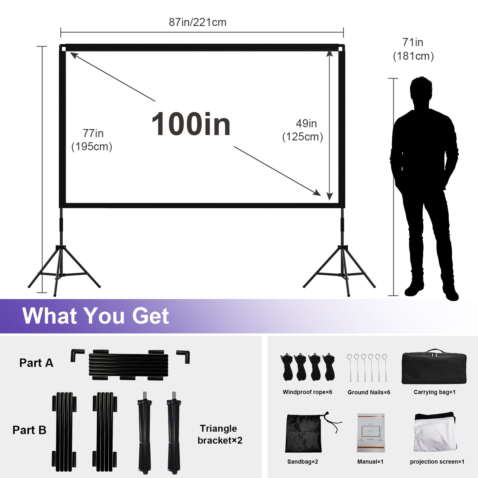 Feature 【Wide-angle Screen】This 4K HD movie screen has a 160° viewing angle, 16:9 screen format, and a 100 inch diagonal, which provides a viewing area of 221 x 125 cm/87 inches x 49 inches. The large wide-angle tv projector screen means that more people can watch together while still getting an excellent viewing experience. 【HD Wrinkle-free】The projector screen is made of polyester milk silk, which will not wrinkle even when folded, and has a smooth surface, and the thicker movie screen can enhance the image reproduction effect. This portable projector screen adopts a double-sided design, which can be viewed both front and back, providing you with an excellent video viewing experience with ultra-high-definition resolution. 【Sturdy and Stable】The portable projector screen with stand is very durable and lightweight. The outside projector screen is paired with grounding spikes, ropes and sandbags to make it sturdy enough, and the stable tripod screen is perfect for outdoor movies and picnics or hosting events or parties. 【Lightweight and Convenient】The projector portable screen weighs only 7.7 pounds and can be easily folded into the included carrying bag (7.5*15.74 inches), which is perfect for travel and camping, takes up little space, and can be easily transported to anywhere. This foldable projector screen with stand works with most projectors and is the perfect mobile projection solution for professional or personal needs. You can turn any place into a home theater or media room to enjoy movies, sporting events, photos, video games, and presentations. 【Easy to Assemble and Disassemble】Our outdoor screen projector comes with instructions, the detachable crossbar can be easily assembled without any tools, the tripod can be quickly opened and spliced together, and you can quickly set up and start using the dog in just a few steps, making it easy to quickly move locations in a short time. Specification Material: Polyester Color: White Weight (with accessories): 7.82 lb Screen diagonal: 100 inches Format: 16:9 Viewing angle: 160 ° Screen Resolution: 4K HD Screen Size: 49 ” x 87″/125 cm x 221 cm Stand Maximum: 77″/195 cm Outer box package size: 16.73 ” x 6.89 ” x 7.28″(42.5 x 17.5 x 18.5 cm) Package Content:Projector screen x 1,Tripod x 2,Pole(Part A and Part B) x n,Windproof rope x 6,ground nails x 6,sand bag x 2,Carrying bag x 1,Manual x 1 Features: Foldable and portable, wrinkle-free, opaque Suitable for: Home theater movies, education, conference room presentations, public displays, outdoor movies and picnics or hosting events or parties, etc. [After-sales Service]-If you have any problems with the movie projector screen, or missed any parts, or received the broken item in the package, please feel free to contact our after-sales team. We will give you a satisfactory answer within 24 ours!
