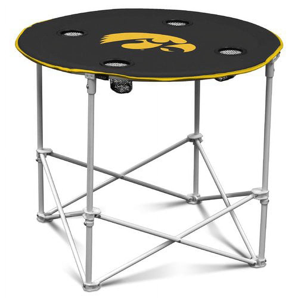 The Round Table is just what the ultimate fan needs for a truly exceptional tailgate party. Made of a powder-coated steel with cross beams, it is sturdy and can hold multiple dishes. Your favorite team’s logo is screen printed on the durable polyester 27.6″ diameter table surface, which includes four builtin mesh cup holders. This table is portable, folding up easily for storage and transport. It works great for camping, picnics, deck parties and other outdoor activities. The table height matches most Logo Brand chairs. It comes with a convenient matching carrying bag with handles and tear-away label. The table assembles in seconds.