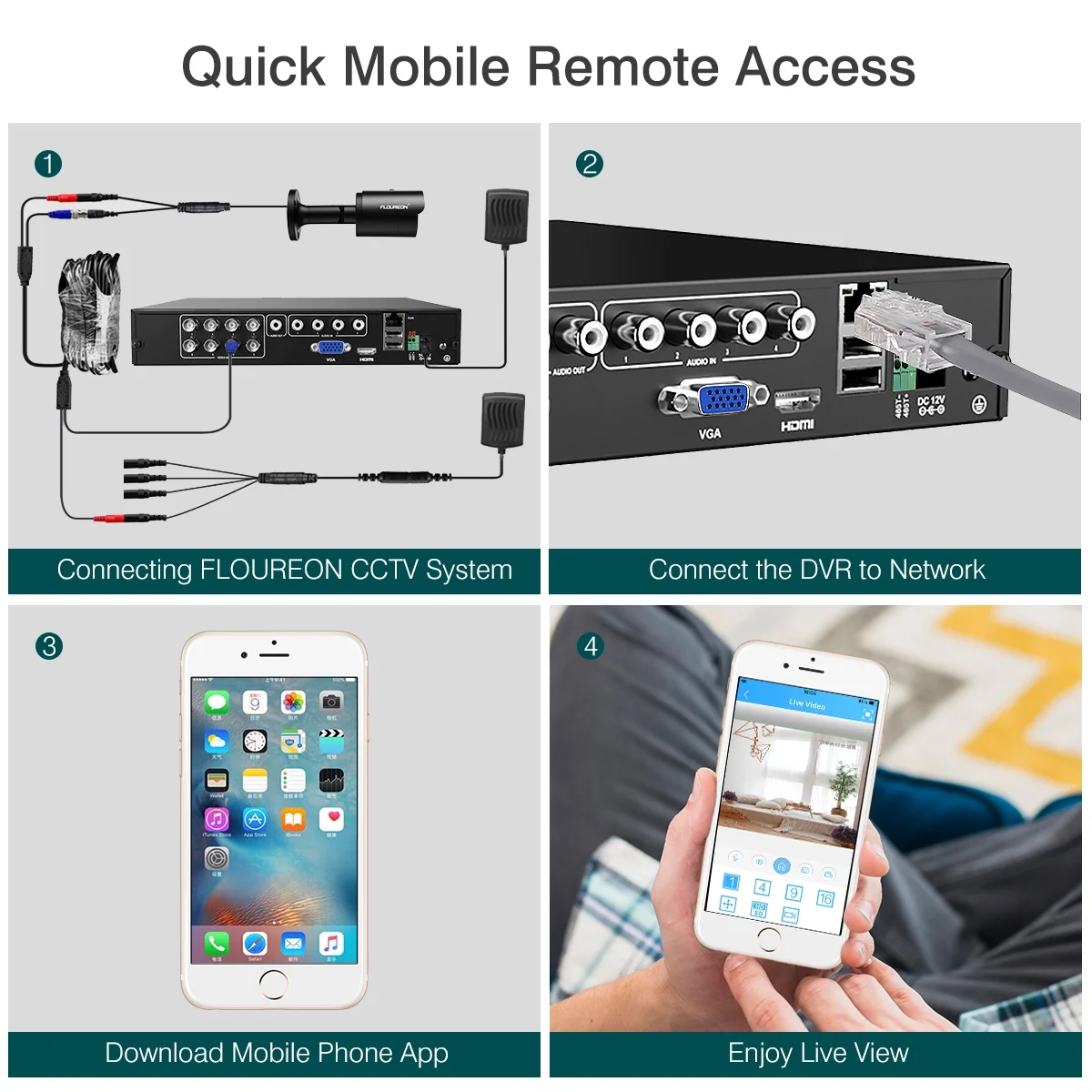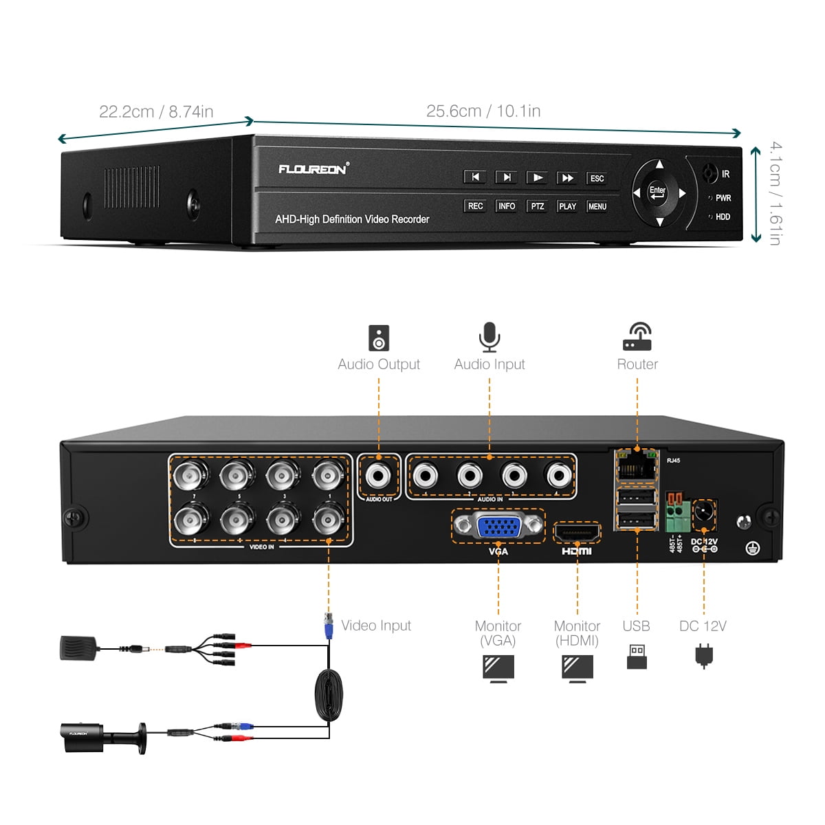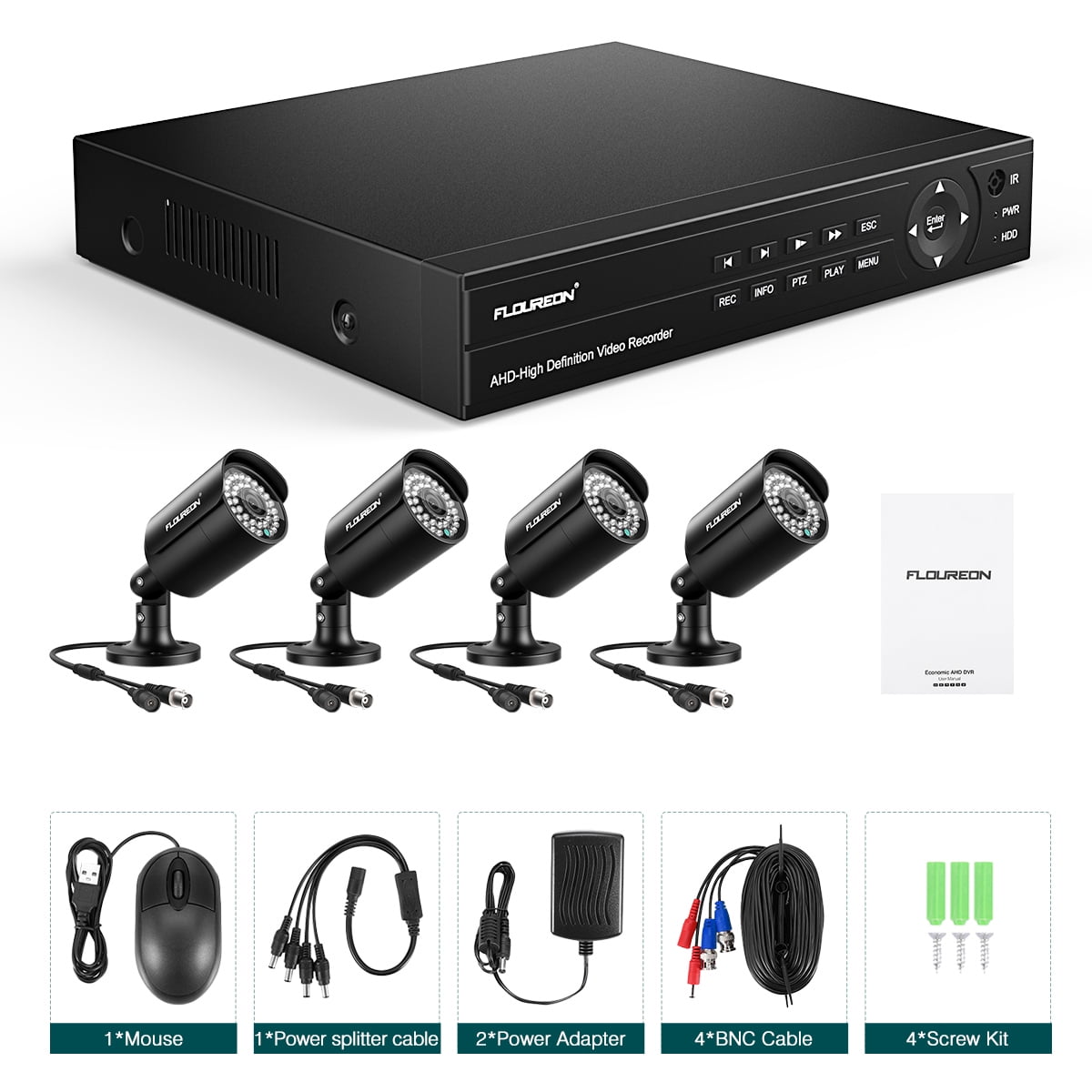 Camera Specification – Image Sensor Type: 1.0MP CMOS Lens Signal System: NTSC Resolution: 1280 720P,1500TVL Lens: 4mm Minimum Illumination: 0.1LUX/F1.2 Waterproof: IP66IR LEDs: 24 pcs LED Night Vision Distance: Up to 60FT/10m 20mS/N Ratio:>48dBIR Cut Filter:Bulit in IR Cut White Balance: Automatic Backlight Compensation:Automatic Shutter Speed: Automatic electronic shutter 1/60 1/100000 Sec Power Supply: 12V DC Material: Metal Shell Application: Outdoor/Indoor Connector: BNC,DC Operating Temperature: 20 50Chumidity Below:90%RH Package Included: 1 X 4CH 1080N 5 IN 1 HDMI CCTV AHD TVI DVR (Hard Drive Not Included) 4 X 1500TVL Waterproof IR Cut Bullet Security Cameras 4 X 60ft(18.3M) Video Power Cable for Security Cameras 1 X 1 4 Power Splitter Cable for Cameras 1 X USB Mouse For DVR 1 X Power Supply for DVR (US Plug) 1 X Power Supply for Cameras (US Plug) 1 X English Users Manual The DVR is Super dvr , support TVI/CVI/AHD/Analog/IP Camera all the same time 1500TVL resolution camera provides clear and accurate video footage both day&night IR-CUT filter provides true color image during daytime IR LEDs privide high quality B/W picture Excellent material of metal shell ensure its waterproof and vandalproof provide you a convenient and safe life PC surveillance software and mobile phone client are included, very easy remote network surveillance