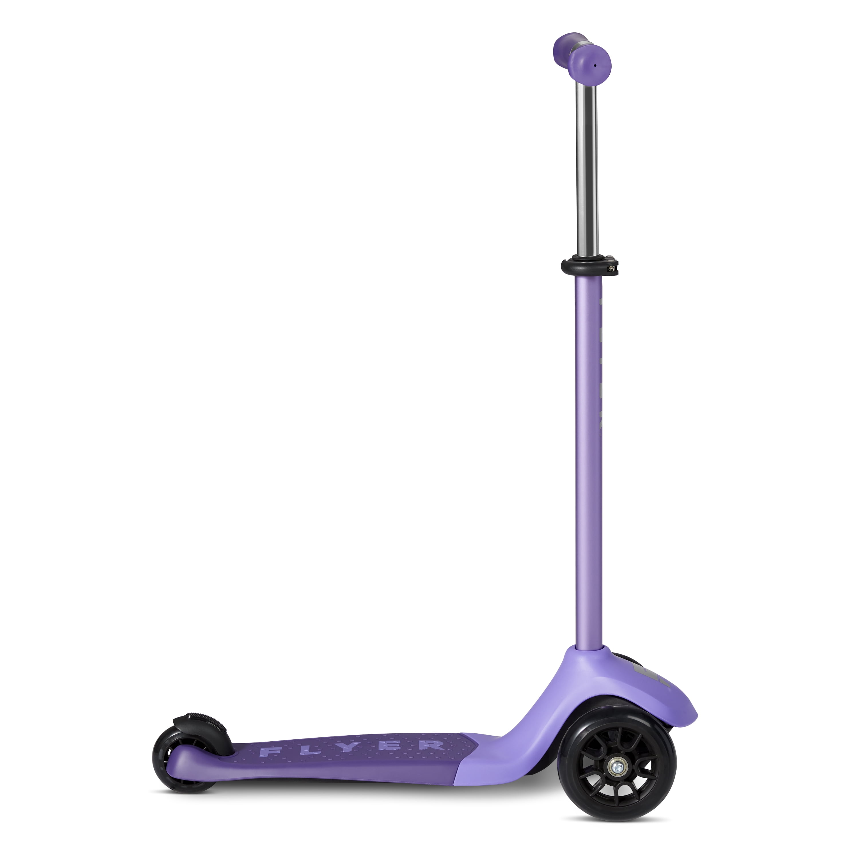 Take carving to the next level with the Flyer Glider Pro! This premium 3-wheel scooter is designed for stability and speed. The polyurethane wheels feature high-performance bearings, which offer a smooth, fast ride and propels you further with fewer kicks. The nylon clamp adjusts the handlebar to any height, ensuring years of fun. Lean-to-steer technology improves balance and makes carving & turning fun! The durable deck is flexible and absorbs shock which provides a smooth, safe ride on any sidewalk. This scooter also features a quick stopping foot brake for added control and deluxe hand grips for comfort. The Flyer Glider Pro Scooter is available in black, blue, pink, teal, and purple. Recommended for ages 6+ years. Maximum weight capacity 110 lbs.