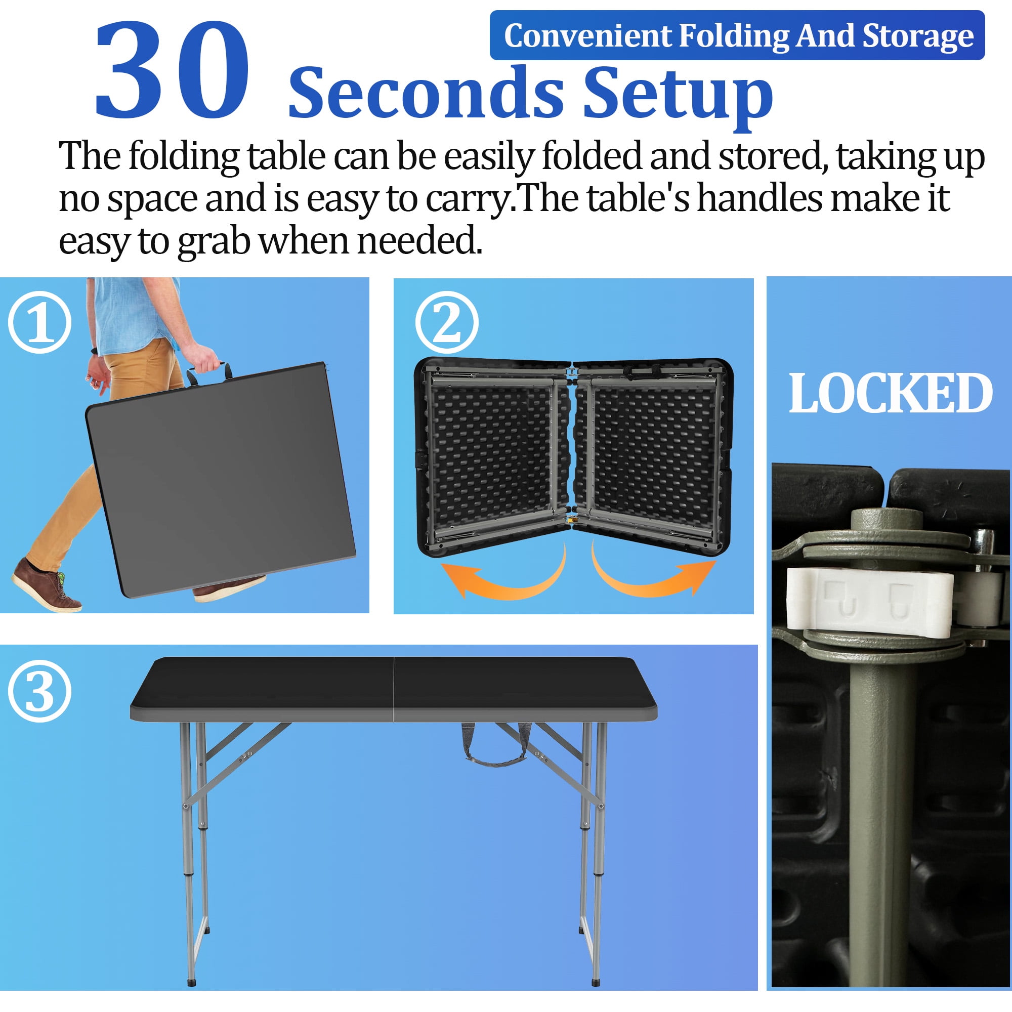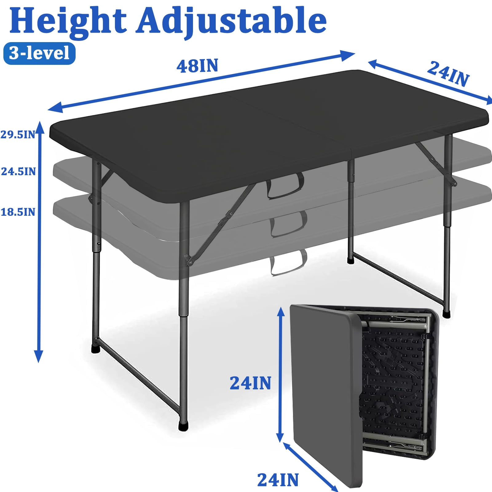 Unlock endless possibilities with our 4FT Folding Table, meticulously crafted for durability, convenience, and style. Whether you’re hosting a party, enjoying a picnic, or needing an extra dining surface, our table is the ideal choice. 1. Portable Powerhouse: Take the party wherever you go with our portable 4FT Folding Table. Crafted for easy transportation, this table is lightweight and foldable, making it the perfect companion for camping, picnics, and outdoor festivities. 2. Adjustable Heights, Maximum Flexibility: Tailor the table to your needs with adjustable height settings. From a convenient serving height to a standard dining level, our table adapts effortlessly to accommodate various activities, ensuring a comfortable experience for all. 3. Heavy-Duty Design: Built to withstand the demands of your events, our table boasts a heavy-duty construction with a weight capacity of 330 lbs. The heat-resistant and waterproof surface ensures longevity, making it suitable for both indoor and outdoor use. 4. Stylish Elegance: Elevate your spaces with the sleek design of our 4FT Folding Table. The white surface adds a touch of sophistication, making it the perfect blend of style and practicality for any setting. 5. Effortless Setup: Say goodbye to complicated assembly! Our table comes fully assembled, ready to use right out of the box. Save time and effort with our hassle-free setup, allowing you to focus on enjoying your gatherings. 6. Compact Storage: Designed with convenience in mind, our folding table easily folds for compact storage, making it an excellent choice for those with limited space. Ideal for apartments, small rooms, or anyone seeking a versatile and space-saving solution. 7. Multipurpose Marvel: Transform your table into a crafting haven, a game night centerpiece, or a sleek office desk. Its versatility makes it a top choice for various activities, ensuring you get the most out of every use. Embrace the perfect blend of functionality, durability, and style with our 4FT Folding Table. Make a statement at your next event – choose the table that exceeds expectations. Upgrade your experience with the ultimate in convenience and elegance!