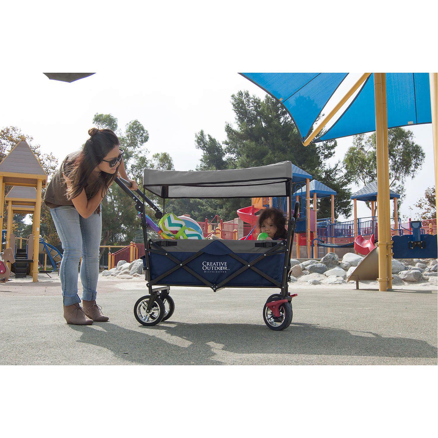 This wagon is perfect for kids, pets, or anything else you need to move around. Take them out for a walk or to the beach. The tough wheels will get you where you need to go. The wagon is very quick and easy to fold so you can get in and out of your car or house. Very solid construction. You can push the wagon like a stroller or pull it. Whatever is easiest. Comes with UV protection canopy to shield from the sun or rain.
