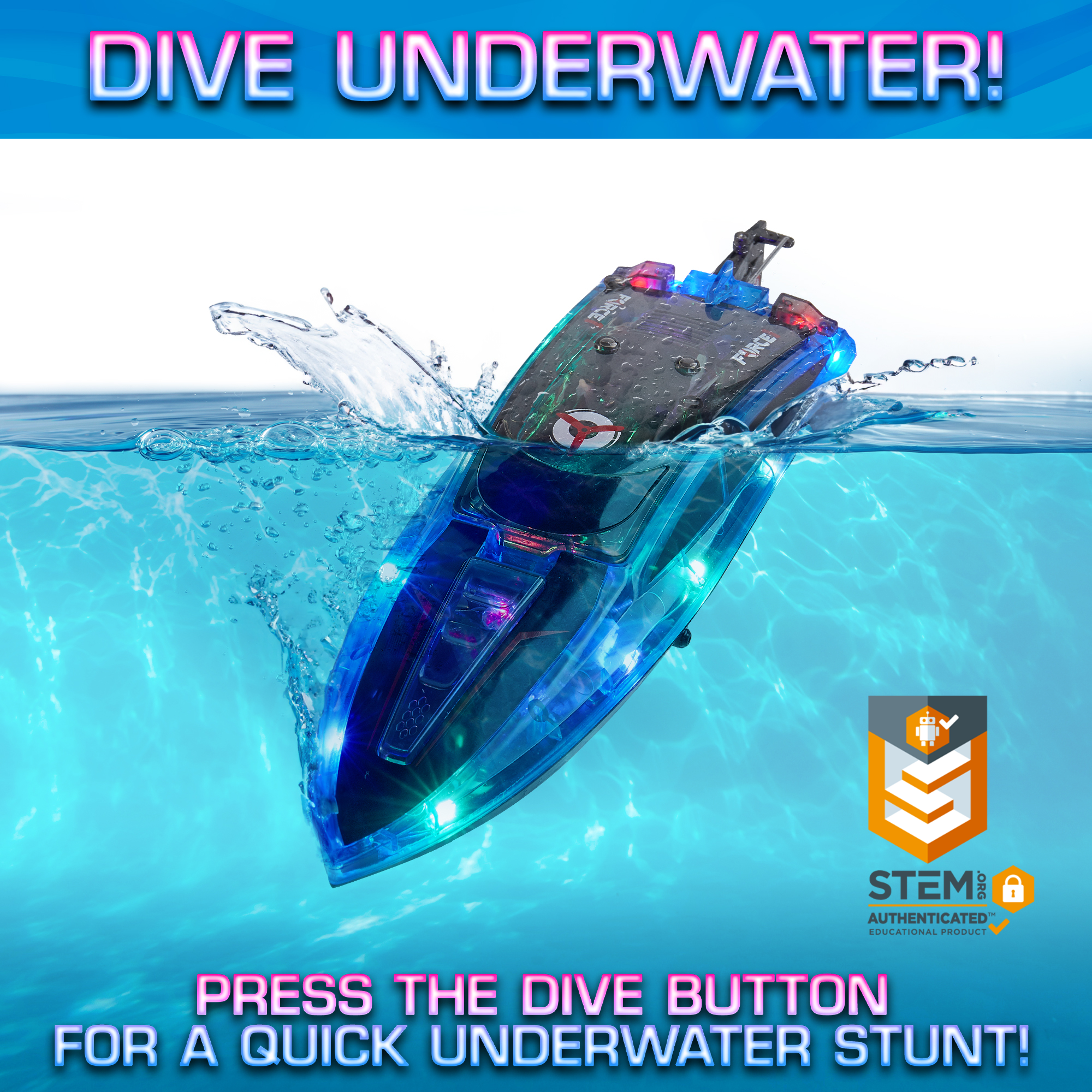 Force1 Velocity Underwater Diving LED RC Boat, 2.4 GHz Transmitter, Rechargeable Toy for Kids