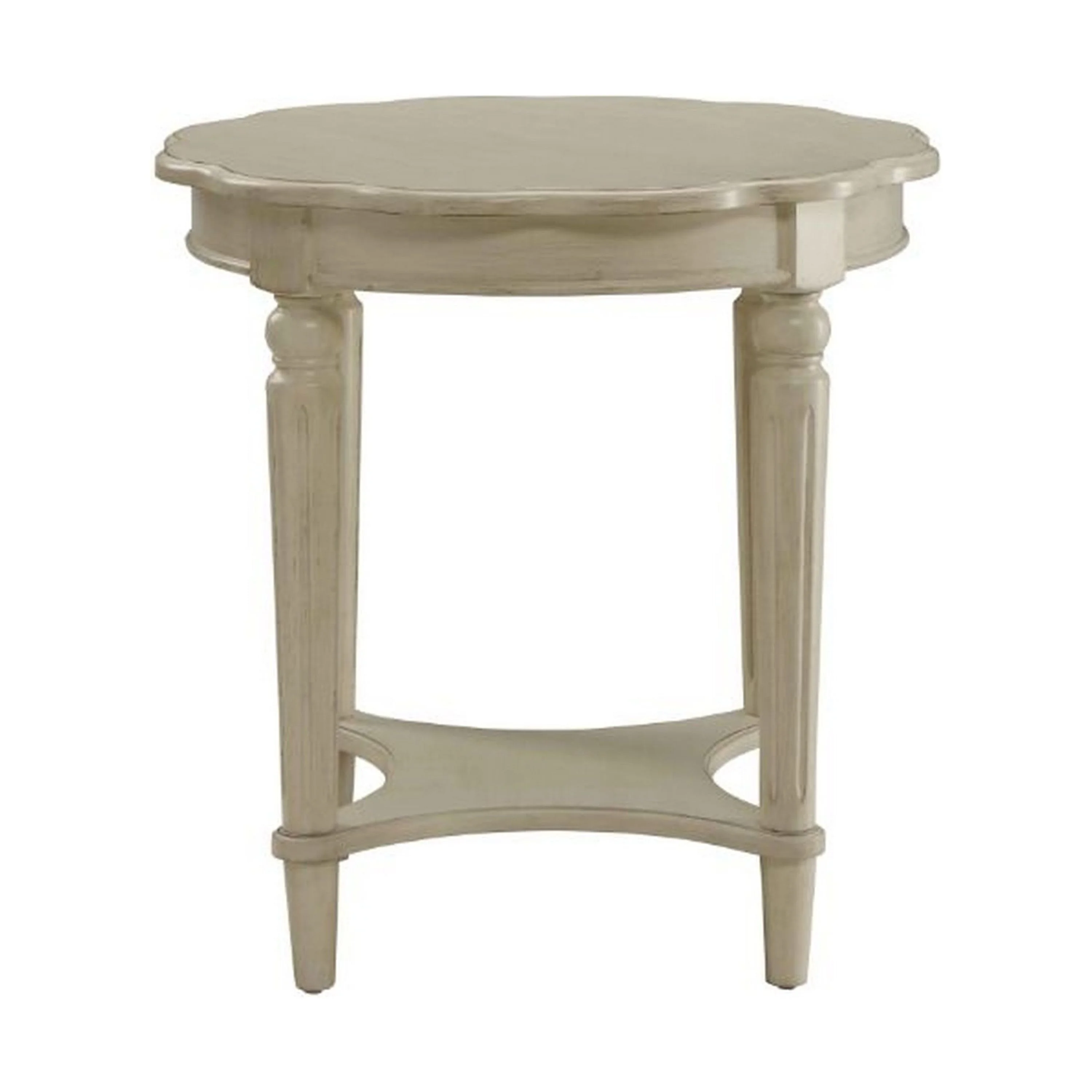 Fordon Round End Table Scalloped Top Antique White- ACME The French country-inspired Fordon occasional end table is gracefully designed and made from quality materials. Scalloped round table top turned legs and a bottom shelf each piece is carefully crafted while superb functionality is kept in mind. This occasional collection is available in both of coffee and end table in antiqued white. SPECIFICATION: One end table Constructed from a combination of mdf and solid wood French style inspired design in antique white finish It comes with scalloped round table top Supported on turned legs Comes with an exquisitely crafted bottom shelf 23.62L x 23.62W x 23.86H in inches