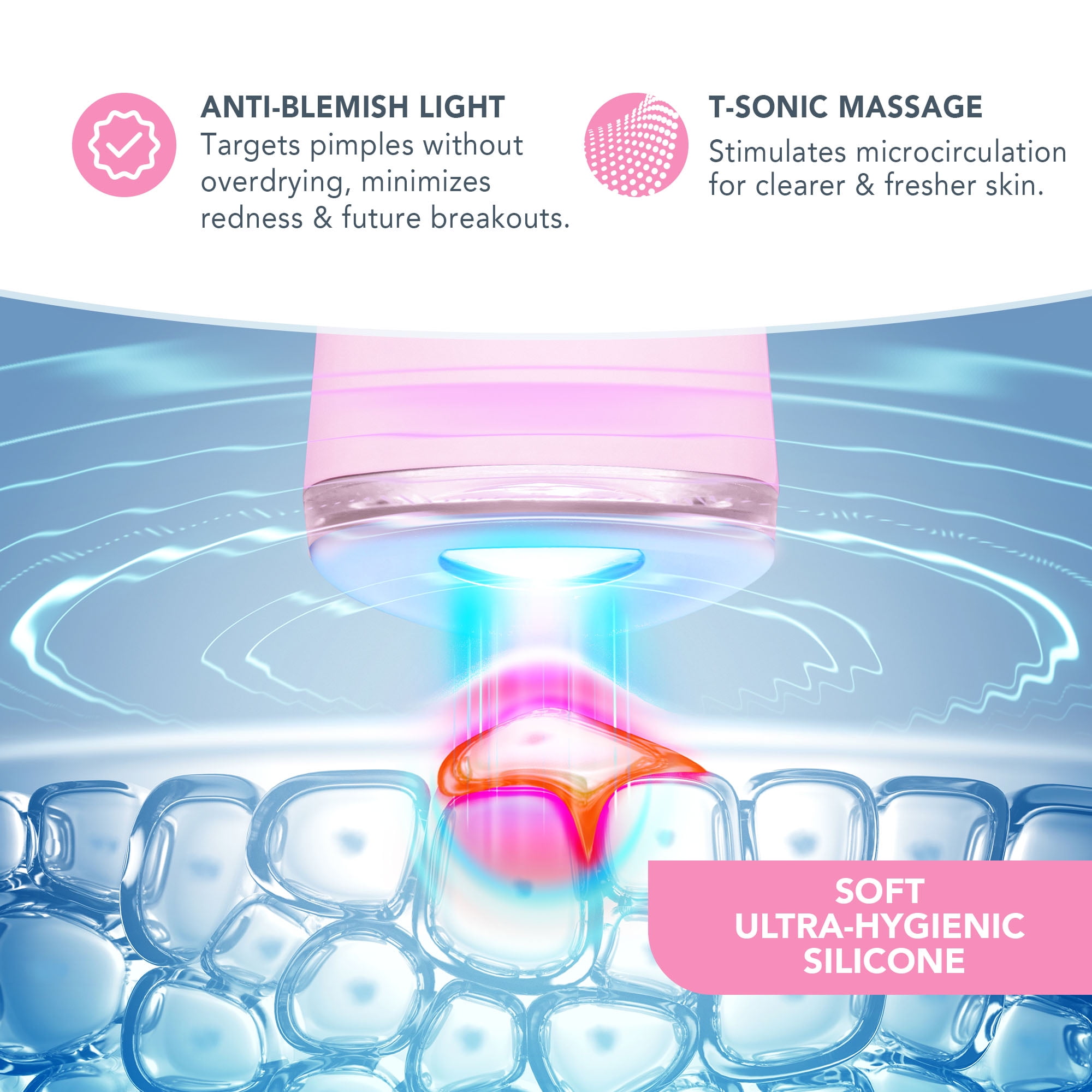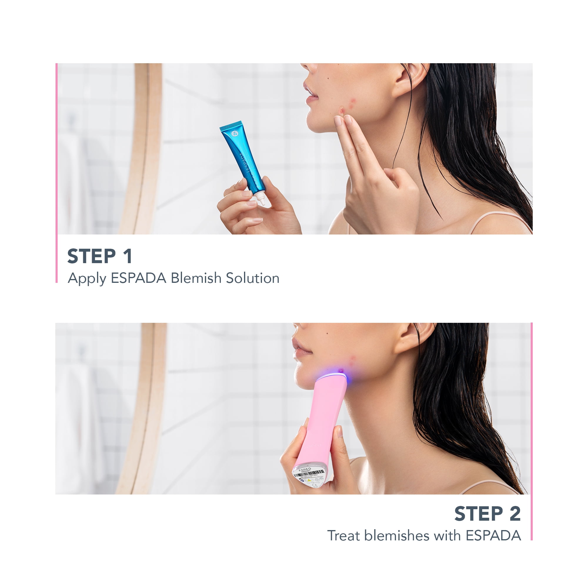 MORE POWER FOR FASTER RESULTS Featuring the dual-power of blue LED light & T-Sonic™ pulsations, the new & improved ESPADA™ 2 works quickly & effectively to clear existing acne, blemishes & inflammation – without drying skin. It is clinically proven to treat and heal skin quicker and more efficiently than ever, working when you were ready to give up This elegant & ultra-hygienic, FDA-approved silicone device was designed for easy, non-invasive management of acne-prone skin, clearing existing spots, blemishes & inflammation without over-drying, regulating sebum production and minimizing enlarged pores to prevent new breakouts. Blue LED light is a non-invasive treatment using 415 nm light wavelength to penetrate the skin, killing the acne-causing bacteria at the source, relieving current inflamation & preventing the new blemish from forming. Simultaneously, T-Sonic™ pulsations stimulate microcirculation, facilitating skin renewal to heal blemishes and erase scarring left on the skin from previous acne while increasing the absorption of on-spot treatments such as ESPADA™ BHA+PHA Blemish Solution gel. Target, treat, terminate in 30 seconds, and enjoy long-term clear, healthy & smooth skin in seconds.