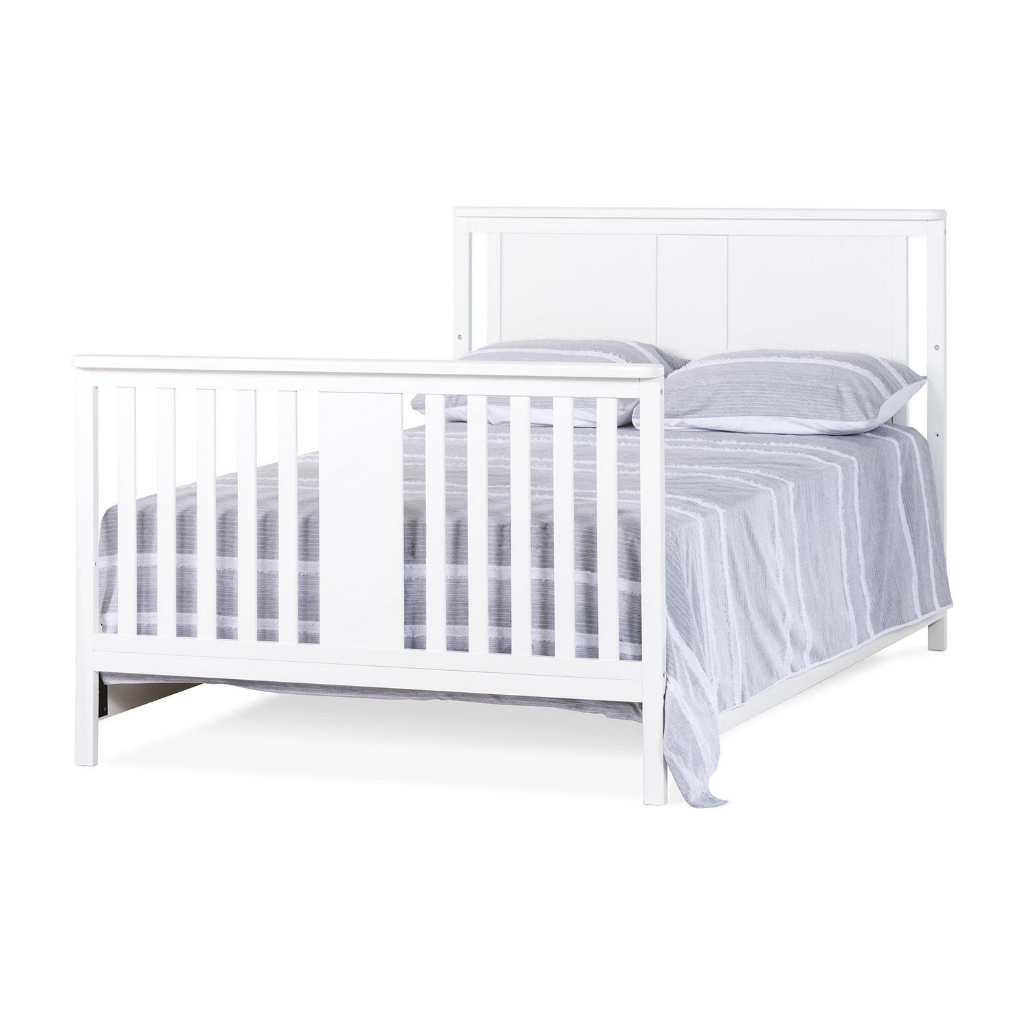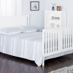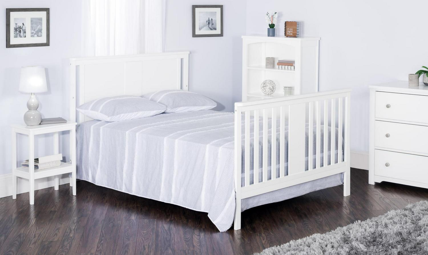 The Forever Eclectic Quincy 4-in-1 Convertible Crib combines a clean and simple design with fresh and modern style elements. The headboard features a wide center spindle design detail which is duplicated on the footboard, giving this crib an attractive and unique appearance. High quality craftsmanship will ensure that the Quincy convertible crib will see your baby through the years as it converts from a crib, to toddler bed, day bed, and full size bed (toddler guard rails and full size bed rails sold separately). A strong metal mattress support adjusts 3 heights to accommodate your little one as they grow. Available in Forever Eclectic’s signature Matte White and Dusty Heather non-toxic, baby-safe finishes, the Quincy crib is easily paired with other items from the Forever Eclectic product line, creating a nursery for your child that is individually inspired and uniquely theirs.