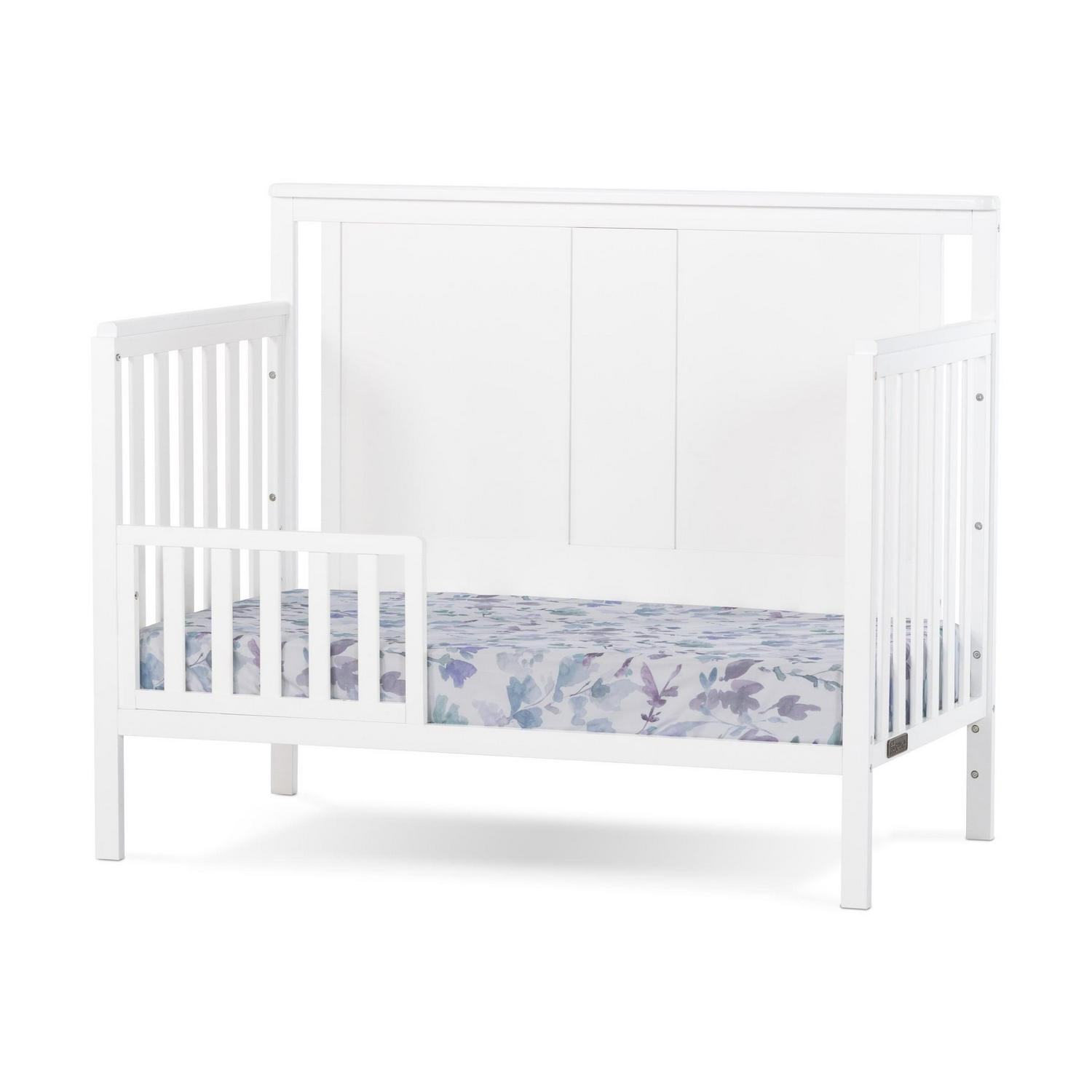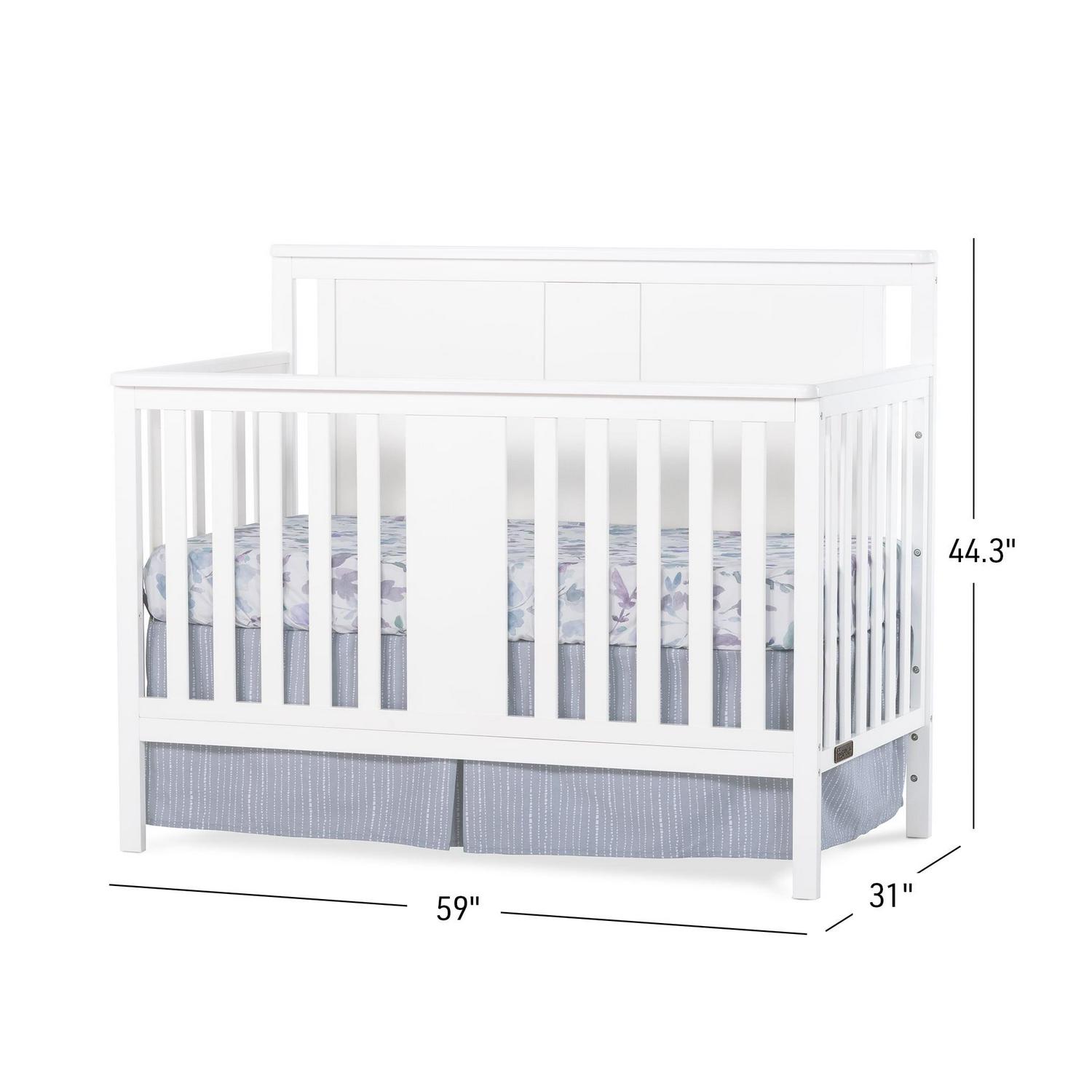 The Quincy 4-in-1 convertible crib grows with your child by converting from crib, to toddler bed, day bed and full-size bed Coordinating toddler guard rail (F09501) and full-sized bed rail (F06401) sold separately Made of pine with MDF and wood veneer Strong metal mattress support adjusts 3 height positions Fits most standard crib mattresses (sold separately) Available in Forever Eclectic’s Matte White and Dusty Heather non-toxic, baby-safe finishes Assembly required 2-year warranty, lifetime on hardware