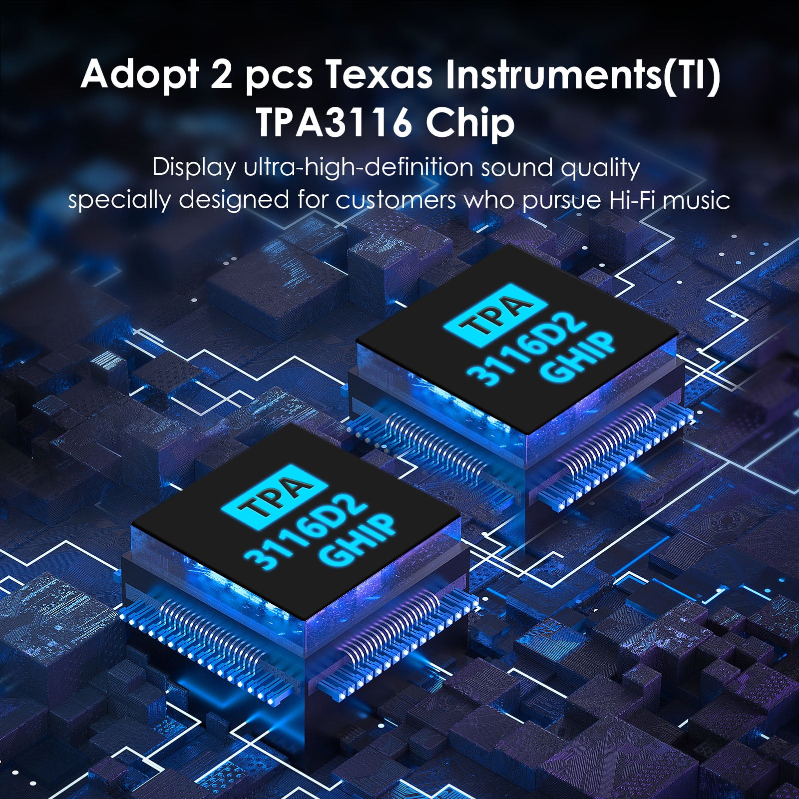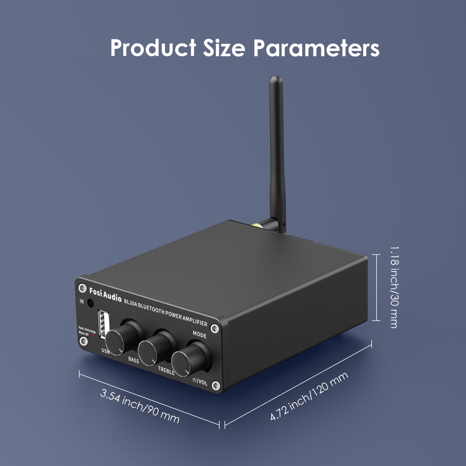 Fosi Audio BL20A 2.1 channel Bluetooth 5.0 power amplifier can drive most home passive/powered/bookshelf/ceiling speakers. With 3.5MM AUX output, BL20A can connect to passive speakers and powered speakers simultaneously. Or you can connect to an preamp through the 3.5MM output to build a simple sound system. 3 Input Modes: BL20A support Bluetooth, RCA, U-Disks and 3.5MM AUX input with bass, treble, volume and remote control, compatible with most latest device. Utilizes Bluetooth 5.0 technology for seamless device linking and a 50ft connection range. A new generation class D amplifier give you the ultimate Hi-Fi music experience. BL20A Adopt 2PCS Texas Instruments TPA3116 poewr amplifier chips digital amplifier power stage for driving speakers up to 100W / 2 Ω in mono channel, MAX power output up to 200Watts. The TPA3116 are fully protected against faults with short-circuit protection and thermal protection as well as overvoltage, undervoltage, and DC protection. Faults are reported back to the processor to prevent devices from being damaged during overload conditions PCB to be used across different power levels. Mini and Elegant Design: Small and compact aluminum alloy body(Size: 5.2×3.54×1.42 inches), easy to set up, this audio component amplifier is a great choice to your home audio stereo systems. What you Get: BL20A Power Amplifier x1, Power Adapter x1, AC Cord x1, User Manual x1, 18-month worry-free warranty, and friendly customer service.