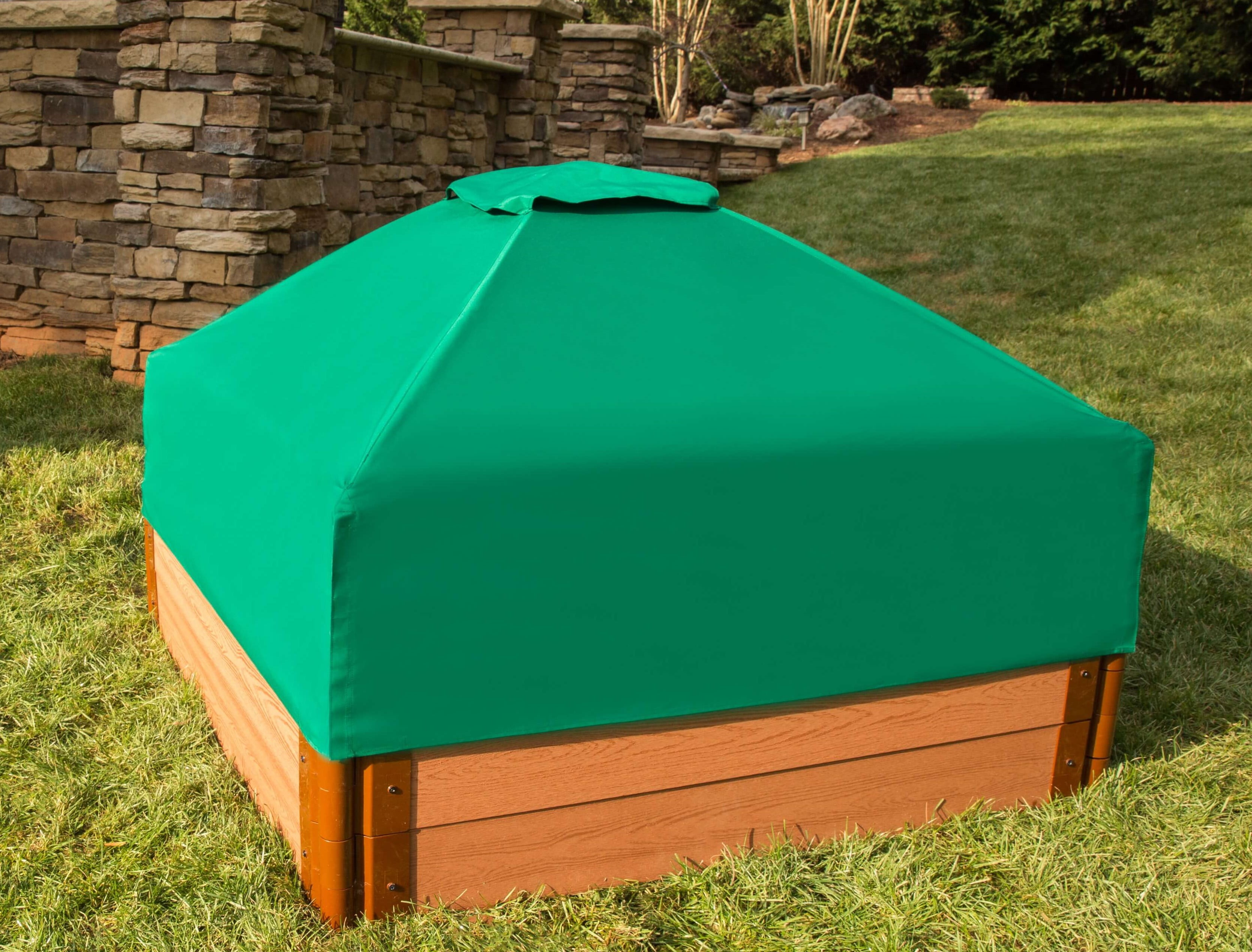 Telescoping Square Sandbox Canopy easily transitions to an attractive cover with the flip of a few levers. When used as a canopy it provides cooling shade and protects your child’s exposed skin from harmful UV rays. When used as a cover it protects the sandbox from rain and debris, or from being used as a litter box by neighborhood cats or other animals. The domed construction prevents water pooling which can help prevent a mosquito breeding ground. The 4ft. x 4ft. square canopy & cover integrates with any 4ft. x 4ft. square Frame It All sandbox. The telescoping poles insert into the stacking joints at each corner of the sandbox. Canopy is fully collapsible for easy storage if required. Sandbox not included.