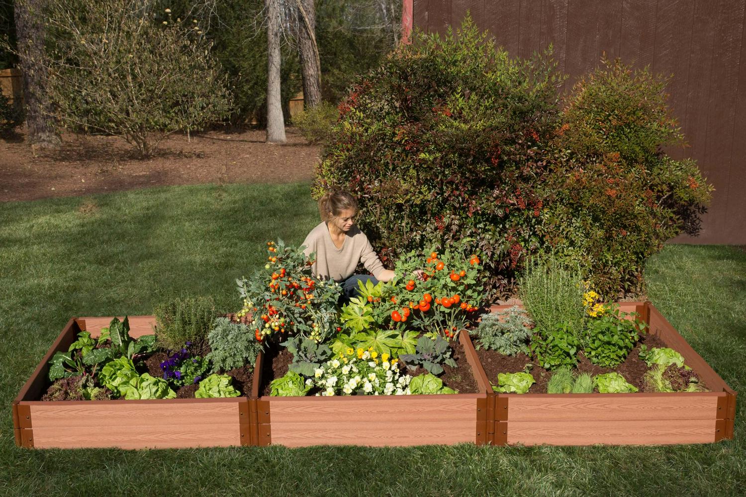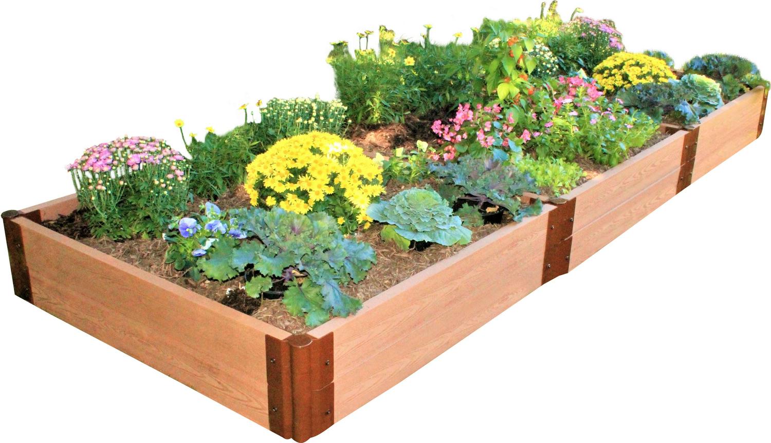 A solid choice for durability and function. This raised garden bed is strong, long and perfectly square. Reinforced with bracing boards to prevent frost push-out or any disturbance from mowers or rambunctious children and pets. If you like an organized garden, you’ll appreciate how the bracing boards divide your garden into three separate planting areas. The 11-inch-high stacked side boards give you lots of depth to grow both underground veggies like onions, radishes and carrots, as well as tall plants like tomatoes, corn or sunflowers. As shown, your 4′ x 12′ x 11″ raised garden bed provides 48 square feet of planting area. You can redesign your garden at any time by assembling your available boards and brackets in new ways. Separate your stacked two-level garden bed into two separate 5.5 in. high raised beds. Create four 4′ x 4′ x 5.5″ raised beds, or three 4′ x 8′ x 5.5″ beds or terraced gardens with beds of different depths! Tool-free snap-lock joints make it simple to install. Your kit comes with everything you need except the soil and plants. Each modular kit includes eighteen of our 2 inch Classic Sienna composite boards, fourteen 2 inch tool-free snap-lock stacking brackets and two 2 inch tool-free snap-lock 4-Way bracing brackets. The insulating open-channel boards trap air, providing insulation to your soil. Keeps soil warmer in the Spring and Fall, and cooler in the Summer, so you can grow for an extended period. Two-inch boards offer even more insulating power than our one-inch boards. Stacking brackets allow you to install the second layer of your garden just by inserting the stakes into the brackets below. Our patented snap-lock brackets simply slide onto each end of a board and fasten securely with snap-lock buttons. Brackets pivot 270 degrees, allowing endless design options. You can easily convert your bed to an octagon, just by changing the angle of the brackets. As your garden needs and expertise grow you can add on to your modular raised bed any time by purchasing additional 2 inch tool-free snap-lock kits, boards and anchor or stacking brackets to stack or extend your garden. Curved 2 inch boards are also available to incorporate into your design. Did you know You can grow up to 48 different plants inside your 4′ x 12′ garden using “Square Foot Gardening” techniques. There are countless books and online resources available to guide you in this rewarding method of gardening.