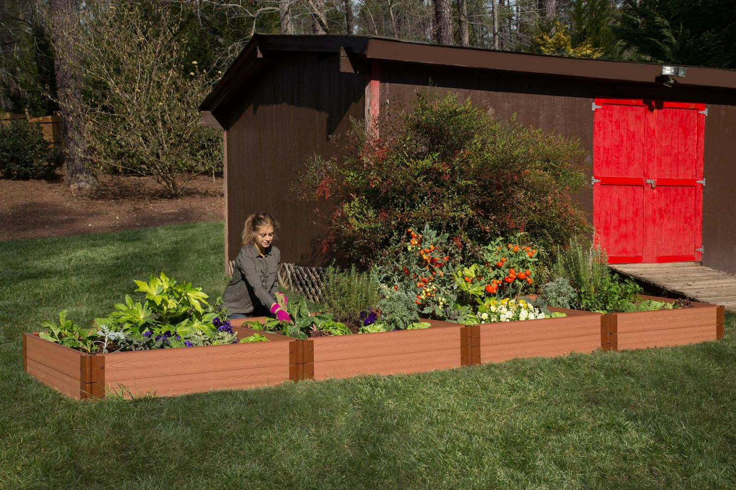 This raised garden bed is strong, long and perfectly square. A solid choice for durability and function. Reinforced with bracing boards to prevent frost push-out. If you like an organized garden, you’ll appreciate how the bracing boards divide your garden into four separate planting areas. The 11-inch-high stacked side boards give you lots of depth to grow both underground veggies like onions, garlic and carrots, as well as tall plants like tomatoes, corn or sunflowers. As shown, your 4′ x 12′ x 11″ raised garden bed provides 64 square feet of planting area. You can redesign your garden at any time by assembling your available boards and brackets in new ways. Separate your stacked two-level garden bed into two separate 5.5″ high raised beds. Create five 4′ x 4′ x 5.5″ raised beds, or three 4′ x 8′ x 5.5″ beds – or terraced gardens with beds of different depths! Terraced options are great for providing just the right amount of soil depth for the particular plant you are growing. Tool-free snap-lock joints make it simple to install. Your kit comes with everything you need except the soil and plants. Each modular kit includes twenty-three of our 1 in. Classic Sienna composite boards, seventeen 1 in. snap-lock stacking brackets and three 1 in. snap-lock 4-Way bracing brackets. The insulating open-channel boards trap air, providing insulation to your soil. Keeps soil warmer in the Spring and Fall, and cooler in the Summer, so you can grow for an extended period. Stacking brackets allow you to install the second layer of your garden just by inserting the stakes into the brackets below. Our patented snap-lock brackets simply slide onto each end of a board and fasten securely with snap-lock buttons. Brackets pivot 270 degrees, allowing endless design options. You can easily convert your bed to an octagon, just by changing the angle of the brackets. As your garden needs and expertise grow you can add on to your modular raised bed any time by purchasing additional 1 in, tool-free kits, boards and anchor or stacking brackets to stack or extend your garden. Curved 1 in. boards are also available to incorporate into your design. Did you know You can grow up to 64 different plants inside your 4′ x 16′ garden using “Square Foot Gardening” techniques. There are countless books and online resources available to guide you in this rewarding method of gardening.