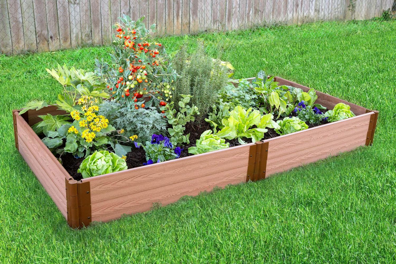 Our most popular raised garden bed and it’s easy to see why! There is so much versatility in what you can grow and the designs you can achieve. As pictured, your 11-inch-high raised garden gives you lots of depth to grow both underground veggies like carrots, radishes and turnips, as well as tall plants like tomatoes, corn or sunflowers. With 32 square feet of available planting area this may be all the garden you will ever need, or it’s a great garden to gain some experience with before you expand your garden larger or taller. Tool-free. Your kit comes with everything you need except the soil and plants. Each modular kit includes thirteen of our 1″ Classic Sienna composite boards, twelve 1″ snap-lock stacking brackets and one 4-Way bracing bracket. The insulating open-channel boards trap air, providing insulation to your soil. Keeps soil warmer in the Spring and Fall, and cooler in the Summer, so you can grow for an extended period. Stacking brackets allow you to install the second layer of your garden just by inserting the stakes into the brackets below. Your two-level garden is also fortified by the inclusion of a 4-Way Bracing Bracket and an additional board to brace your garden against frost push-out and keep it perfectly square and true. Our patented snap-lock brackets simply slide onto each end of a board and fasten securely with snap-lock buttons. Stacking Brackets pivot 270 degrees, allowing endless design options. Your 4′ x 8′ x 11″ two-level raised bed can be converted to two 4′ x 8′ x 5.5″ raised beds if that suits your needs more directly. You can also change the shape from a rectangle to a hexagon, either as a two-level bed, or two one level beds (you ll have 1 board left over). You could also create three 4′ x 4′ x 5.5″ square gardens, or four triangle gardens as you can see the options are endless. As your garden needs and expertise grow you can add on to your modular raised bed any time by purchasing additional 1 in. tool-free kits, boards and anchor or stacking brackets to stack or extend your garden. Curved 1 in. boards are also available to incorporate into your design. Did you know You can grow up to 32 different plants inside your 4′ x 8′ garden using “Square Foot Gardening” techniques. There are countless books and online resources available to guide you in this rewarding method of gardening.