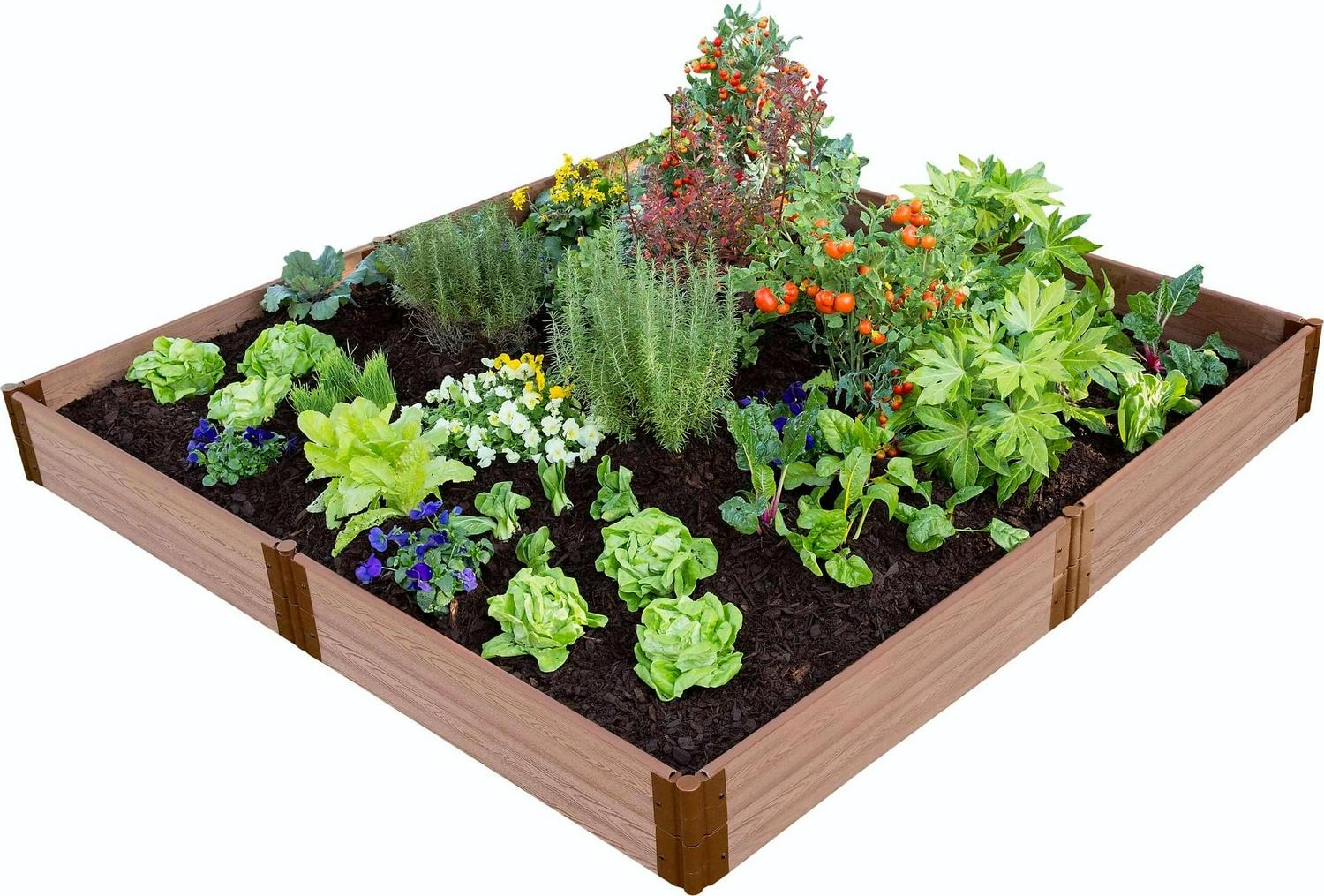 Calling all hobby farmers! This enormous raised garden bed gives you loads space to neatly organize a variety of vegetables, herb, fruits or flowers. As pictured, your 11-inch-high raised garden gives you lots of depth to grow both underground veggies like carrots, radishes and turnips, as well as tall plants like tomatoes, corn or sunflowers. With 64 square feet of available planting area this may be all the garden you will ever need, but if you’d like to super-size your garden this kit can be converted into a 16′ x 16′ one-level 5.5″ high raised bed. That’s 128 square feet! Tool-free. Your kit comes with everything you need except the soil and plants. Each modular kit includes sixteen of our 1″ Classic Sienna composite boards, and eight each of our 1″ snap-lock anchor and stacking brackets. The insulating open-channel boards trap air, providing insulation to your soil. Keeps soil warmer in the Spring and Fall, and cooler in the Summer, so you can grow for an extended period. Anchor brackets grip the ground tight, so your raised bed will stay put no matter the weather. The serrated stakes will also help to keep your raised beds from being disturbed by mowers or any human activity. Stacking brackets allow you to install the second layer of your garden just by inserting the stakes into the brackets below. Our patented snap-lock brackets simply slide onto each end of a board and fasten securely with snap-lock buttons. Brackets pivot 270 degrees, allowing endless design options. You can easily convert your bed to an octagon, just by changing the angle of the brackets. As your garden needs and expertise grow you can add on to your modular raised bed any time by purchasing additional 1″ tool-free kits, boards and anchor or stacking brackets to stack or extend your garden. Curved 1″ boards are also available to incorporate into your design. Did you know You can grow up to 64 different plants inside your 8′ x 8′ garden using “Square Foot Gardening” techniques. There are countless books and online resources available to guide you in this rewarding method of gardening.