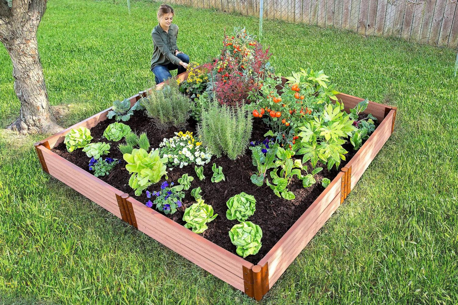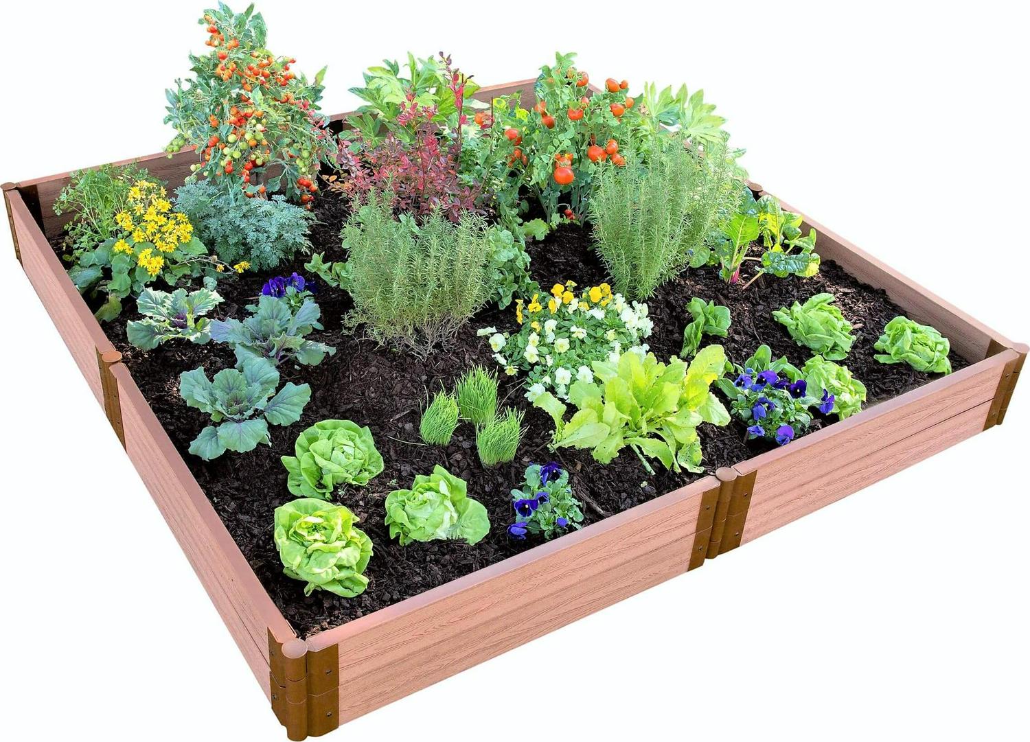 This enormous raised garden bed gives you loads space to neatly organize a variety of vegetables, herb, fruits or flowers. As pictured, your 11-inch-high raised garden gives you lots of depth to grow both underground veggies like carrots, garlic and turnips, as well as tall plants like tomatoes, corn or sunflowers. With 64 square feet of available planting area this may be all the garden you will ever need, but if you d like to super-size your garden this kit can be converted into a 16′ x 16′ one-level 5.5″ high 128 square foot bed. Tool-free snap-lock joints make it simple to install. Your kit comes with everything you need except the soil and plants. Each modular kit includes sixteen of our 2 in. Classic Sienna composite boards, and eight each of our 2 in. snap-lock anchor and stacking brackets. The insulating open-channel boards trap air, providing insulation to your soil. Keeps soil warmer in the Spring and Fall, and cooler in the Summer, so you can grow for an extended period. Anchor brackets grip the ground tight, so your raised bed will stay put no matter the weather. The serrated stakes will also help to keep your raised beds from being disturbed by mowers or any human activity. Stacking brackets allow you to install the second layer of your garden just by inserting the stakes into the brackets below. Our patented snap-lock brackets simply slide onto each end of a board and fasten securely with snap-lock buttons. Brackets pivot 270 degrees, allowing endless design options. You can easily convert your bed to an octagon, just by changing the angle of the brackets. As your garden needs and expertise grow you can add on to your modular raised bed any time by purchasing additional 2 in. tool-free kits, boards and anchor or stacking brackets to stack or extend your garden. Curved 2 in. boards are also available to incorporate into your design. Did you know You can grow up to 64 different plants inside your 8′ x 8′ garden using “Square Foot Gardening” techniques. There are countless books and online resources available to guide you in this rewarding method of gardening.