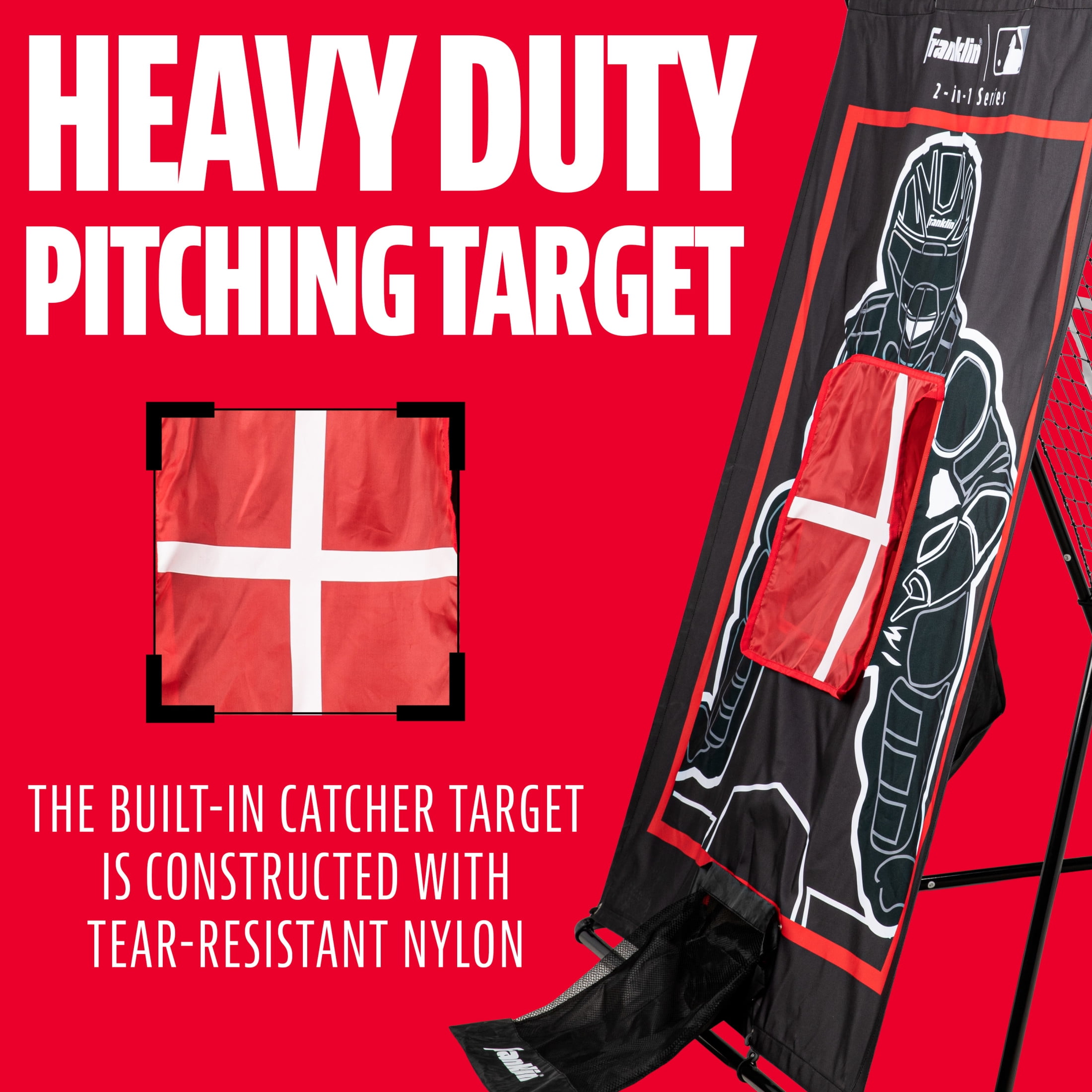 2-IN-1 PITCH BACK AND TARGET: This pitch back is designed for dual-sided use as both a pitching target and return rebounder for your Little Leaguer to hone several skills at once! HEAVY DUTY PITCHING TARGET: The lifelike catcher target is constructed with heavy-duty nylon to ensure that your child can practice season after season. The life size strike zone is perfect for practicing accuracy and mastering the strike zone REINFORCED RETURN: The return rebound side is constructed from polyethylene and reinforced with a bungee netting system for increased durability and reliability. Maintains a consistent rebound throw after throw BUILT IN HITTER: The pitching target comes complete with a switch-hitting batter simulation that can be placed on either side of the strike zone. Practice pitching to both lefties and righties so your skills will be sharp come game time! PERFECT FOR YOUTH BASEBALL: This rebounder is the perfect training tool for any Little Leaguer to practice throwing, pitching, fielding and more!