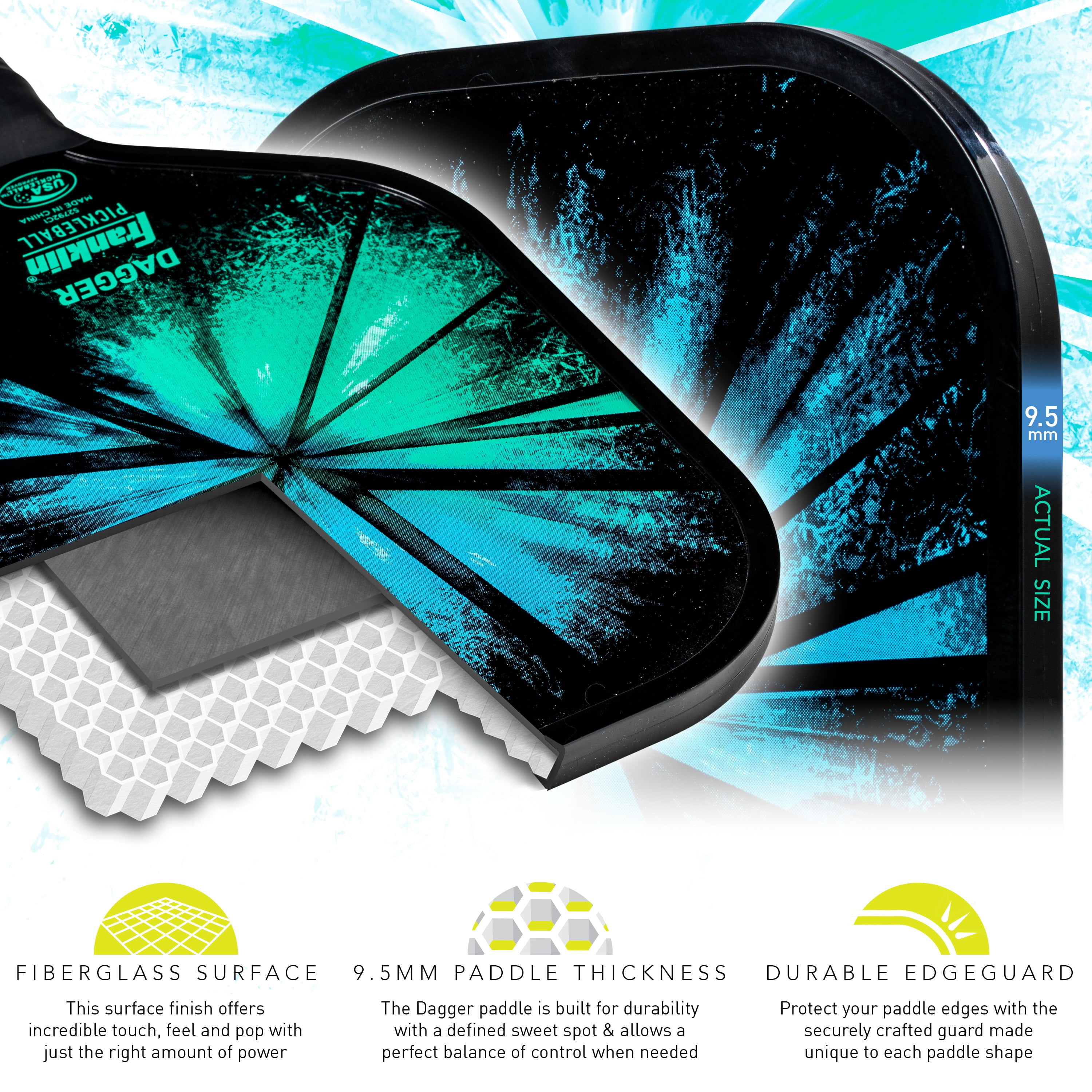 TWO PLAYER SET: The Dagger pickleball paddle and ball set is the perfect two player starter set that has everything you need for you and a friend to hit the courts today! (2) PADDLES: This set comes with (2) Dagger pickleball paddles each constructed with a polypropylene core and fiberglass surface for premium durability and performance (4) PICKLEBALLS: This set also includes (4) official size X-40 outdoor pickleballs. These top-of-the-line pickleballs are some of the best on the market, and are the official balls of the pickleball US Open USA PICKLEBALL APPROVED: Both the paddles and X-40 pickleballs are USA Pickleball (USAPA) approved for competitive and tournament play SPECS: Paddle dimensions: 15.4″ L x 7.7″ ; Paddle weight: 11.3 – 11.7 ounces; Handle length: 4.9″; Pickleball dimensions: 74mm diameter, 26g weight
