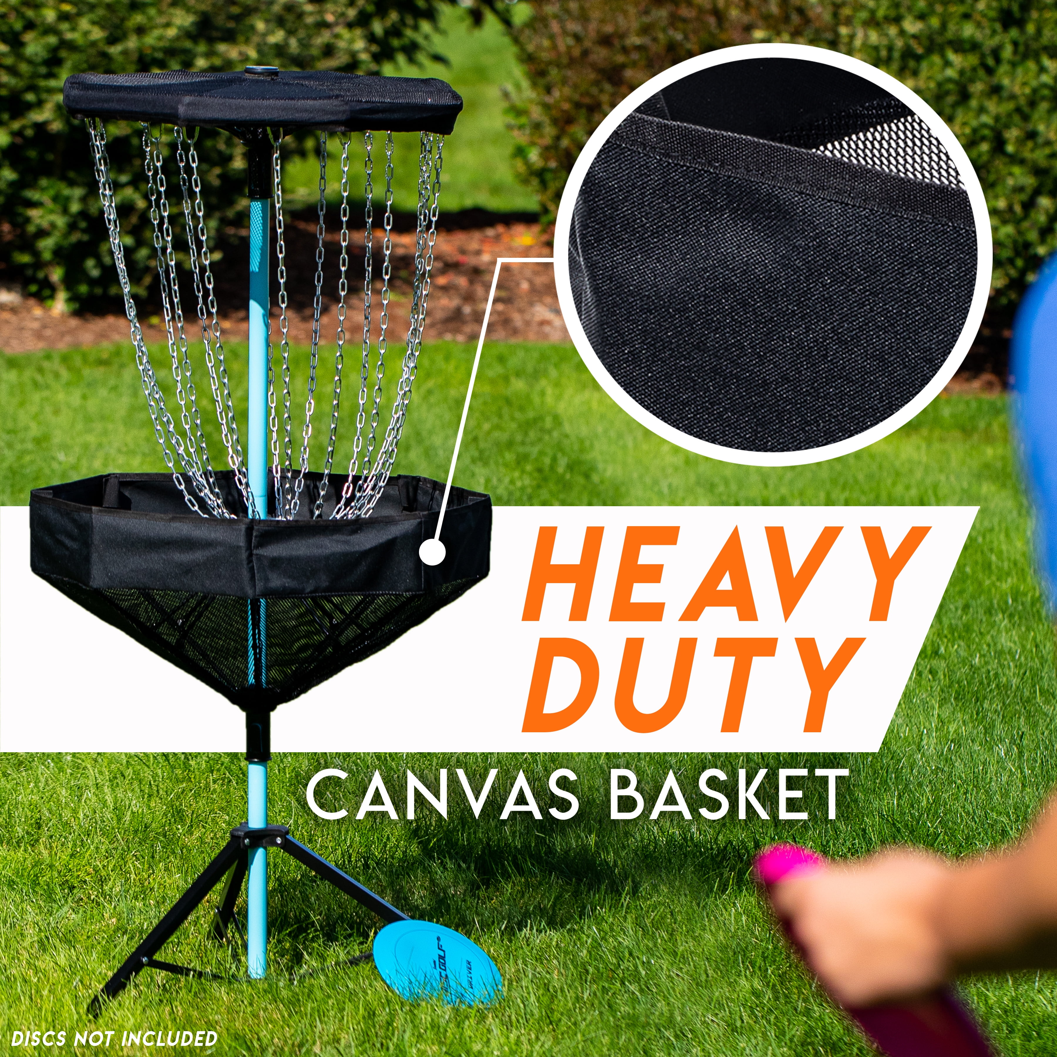 PREMIUM DISC GOLF BASKET: This portable disc golf target is made for players of all skill levels to design their own holes and bring the game on the go! PDGA APPROVED – Disc Golf Basket approved by PDGA (Standard Category) PROFESSIONAL CONSTRUCTION: This target comes with heavy-duty steel chains and a reinforced canvas basket for a premium quality feel that lasts year after year QUICK SET UP: The sturdy, easy-assembly frame design makes setup quick on nearly any surface. The unique umbrella shape provides foldable simplicity, so you can spend more time playing and less time setting up! EASY TRANSPORT: This Franklin disc golf target folds up for easy transport and storage, and also includes a carry bag to ensure everything stays organized. Take this target basket to the park, the beach, or anywhere else for disc golf fun! BASKET ONLY: This set comes with the target stand, basket and metal chains only. Discs sold separately