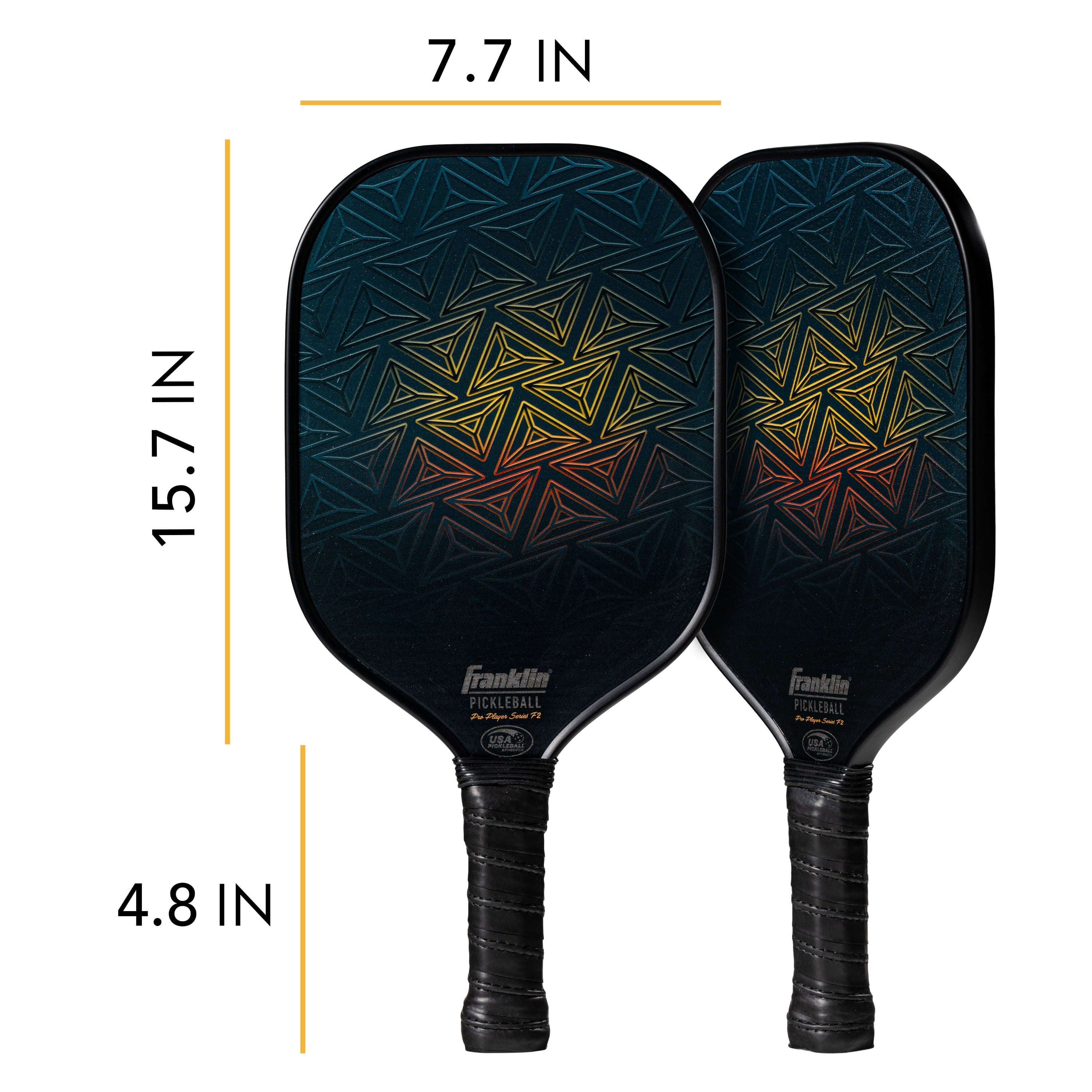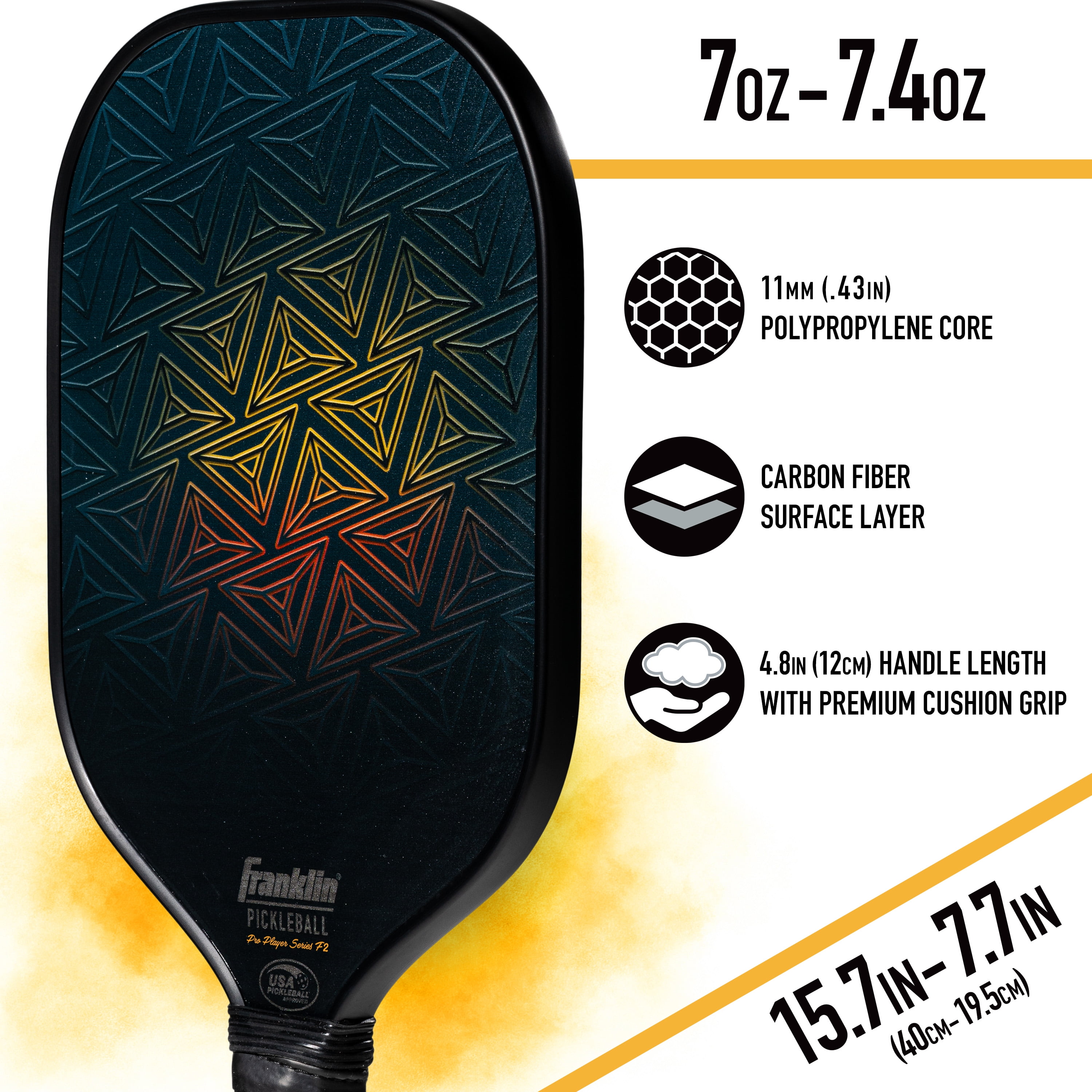 CARBON FIBER surface layer on these paddles provides the perfect blend of pop and control while in game play. Paddle is 7.7in wide and 15.7in long, with 4.8in handle. Balanced with a tough polypropylene core this paddle is USA Pickleball Approved. COMFORT GRIP: Keep your hands in the game with our form fitting non-slip grip handle PREMIUM CONSTRUCTION: This paddle is made with a dual plated aluminum surface for accurate, powerful shot making PADDLE WEIGHT: 7-7.4oz PROTECTIVE CASING: This paddle is constructed with a sturdy edge for added protection against nicks and dents