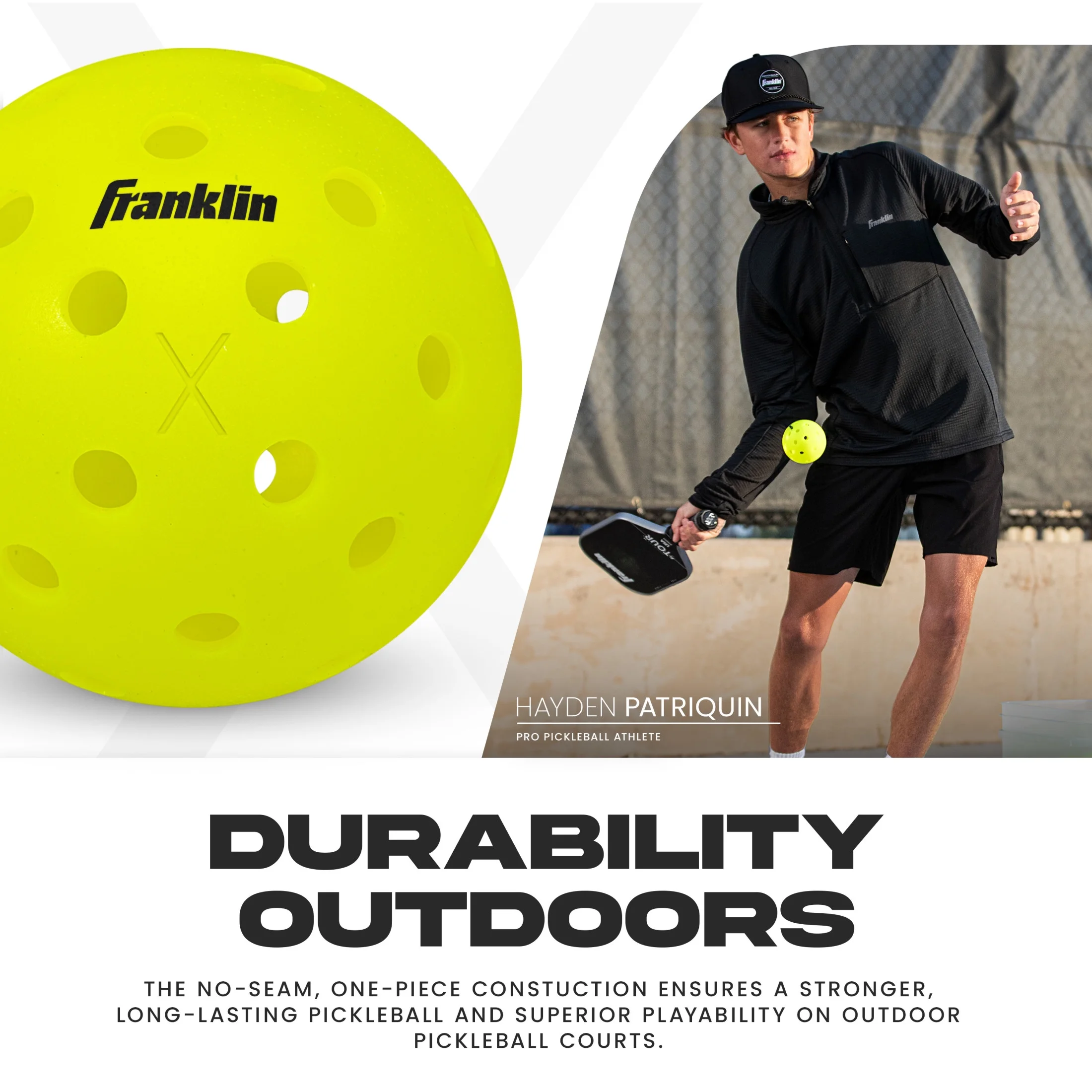 PREMIUM QUALITY: Franklin’s X-40 outdoor pickleballs are meticulously crafted and rigorously tested to uphold our standard of premium performance and durability that has made this ball a favorite among pro and amateur players PRECISION DESIGN: X-40 pickleballs are constructed with 40 precise, machine-drilled holes for a balanced flight pattern and tight, reliable spin that is consistent from ball to ball DURABILITY OUTDOORS: The no-seam, one-piece construction ensures a stronger, longer lasting pickleball that resists dents and cracking on outdoor pickleball courts USA PICKLEBALL APPROVED: These official size and weight X-40 pickleballs are approved for outdoor tournament play by USA Pickleball (USAPA) and were chosen as the official ball for both the US Open Pickleball Championships and USA Pickleball 100 BULK PACK: This bulk pack includes (100) X-40 pickleballs so you can be fully stocked up on balls for training sessions, matches, and even tournaments