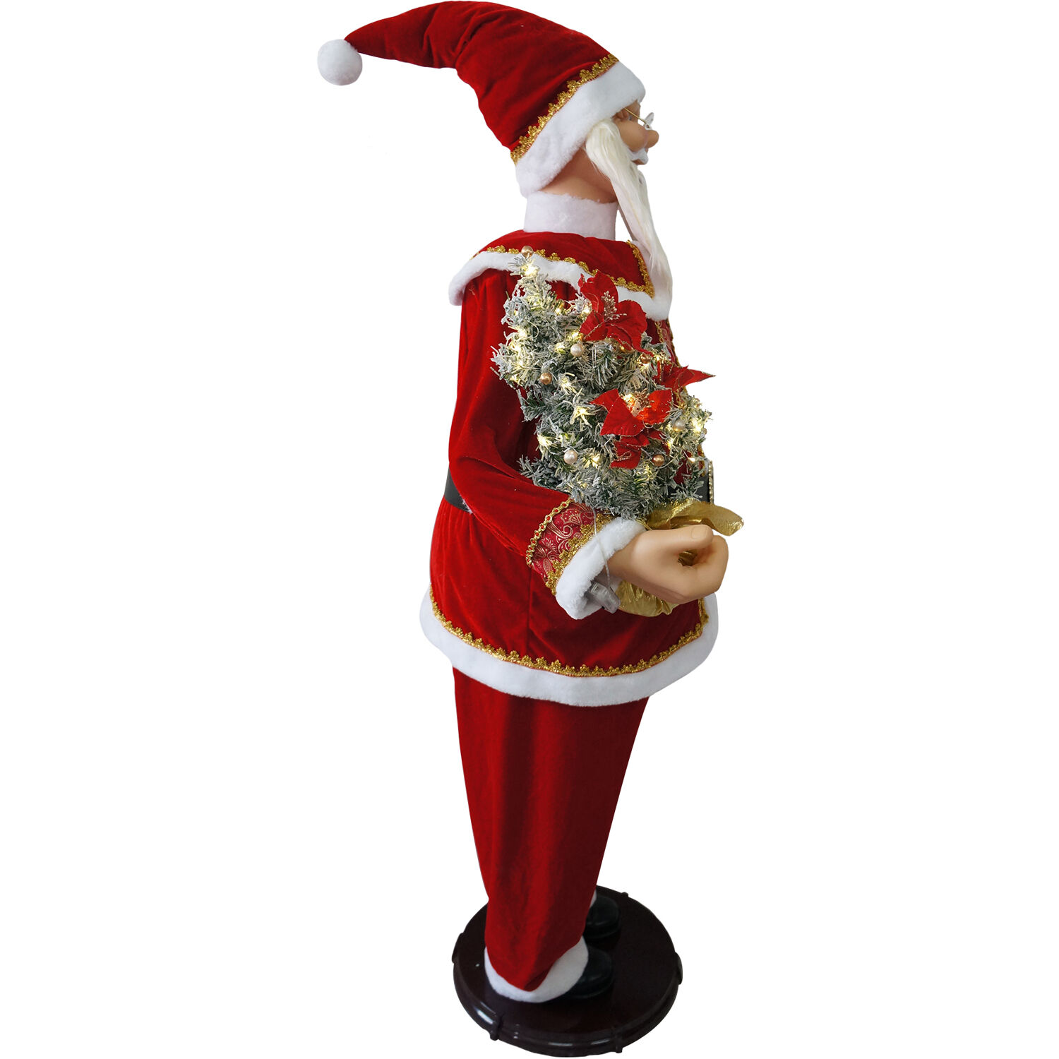 MOTION ACTIVATED ANIMATION: When motion is detected, Dancing Santa moves his arms and sways his body to music (approx. 38 seconds). Motion sensor is triggered from a distance of approximately 1.5 to 5 feet. MUSICAL: Jingle Bell Rock can be heard through the music speaker located on the base. Music volume is approximately 88 dBs and can be adjusted with the volume knob located at the back of the base. LIFE-SIZE: Standing 58 inches tall, Santa Claus carries wrapped gifts and a lighted holiday tree. Pair him with our Dancing Mrs. Claus in her matching outfit for an extra special display (sold separately model # FMC058-2RD5). PRE-LIT LED LIGHTS: Prelit Christmas tree, with 50 warm white LED bulbs, lights up via a battery-operated on/off switch (requires 3 AA batteries – NOT included). COLLAPSABLE: Assembly required – collapsible for easy storage after the holiday season ends. For convenient placement, the 6-ft. power cord uses standard 115V electrical outlet. Indoor use is strongly recommended for many years of enjoyment. 58-in. motion-activated dancing Santa Claus carries wrapped gifts and a lighted Christmas tree Prelit holiday tree, with 50 warm white LED bulbs, lights up via a battery operated on/off switch (requires 3 AA batteries – NOT included) Pair him with our Dancing Mrs. Claus in her matching outfit for an extra special display (model # FMC058-2RD5 sold separately) When motion is detected, he moves his arms and sways his body to music (approx. 38 seconds) Friendly face with open spectacles, round chubby cheeks, and a full beard Stylishly dressed in a bright red velvet suit with lavish red and gold brocade and fluffy white trim Matching cap, black belt with golden buckle, and black boots complete Santa’s outfit Jingle Bell Rock can be heard through the music speaker located on the base Music volume is approximately 88 dBs and can be adjusted with the volume knob located at the back of the base Animation switch and power jack is located at the back of the base Motion sensor on the front of the base is triggered from approximately 1.5 to 5 feet Assembly required – Collapsible for easy storage after the holiday season ends 6-ft. power cord uses standard 115V electrical outlet Recommended for indoor use only (1-year warranty applies to indoor use only) Dimensions: 15″D x 21″W x 58″H