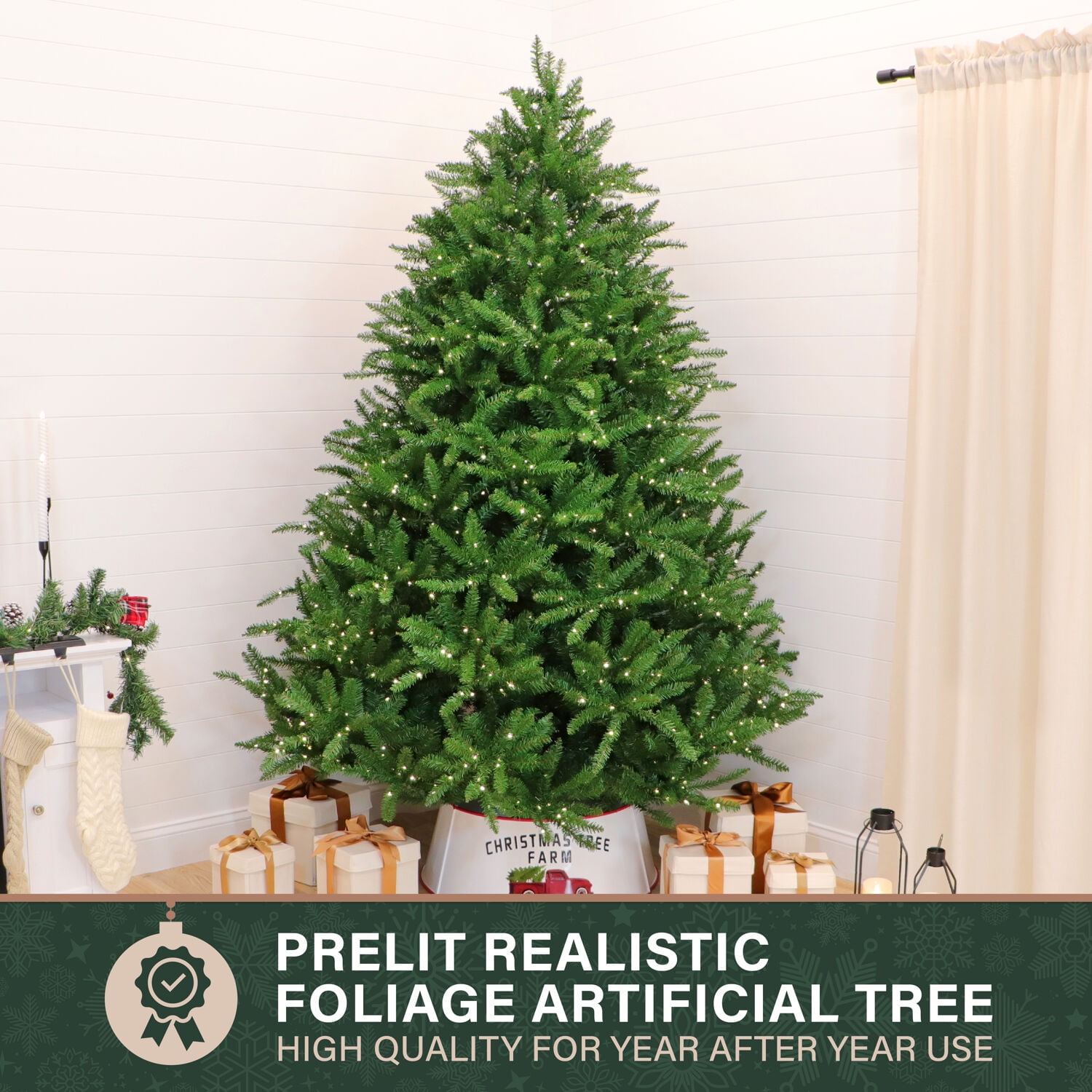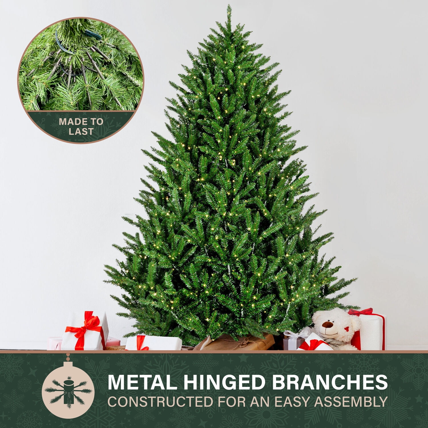 With Fraser Hill Farm, enjoy the long-term benefits that come with owning an artificial tree. The 7.5-ft. Centerville Pine Christmas tree features a lifelike foliage and all-metal hinged branch construction for strength and durability. The tree needles are constructed out of non-allergenic and flame-retardant materials then painted multiple hues of green so no two are exactly alike. Together these details create the look of a natural tree that requires hardly any maintenance. The tree is prestrung with warm white fairy LED lights with 8 functions so you can choose whether you want the lights to twinkle, stay steady, or many other options. The EZ Connect feature makes assembly a breeze by auto locking each tier securely into place and connects the lights’ circuit so there’s no additional plugs. An included remote control adds more convenience so you can change the light settings from across the room. With the Centerville Pine Christmas tree, simply unfold out of storage and decorate.