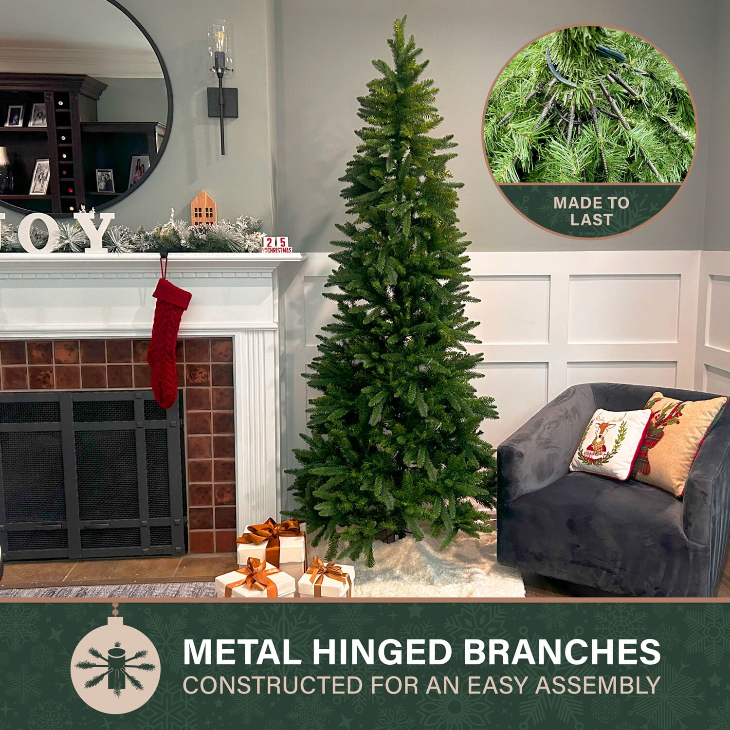 Fraser Hill Farm’s Winter Falls artificial Christmas tree features a slim silhouette with extremely lifelike foliage and all metal, hinged branch construction. The flocked finish was designed to resemble freshly fallen snow that is true to the season, and multiple hues of green branches produce a natural effect. Fraser Hill Farm produces the most realistic trees in the market, featuring all the long term benefits that come with owning an artificial tree. Simply unfold out of storage and decorate. The needles are made out of high quality PVC material and are both flame-retardant and nonallergenic. The unlit model provides a blank canvas for your cherished heirlooms and treasured homemade ornaments. Add convenience to your annual holiday decorating with this artificial Winter Falls tree and invest in a quality Christmas tree that will be the centerpiece of your holiday decor year after year.