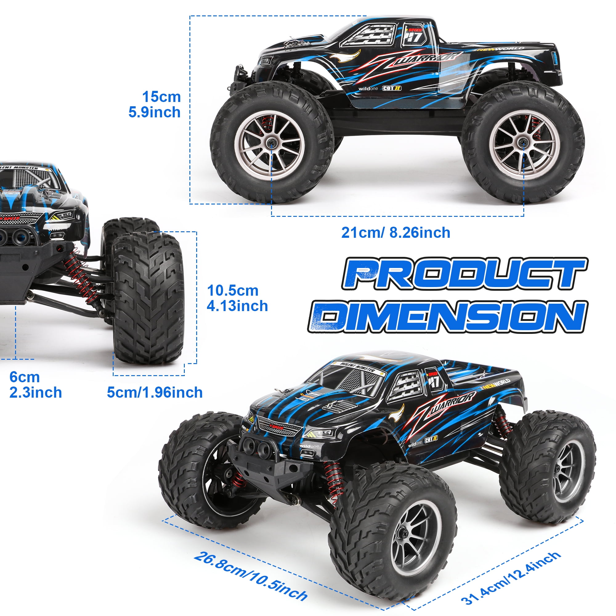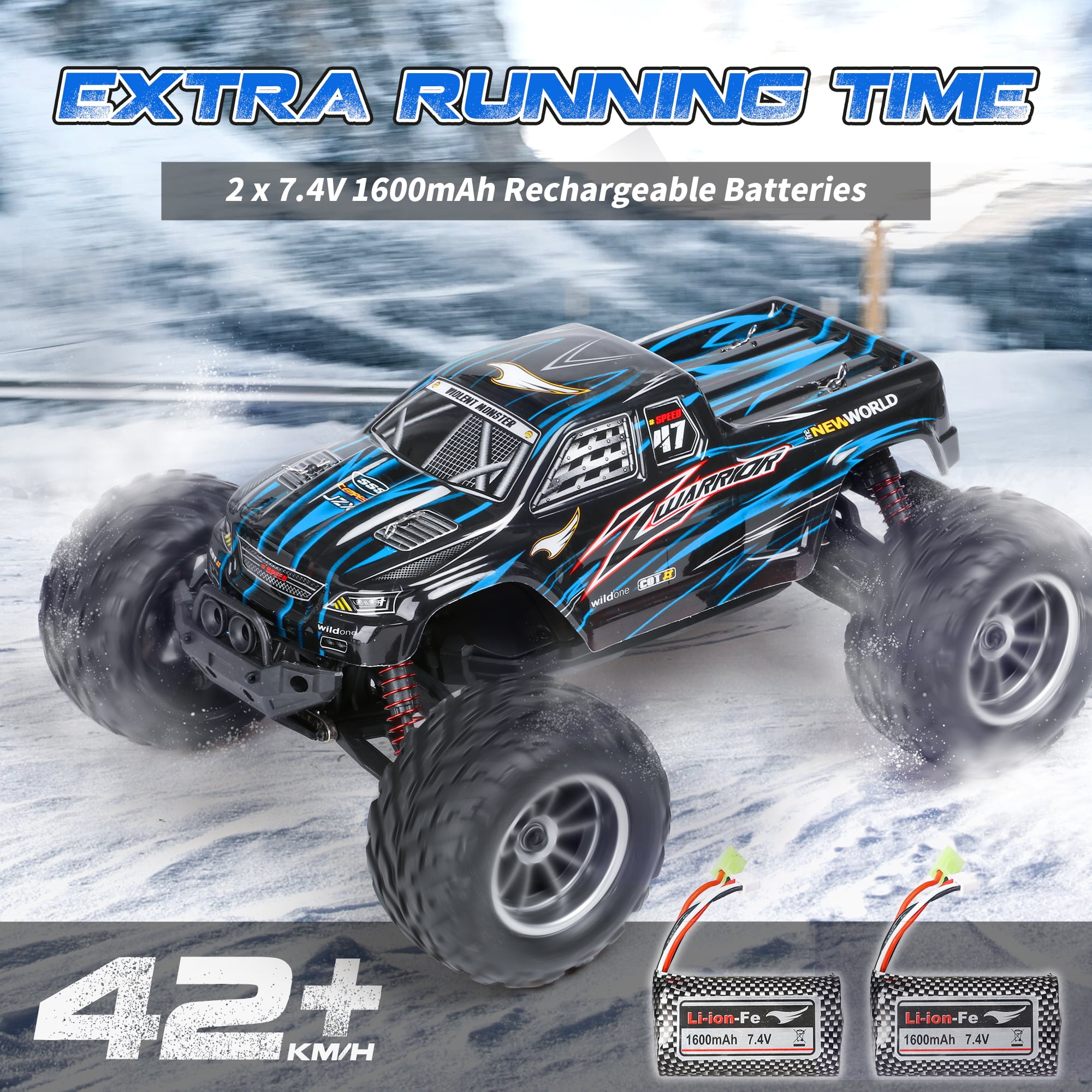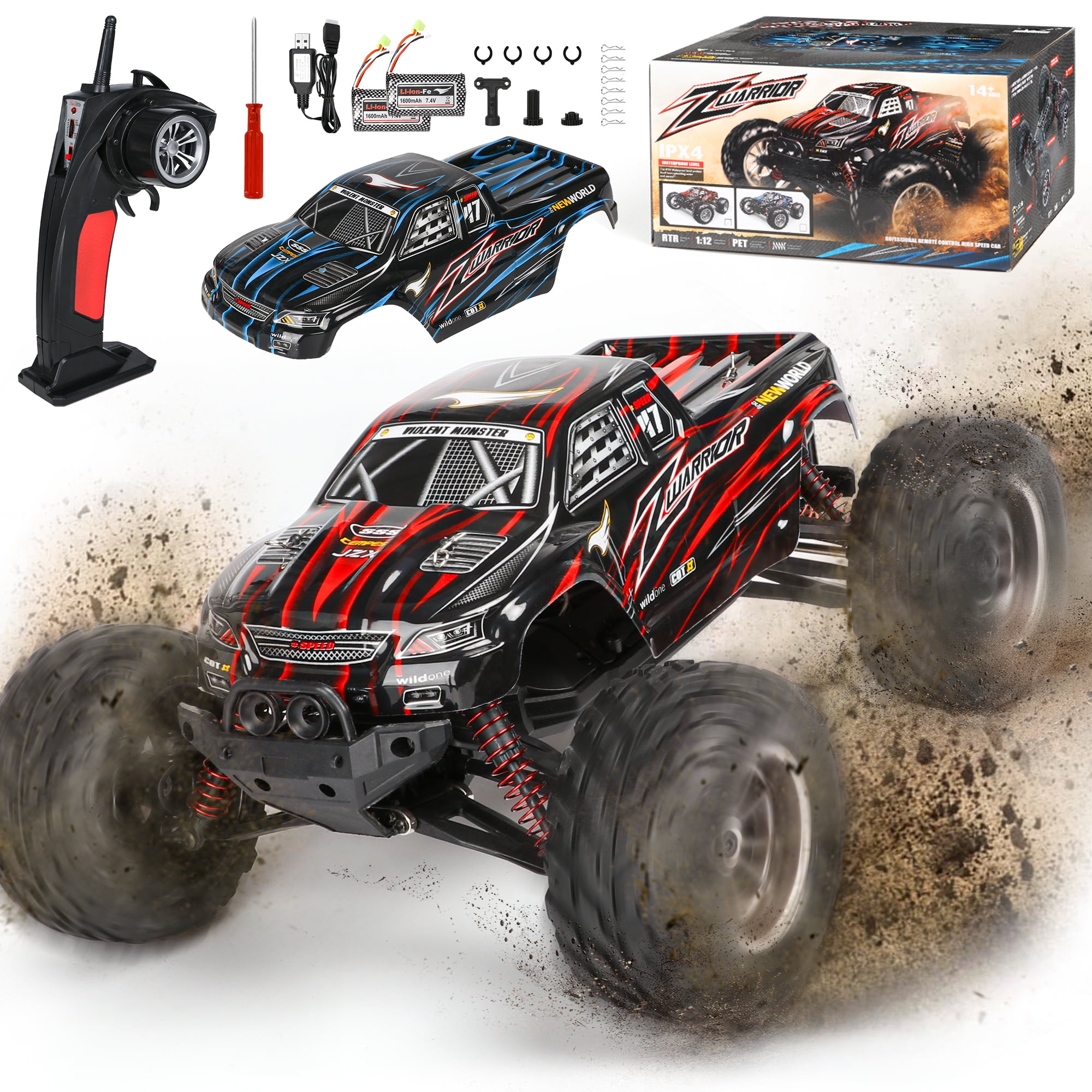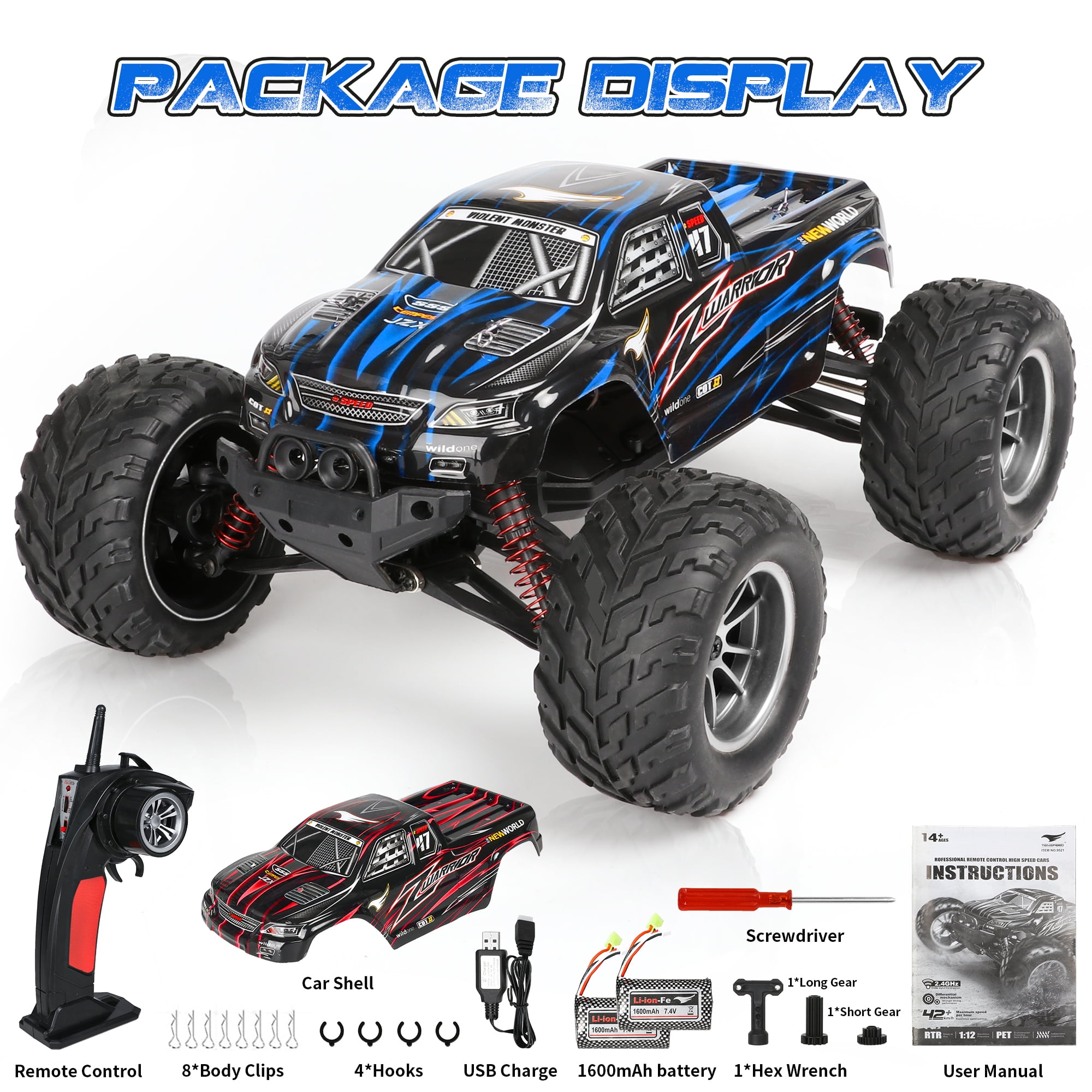 【High-Speed Sensitive Control】The speed of the 1:12 remote control car can reach 42km / h. The 2.4GHz radio control is responsive and will not interfere with other RC cars when playing together. Children can race these RC cars indoors and outdoors with their parents and friends. 【Different Colored Car Shells】Different colored car shells make this rc car stand out from the crowd. You can choose your favorite color based on your mood and start this speed race. The remote controller of this monster truck is very responsive and has multiple functions. The speed is adjustable and the angle changes sensitively. It is the best gift choice for beginners and intermediate users. 【Two Large Batteries】We have upgraded the two batteries to 7.4V 1600mAh. This way, children can play outside without interruption and have fun. Suitable for children aged 6-8, 8-10, and 8-12. 【Upgraded Chassis and Bumper】All toy trucks have passed drop and impact tests, so they can withstand accidental operations such as hitting walls or stones. The rubber tires and suspension system provide good traction and cushioning, so children can drive this monster truck anywhere, such as beaches, lawns, and concrete roads. 【Safety Guarantee】All remote control cars have passed CPSIA and ASTM tests to ensure safe play. Worry-free gifts for occasions like birthdays, Christmas, parties, and more. If you are looking for an exciting and cool surprise gift, you will love this monster truck. Please feel free to contact us if you have any questions.