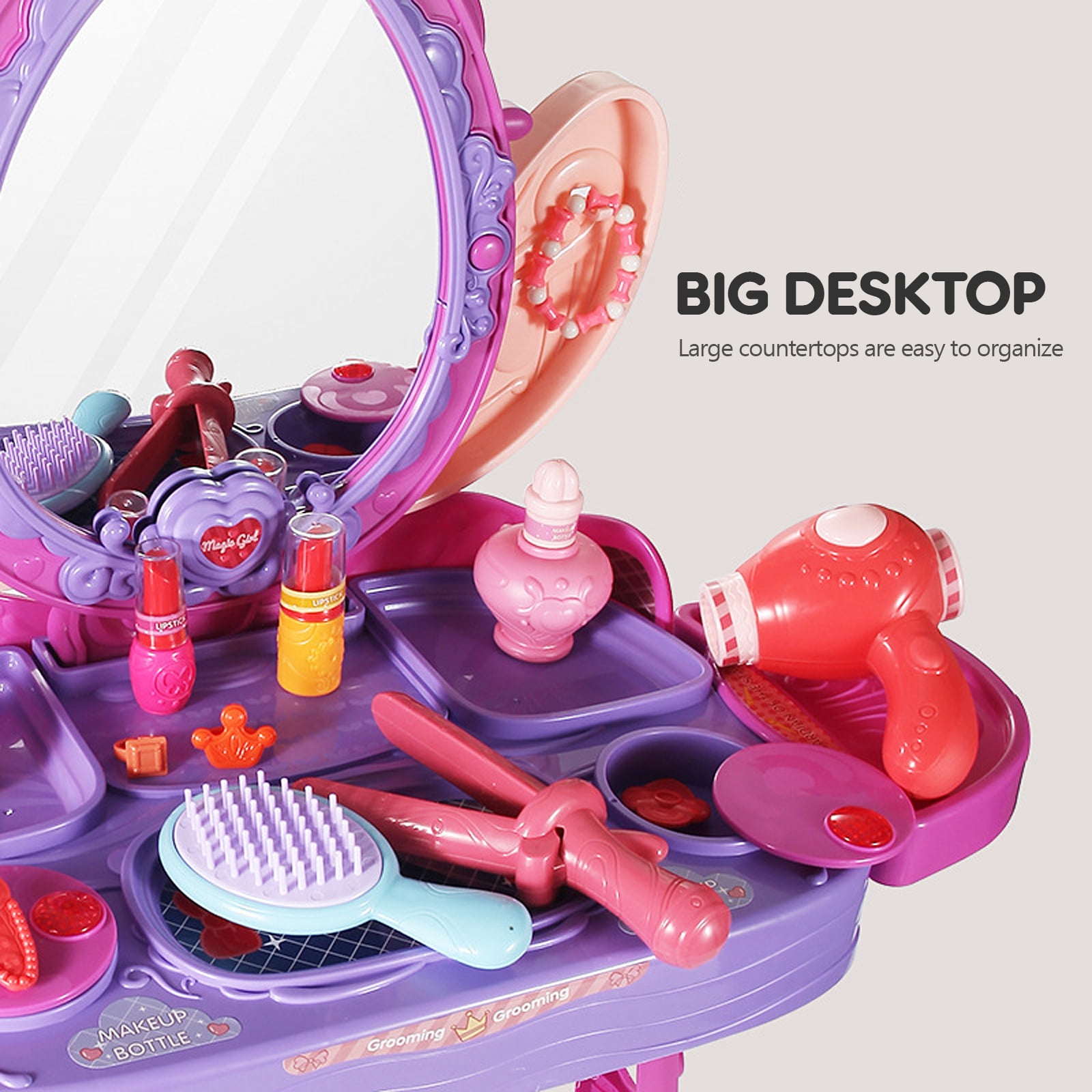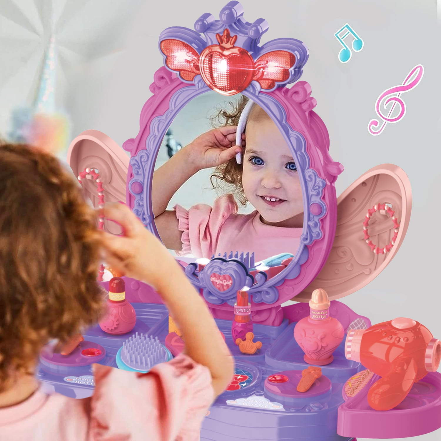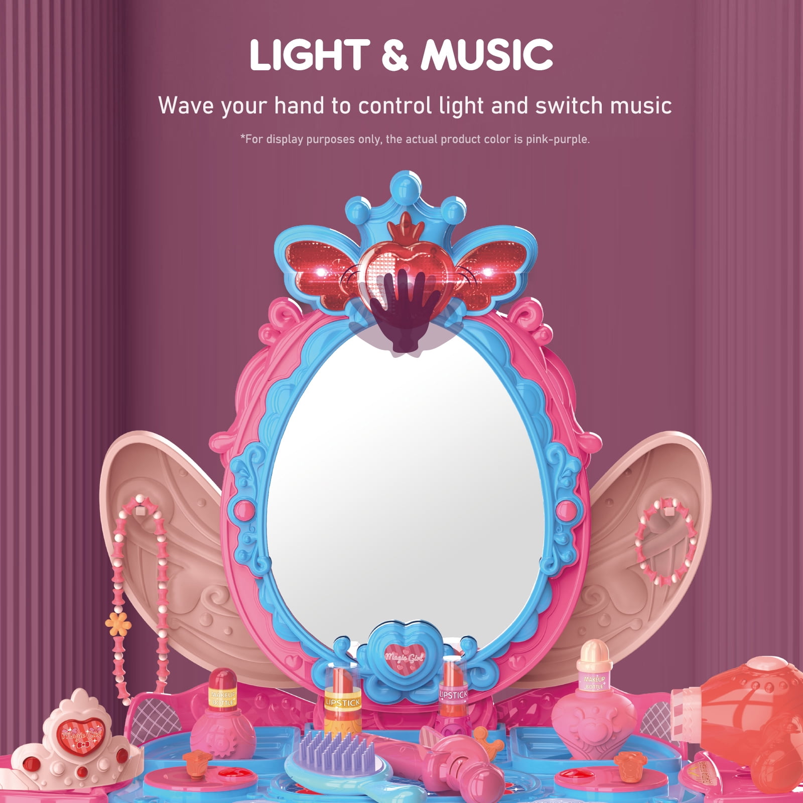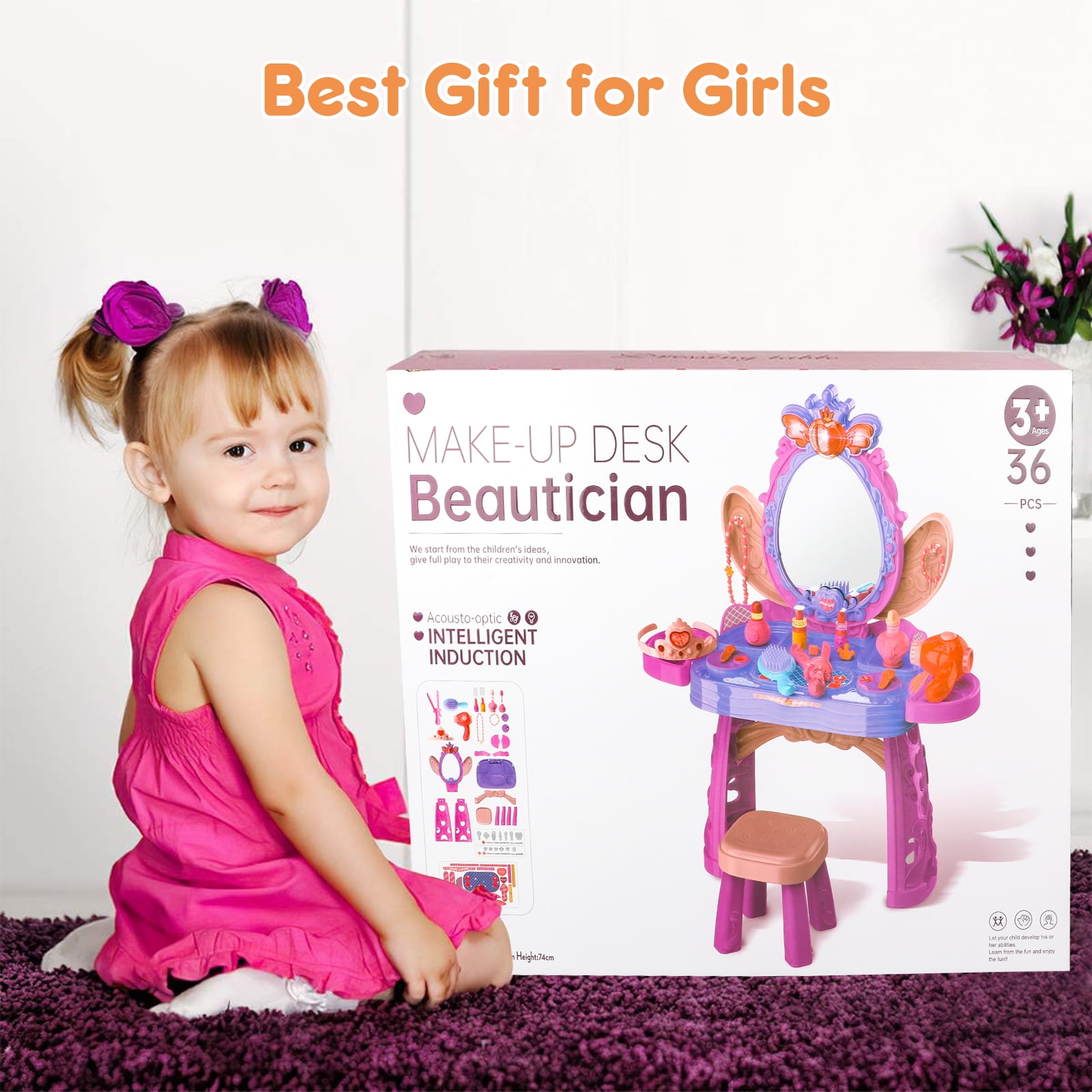 Freecat Kids Makeup Vanity Set With Mirror And Stool, Toys for 3-6 Years Old Girls Pretend Play & Dress Up Toy, Toddler Vanity Table Set With Light And Music Sound, Birthday Gift.