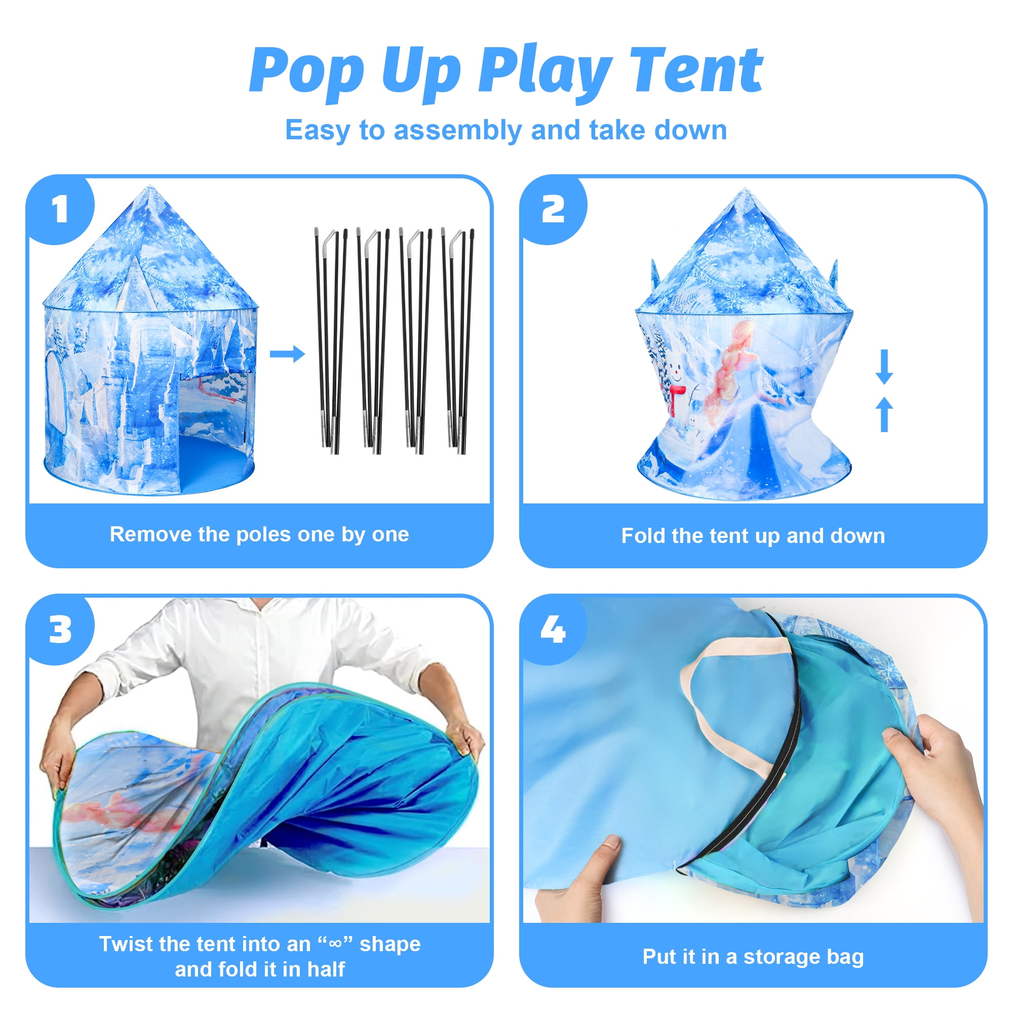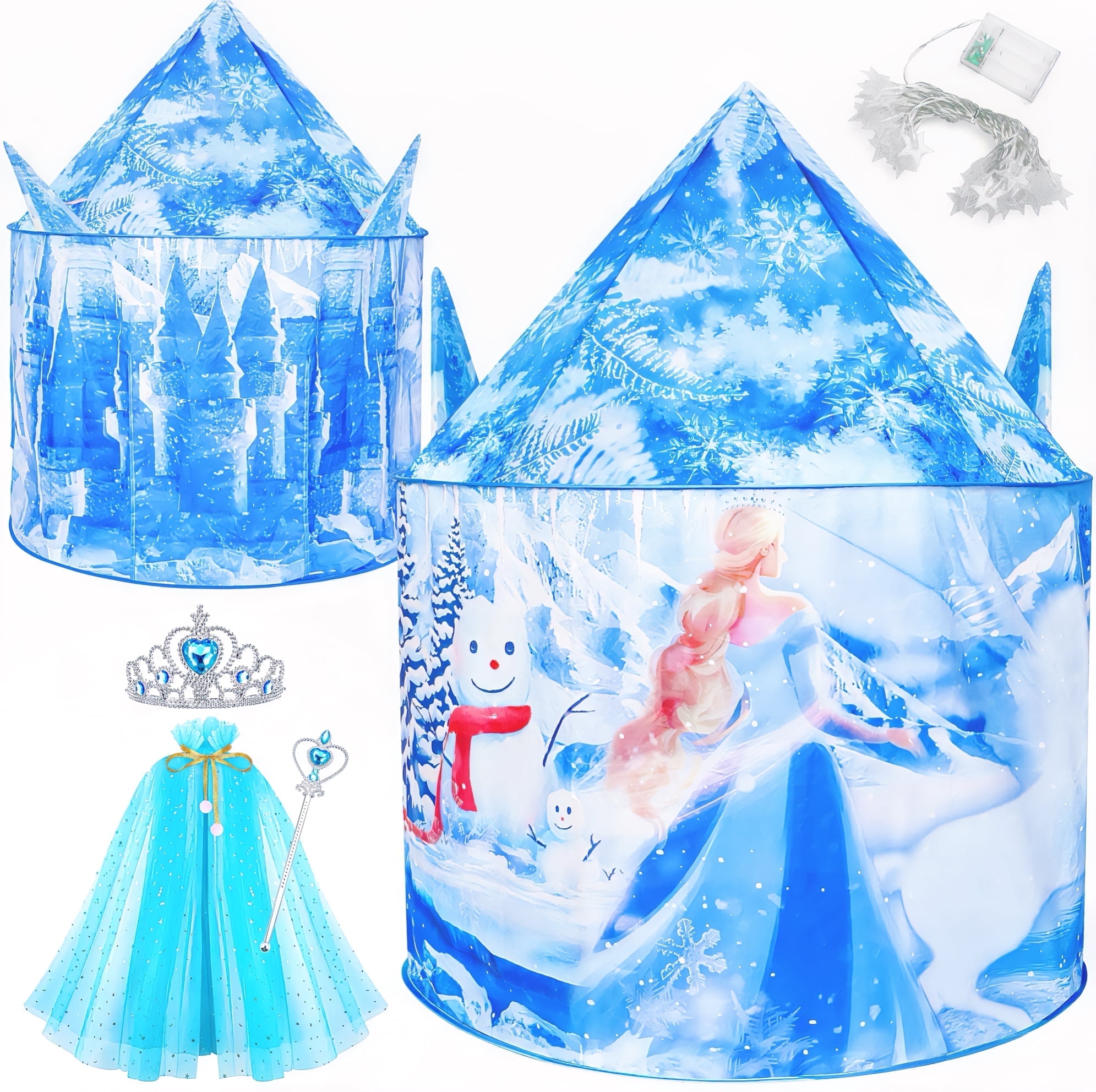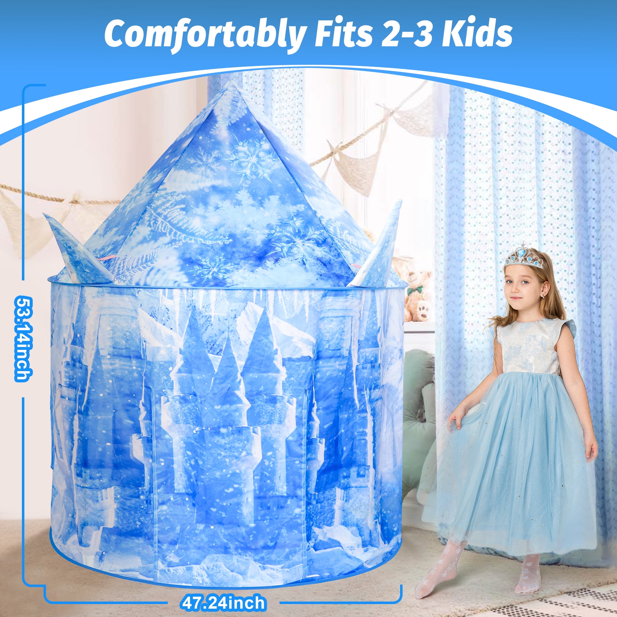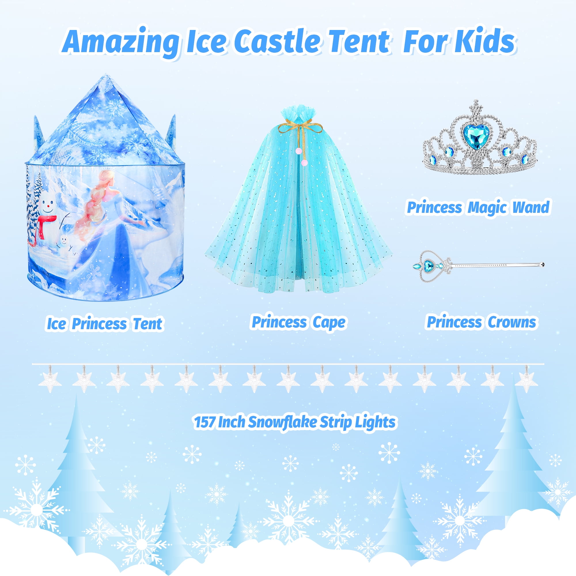 ❄️【Ice Princess Tent】Freecat Princess Tent comes with an ice castle tent, princess cape, magic wand, and crown, providing abundant princess accessories for your child to fully immerse in princess role-playing and explore a colorful magical world. ❄️【Spacious Frozen Tent】The kids play tent measures 42*53 inches and can accommodate 2-3 children. Your boys&girls can read and play inside with friends or family, creating joyful and wonderful moments! Children can also use the indoor tent as a game room. ❄️【Easy to Install 】Our tent is made of high-quality polyester fiber material, durable and easy to clean. The installation process only takes a few seconds: open the tent, insert the corresponding foot sleeve into the installation pole, fasten the rope, and you’re done! ☃️【100% Child Safety】Our tent has undergone strict testing, and all materials are 100% child-safe. Kids can play inside with peace of mind. Besides a breathable window, both adults and children can see each other and won’t feel bored inside! 🎅【The Most Desired Gift for Girls】Comes with a dreamy snowflake light string (batteries not included), which can be turned on at night. Girls can play inside to their heart’s content. With the snow light string, the frozen tent can create a cozy and magical space for your child. Give it as a Christmas gift to girls aged 3 4 5 6 7 8.