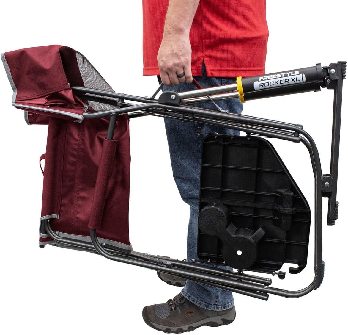 OUTDOOR LIVING. Great for relaxing by the campfire or sideline, the Freestyle Rocker XL with Side Table is an oversized adult rocking chair that’s easy to carry and foldable. Relax in comfort on your adventure with smooth rocking on any surface, anywhere. A FRONT ROW SEAT. Perfect for sports games or backyard lawn BBQ, this chair is ready for anything. With a higher and broader backrest for support and an attached side table, this heavy-duty chair lets you enjoy more time outside with family and friends. CUTTING-EDGE DESIGN. Rest easy, this chair uses shock absorbers with patented Spring Action Rocking Technology to gently rock on flat, hard or soft terrain. A tough steel frame holds up to 400 lbs, while durable mesh backing brings through airflow. SIMPLE SET UP. Recharge in no time with Eazy-Fold Technology. Simply grab the seat frame, push out, then down and you’re good to go. Packing up is just as quick — place your foot on the leg’s base and pull the closure handles up. TECH SPECS. 400 lbs Weight Capacity; Open Dimensions: 25.6″ Depth x 26.4″ Width x 34.8″ Height (Seat Height: 20″); Folded Dimensions: 25″ Depth x 4.9″ Width x 34.8″ Height; Chair Weight: 14.5 lbs.