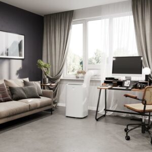 There is a fine line between form and function, and our Freonic Portable Air Conditioner is just that. This balance makes the air conditioner perfect for the modern homeowner with modern convenience in mind. Automatic louvers gently push air around the room, meaning once the unit is powered on, your work is done. Adaptive controls respond quickly to a simple touch and the unit’s soft glow shine through plastic LED displays the temperature without taking away from the polished look of the unit. With 3 cooling speeds and suitability for a room up to 300 sq. ft., the unit will make a noticeable difference within minutes of activation. To increase comfort even more, the unit comes with built-in bucketless dehumidification capabilities of removing up to 55 pints per day. Energy Saver mode is an option for when you’re out as the unit only circulates air when it senses a change in temperature instead of running continuously. The unit is also easily installed with included installation kit, an