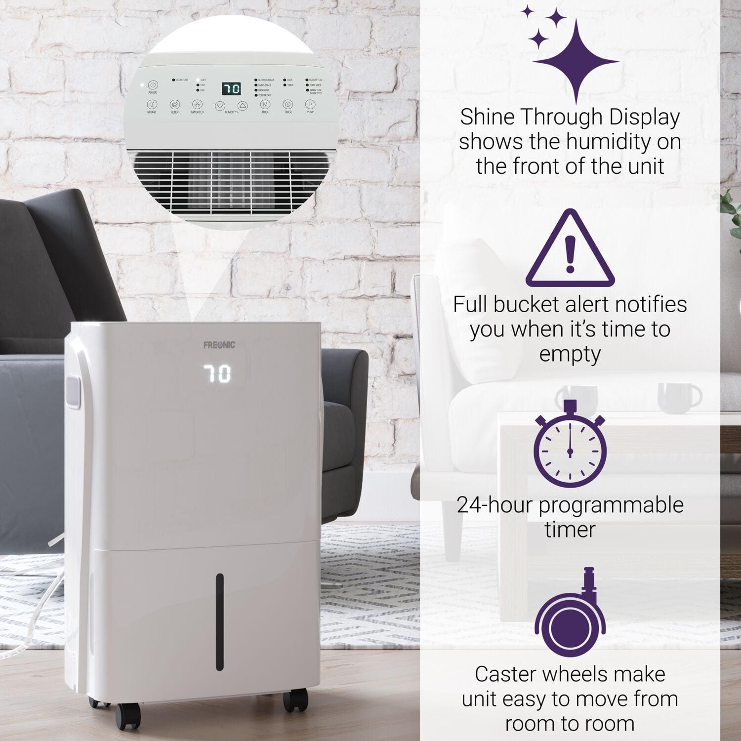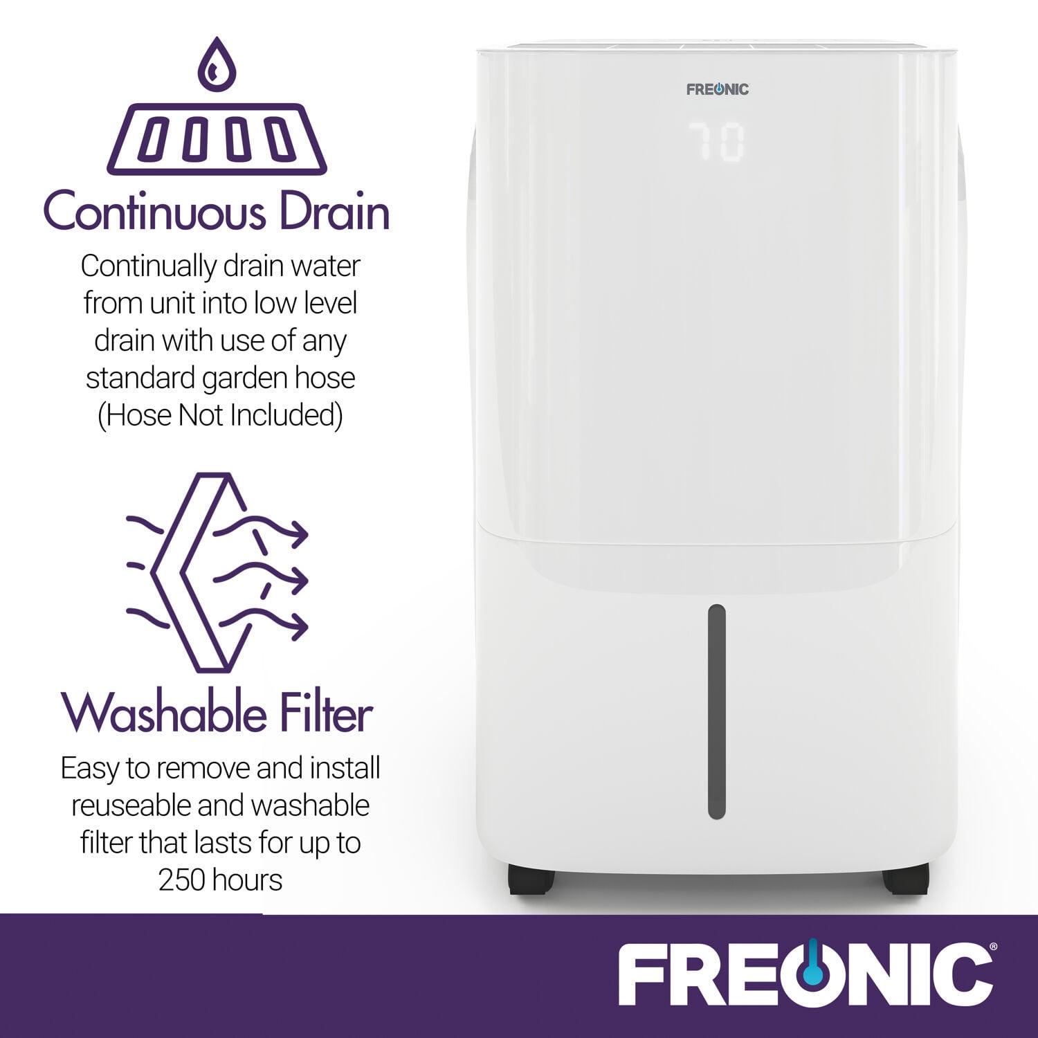 There is a fine line between form and function, and our Freonic dehumidifier is just that. This balance makes the dehumidifier perfect for the modern homeowner with modern convenience in mind. As the perfect solution for your attic, bedroom, basement, and more, this unit effectively removes household odors and excess moisture. It will make a noticeable difference within minutes of activation as the unit comes with dehumidification capabilities of removing up to 35 pints per day. The 8.5-pint bucket will notify you when it s time to empty with the bucket full alarm. The easy-carry handle bucket makes emptying easy, but you can also choose to use the built-in continuous draining option into any low-level drain with a standard garden hose (hose not included). Equipped with 4 durable caster wheels for simple movement, you ll have no trouble moving your unit throughout your home as you see fit. Designed with a removeable filter with a clean-filter alert, the unit prioritizes convenience and allows you to always get the most out of your Freonic dehumidifier. An included 1-year warranty inspires peace of mind so you’ll know you can count on your unit for many seasons to come.