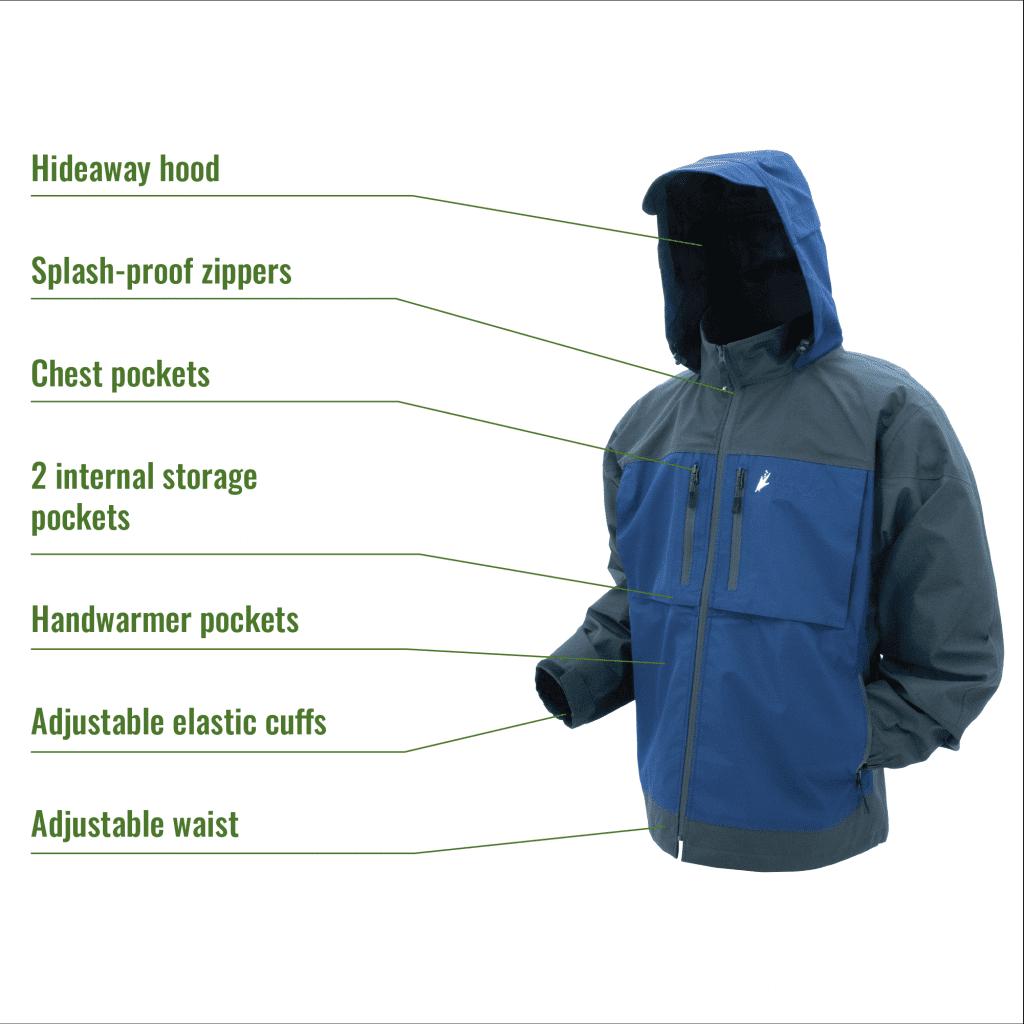 The Frogg Toggs Anura HD Jacket is a rain jacket with an adjustable, 3-piece hideaway hood with visor with E-Z Push cord locks. The splash-proof front zipper helps to keep moisture out. The shock cord/barrel lock adjustable waist and elastic cuff with hook-and-loop adjustment allows the wearer to achieve a customized fit. The Zippered chest/handwarmer pockets and 2 internal storage pockets provide ample storage for outdoor essentials. This water-resistant jacket is perfect for wet, rainy days.