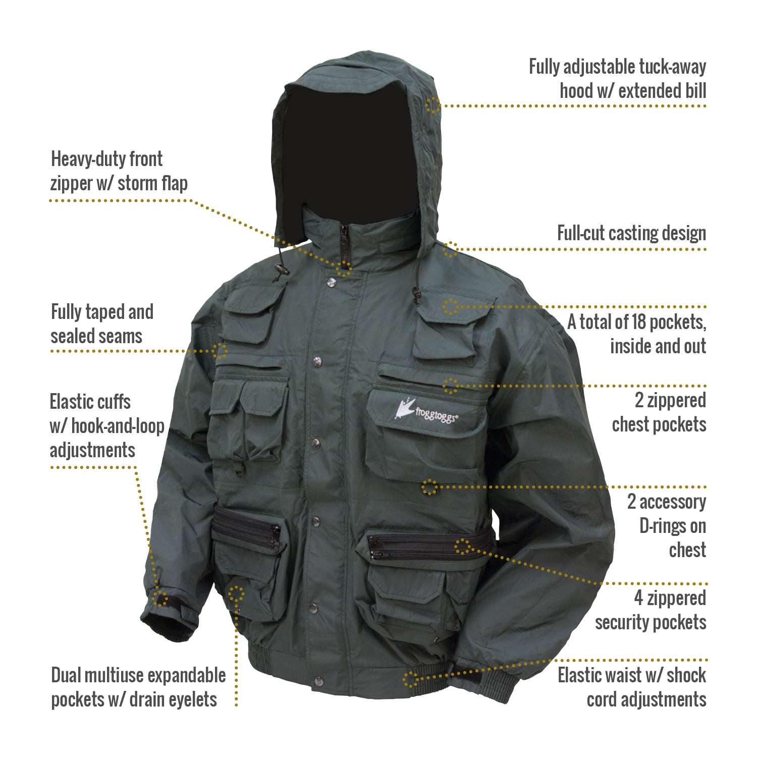 The Frogg Toggs Men’s Cascades Sportsman s Pack Jacket is a fisherman s best friend! The jacket features a DriPore Gen 2 technology construction and fully taped seams to keep you dry and comfortable. It also has a heavy duty front zipper with storm flap. The adjustable elastic wrist cuffs and adjustable shock cord waistband create a customized fit. The jacket sports a fully adjustable tuck-away hood with extended bill and 18 pockets scattered inside and out for ample storage. A fold away rod holder and two accessory d-rings on the chest make this jacket perfect for a long day of fishing.