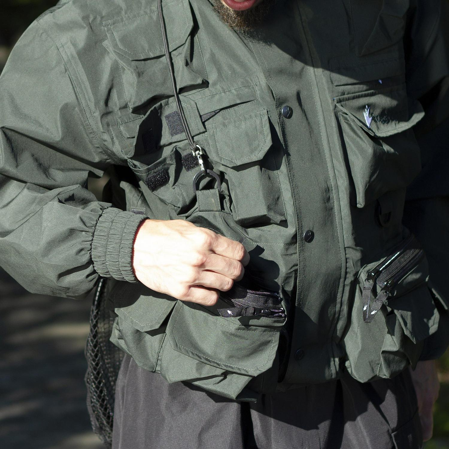 - 18 pockets inside and out and fold away rod holder make the jacket perfect for a long day fishing