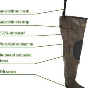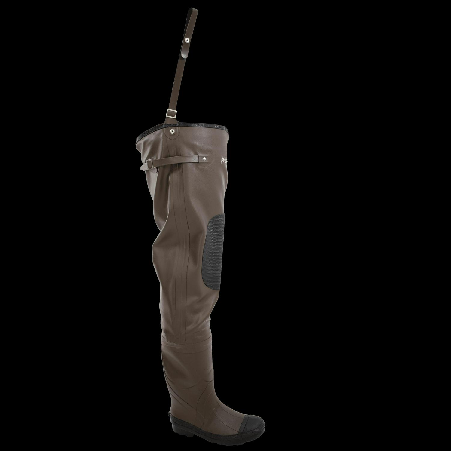 The Frogg Toggs Men’s Classic II Hip Boot features a vulcanized, natural rubber upper and boots. Contoured leg openings and adjustable belt leashes with snaps provide a secure fit and easy on/off. Boots feature foam cushioning, wool felt midsole, steel shank, hard toe cap and heel kicker to protect feet. The cleated outsole provides reliable traction. Available in brown in men’s size 7 through 14.