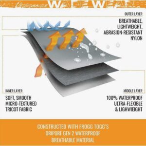 The Frogg Toggs Men’s Hellbender Stockingfoot Guide Pant features a 4-ply nylon upper and double reinforced knees. The wader’s adjustable belt with locking quick-release buckle and daisy-chain accessory loops ensure a comfortable and secure fit. The oversized multifunction chest pocket, zippered handwarmer/storage pockets, and horizontal zippered storage pocket provide ample storage for accessories and essentials. The attached, gravel guards with nonslip rubberized elastic openings are included for added protection.