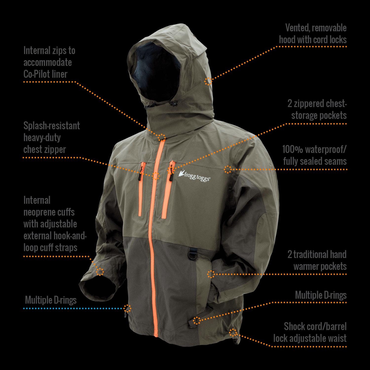 Pilot II guide DriPore Gen 2 waterproof fabric with > 15,000mm waterproof and >10,000 mvtr breathability. Fully taped and sealed seams. Features: vented, removable hood. Internal adjustable wrist gaskets. Beefy #8 chest zipper. New, insulated liner retention system (co-pilot insulated puff jacket and vest liner sold separately). new, larger internal dry-storage pocket. Teflon DWR coating. Multiple accessory D-rings. E-z push hood and hem cord locks. Zippered, external chest storage and hand-warmer pockets. model: Pf63161.