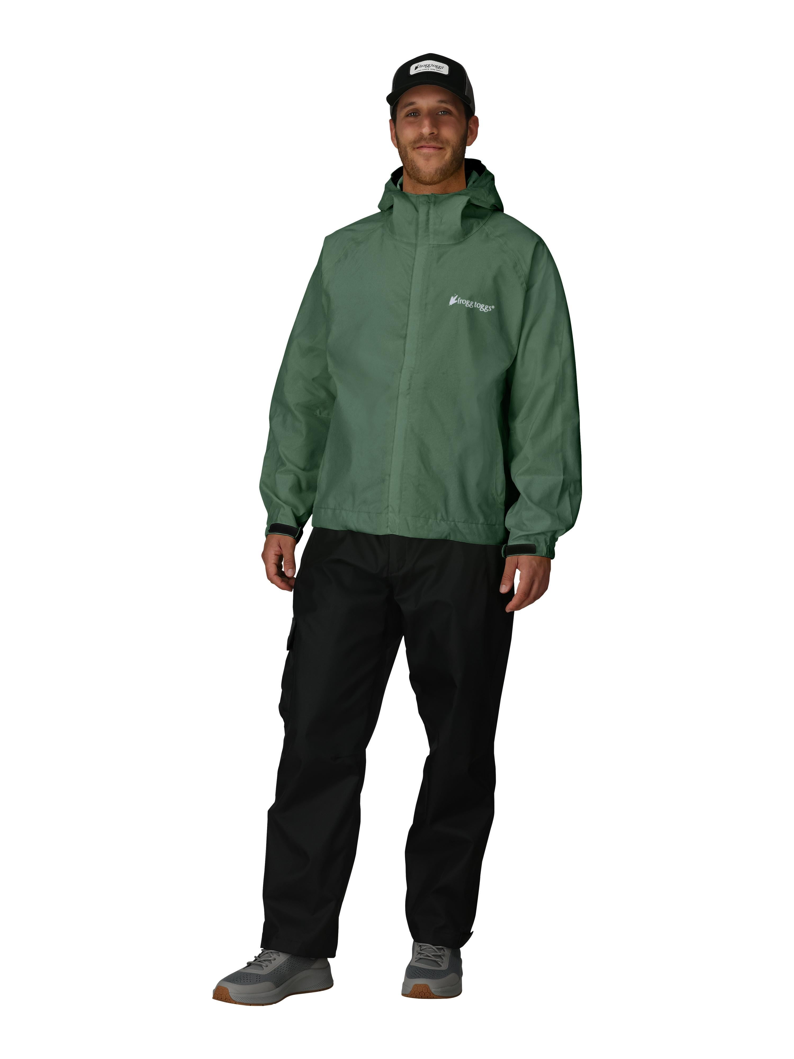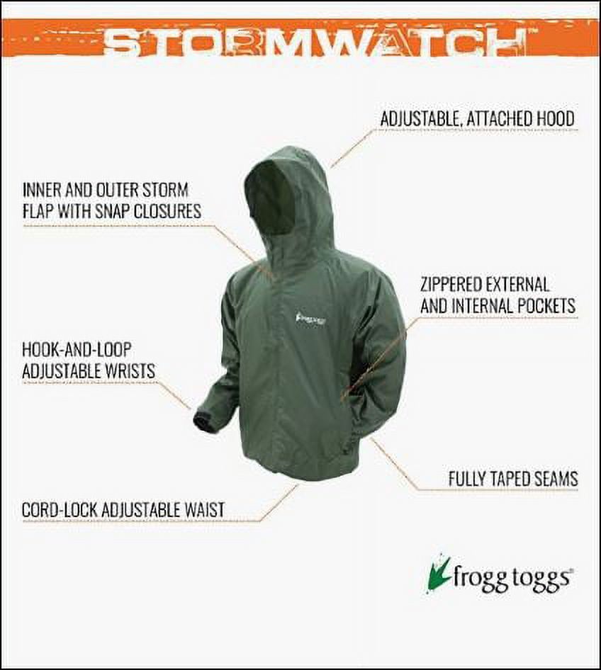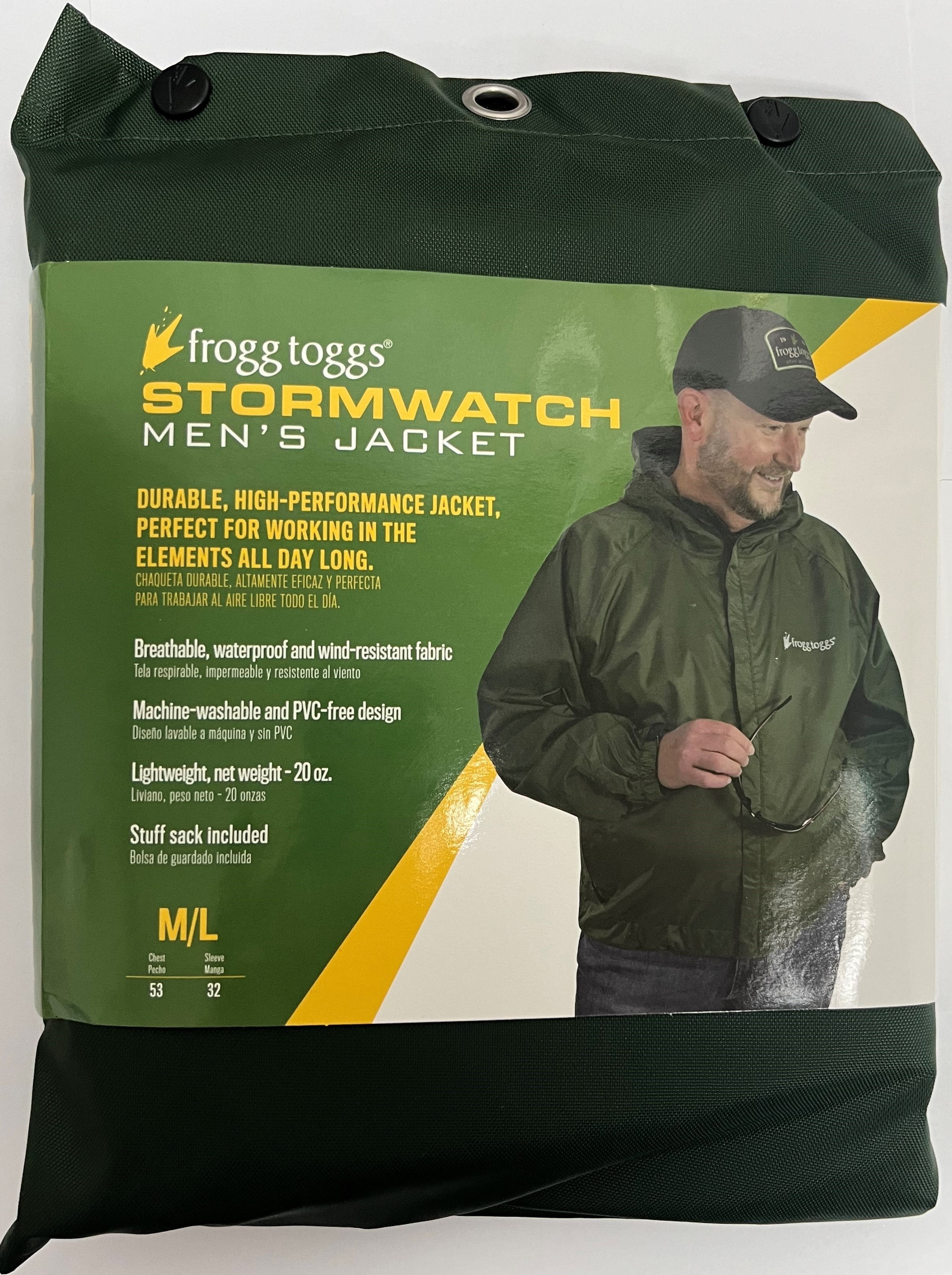 Frogg Toggs Stormwatch Rain Jacket with Set-in Sleeves (Men/Male) Made with Frogg Toggs’ signature 100% waterproof nylon and dri-pore gen 2 fabric blend 420 denier nylon outer shell with dri-pore 2 inner layer for protection, comfort, and breathability Adjustable, attached hood to keep your head and hair dry and protected Full zipper closure with added inner and outer storm flap and snap closures to help keep moisture out and keep you dry Zippered external and internal pockets that provide ample storage for all of your essentials Hook and loop adjustable wrists for secure fit Cord lock adjustable waist to help wearer achieve the perfect fit Made for durability and function 8,000 mm waterproof rating; 3,000 MVTR breathability rating; windproof Hand wash only; hang to dry One year manufacturer’s warranty Available in green and men’s sizes MD/LG and XL/2X Perfect for fishing, boating, hiking, sporting events, site seeing, and all of your favorite outdoor activities Since 1996- frogg toggs has endeavored to provide the world’s best rainwear, waders, cooling products, footwear and accessories at the best possible prices