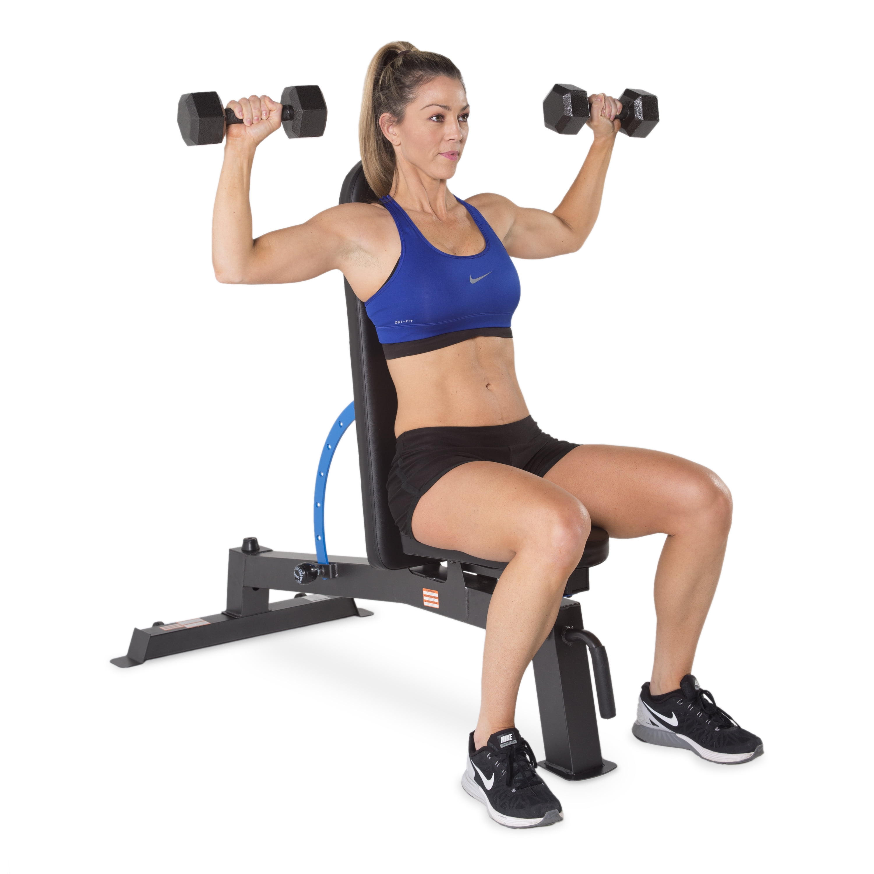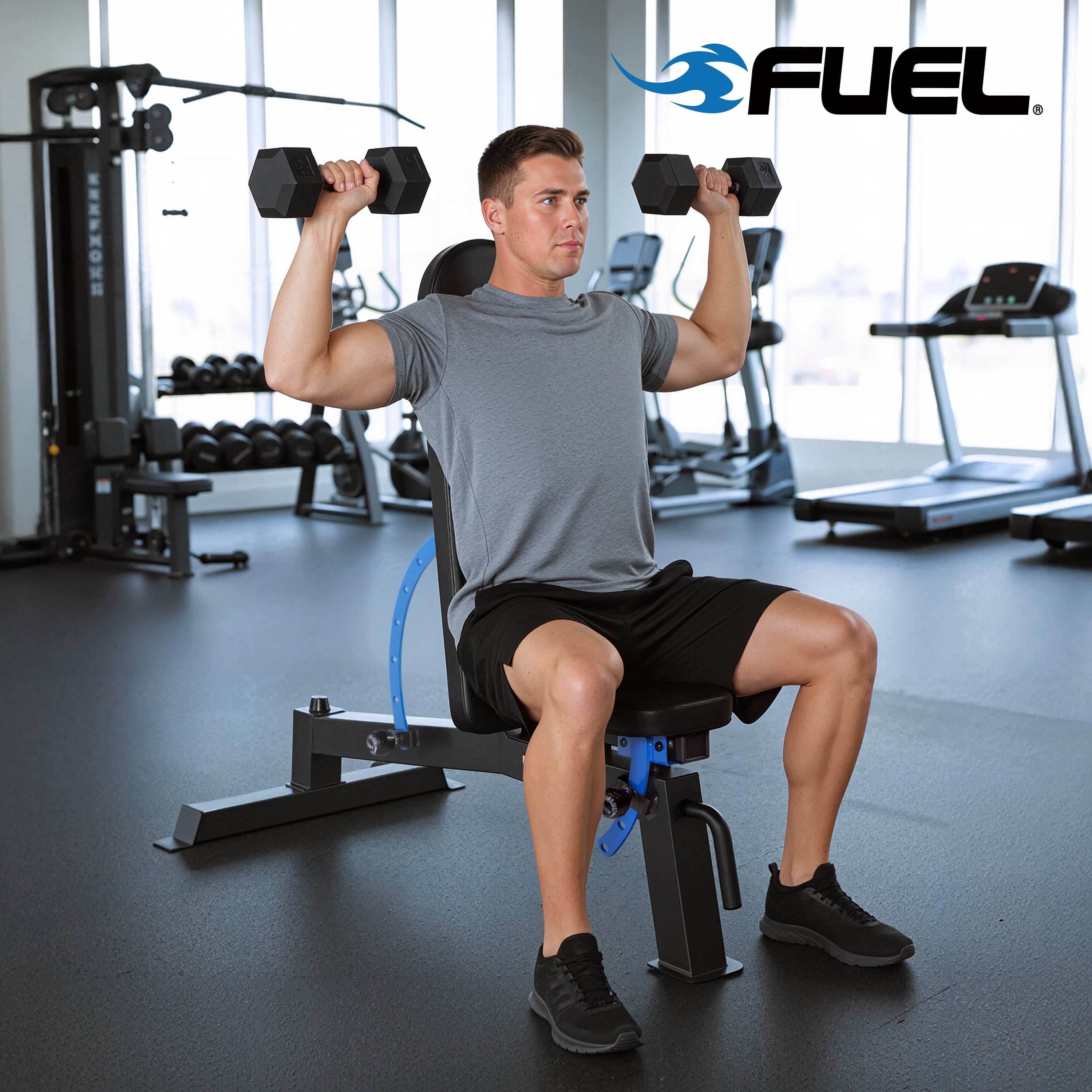 Fuel Pureformance FID Bench: 6-position back pad and 3-position seat pad offer versatility in exercises powder-finish to prevent rust Transportation wheels offer easy storage and mobility Ideal for use in home gyms Multiple positions allow you to target a wide range of muscle groups Attractive appearance with a gun metal gray base and striking blue accents Over-sized piping and generous padding Maximum weight capacity of 500-pounds