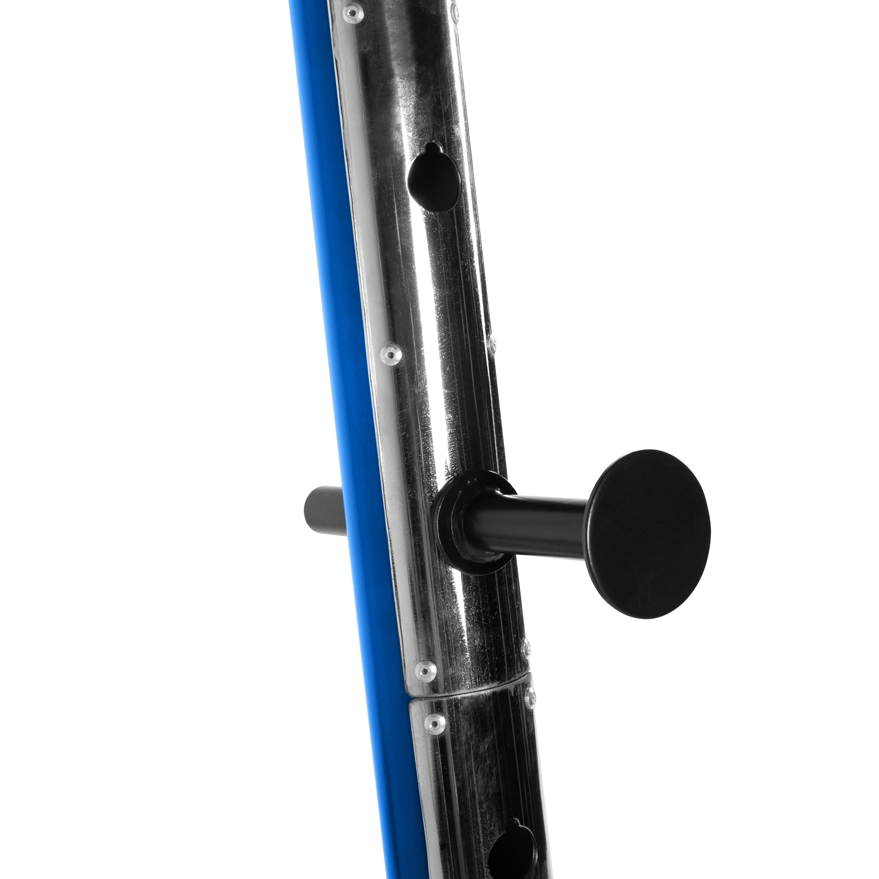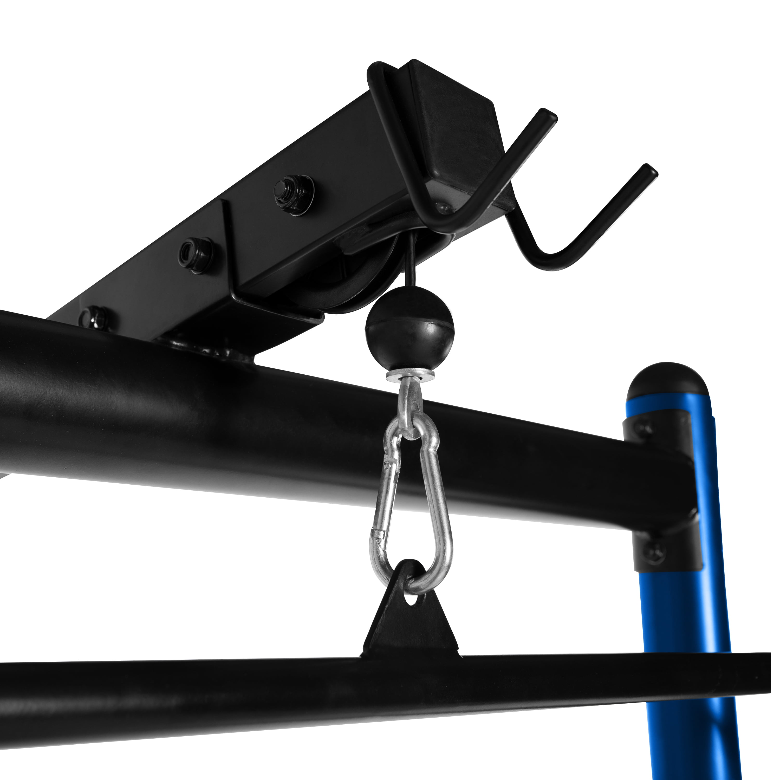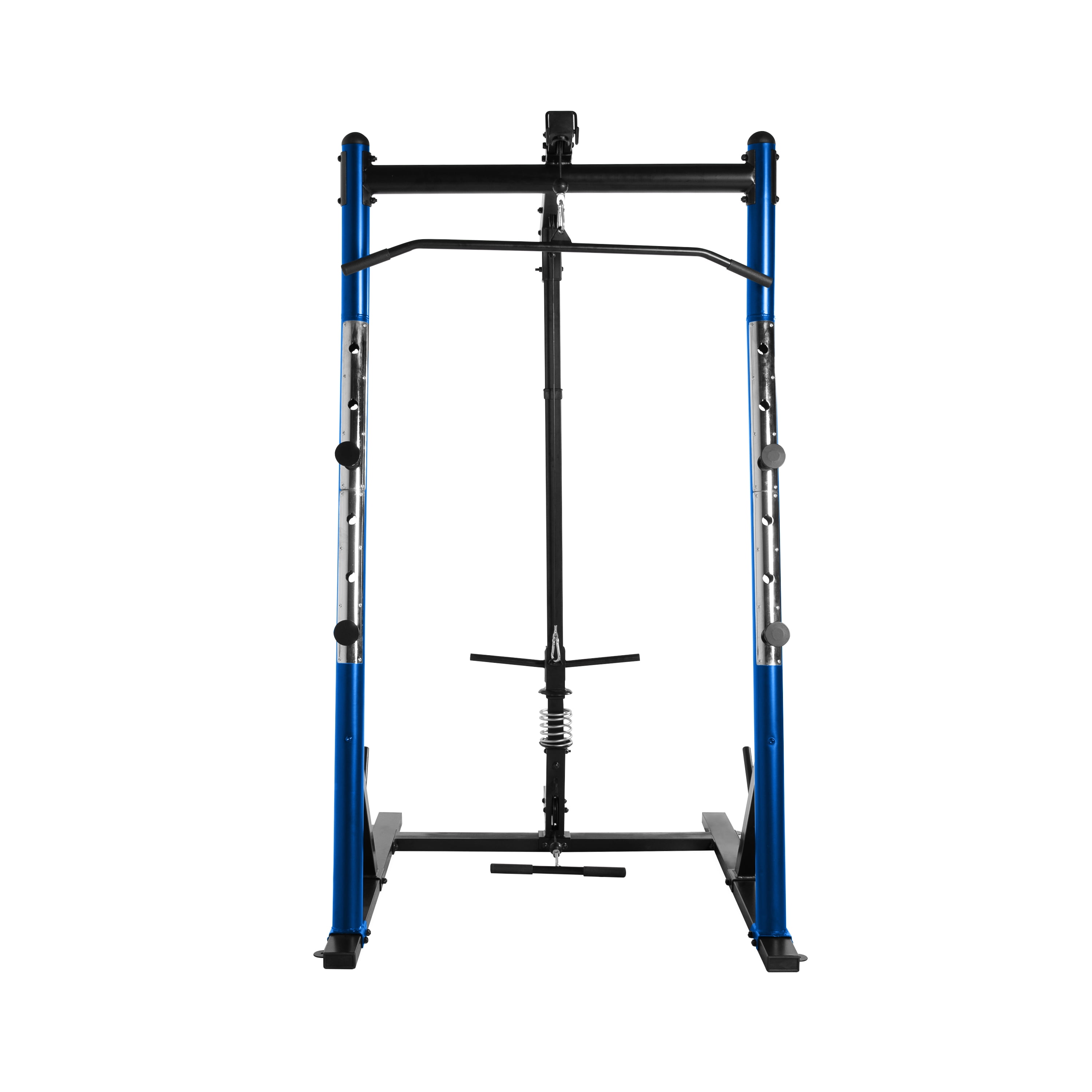 Steel tubing provides a sturdy and tough power cage Six safety catch height adjustments provide a custom workout Four solid cold rolled steel catches safely hold barbell and offer versatility in strength training routine Upper and lower lat/low row pulley system to build upper body strength Target the upper body and lower body with the multiple features of this cage Two plate storage posts that hold standard OR Olympic weight plates Durable blue powder-coat finish to withstand wear and tear Recommended max weight capacity for bar catches is 500 lbs, 300 lbs for the lat pull and low row attachment & 325 lbs for each plate post Assembled dimensions are 53” Wide x 46” Deep x 84” High